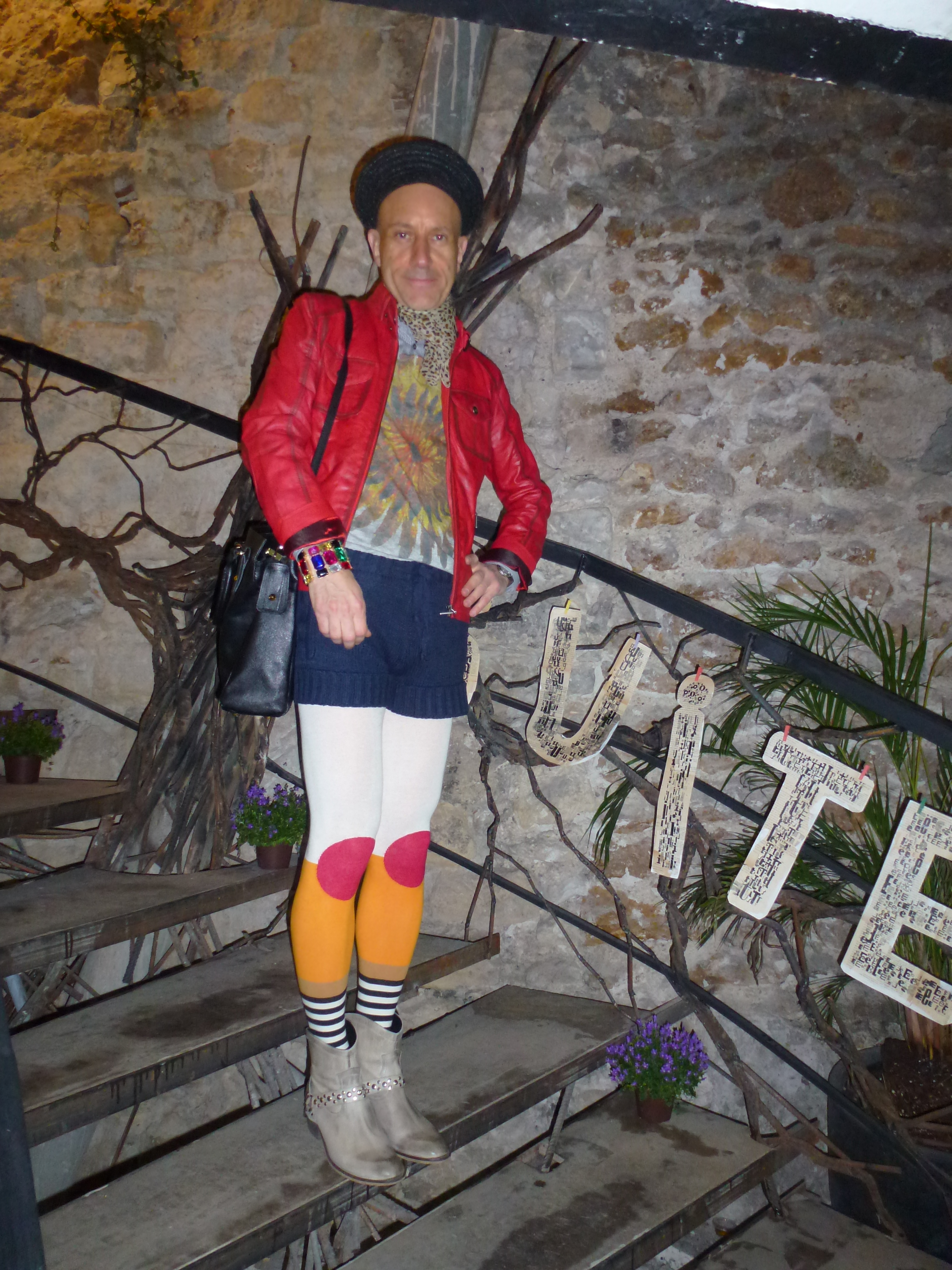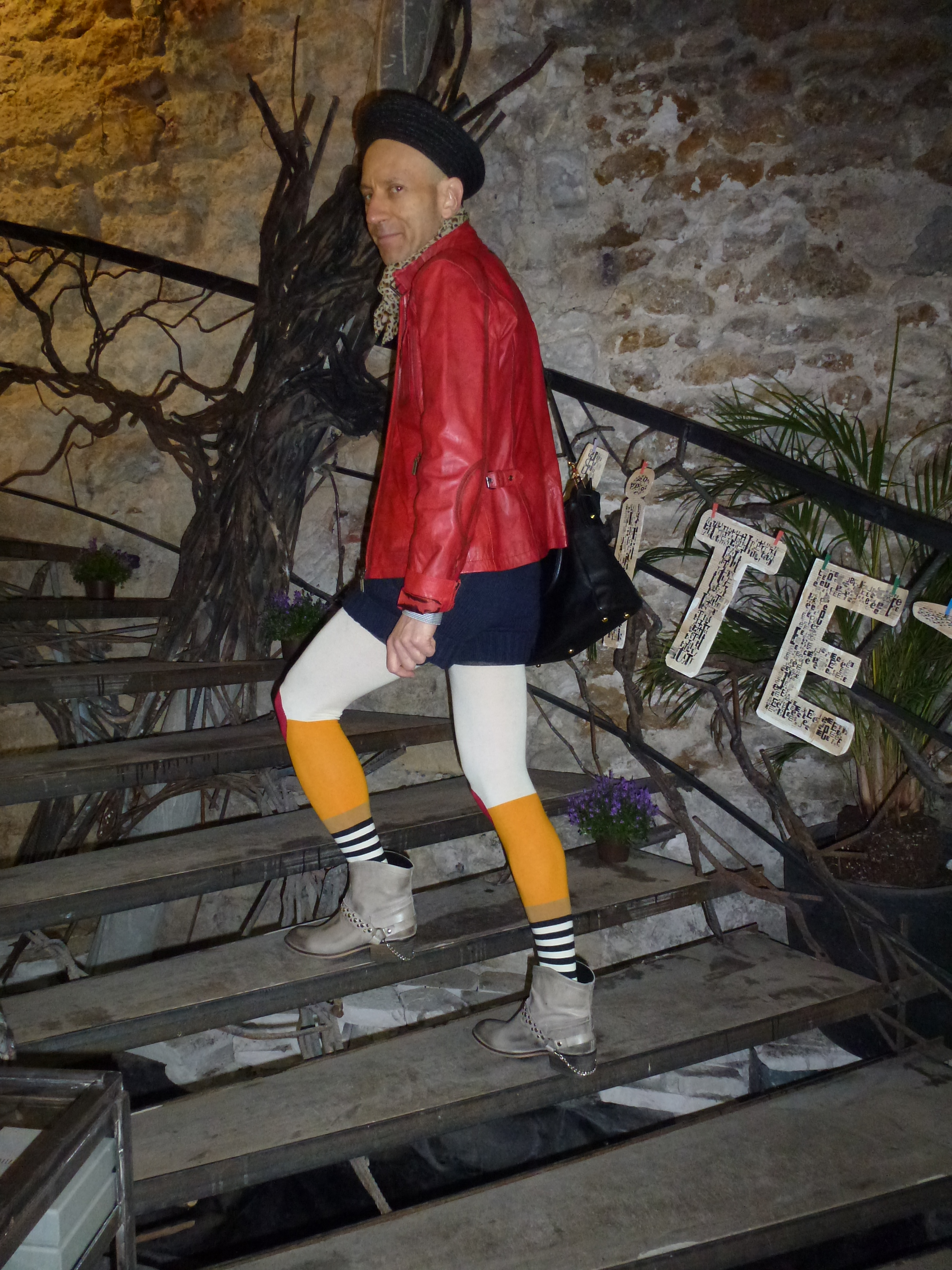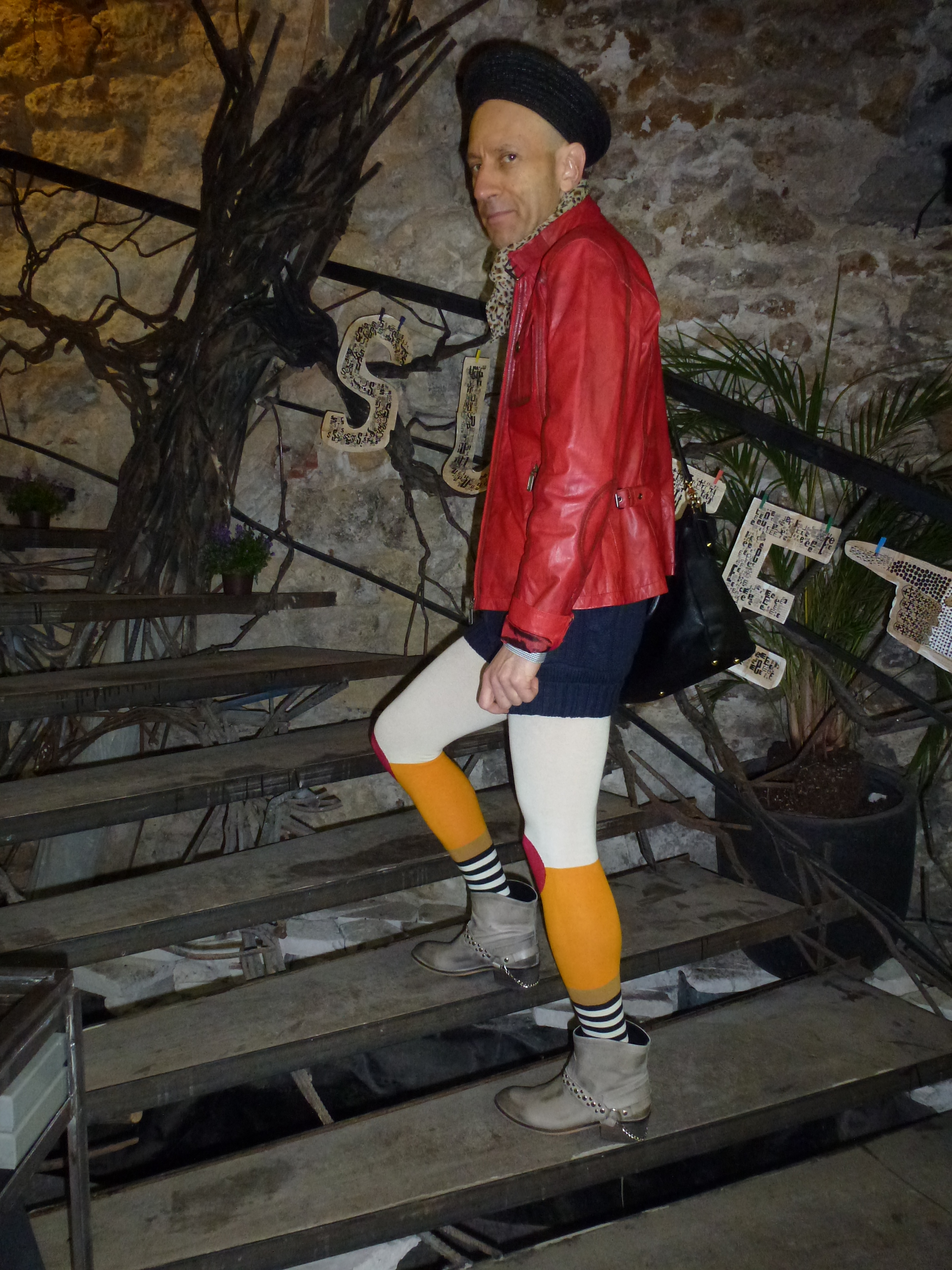 A l’exception de la veste en cuir (Ventiuno), tout ce que je porte a été acheté dans le Marais: chapeau, Warene Créations Paris; foulard vintage, magasin Les Georgettes; pull et short, magasin Dileme; collant de créateur, acheté chez RA Paris; boots: Les Petites Parisiennes.