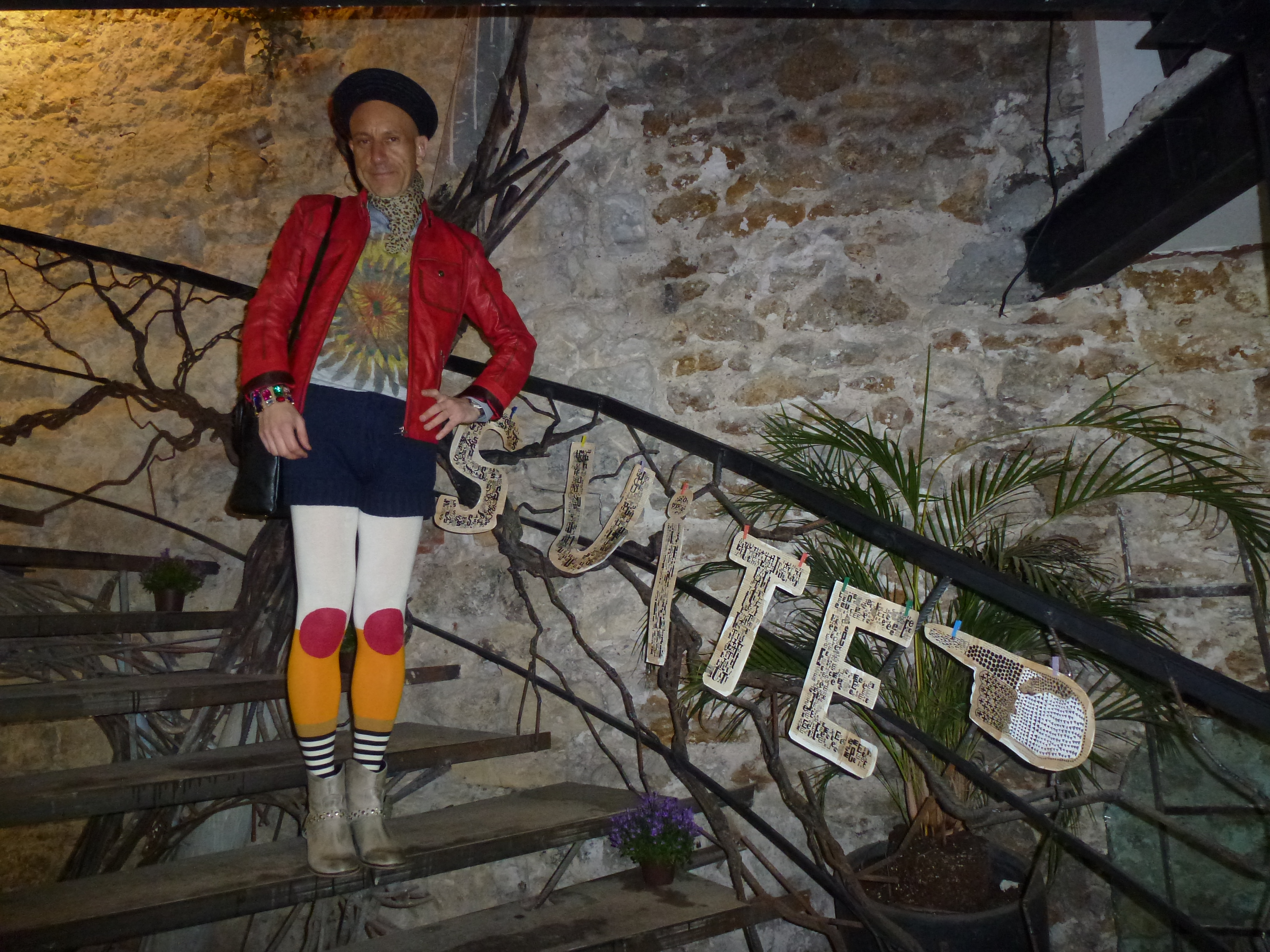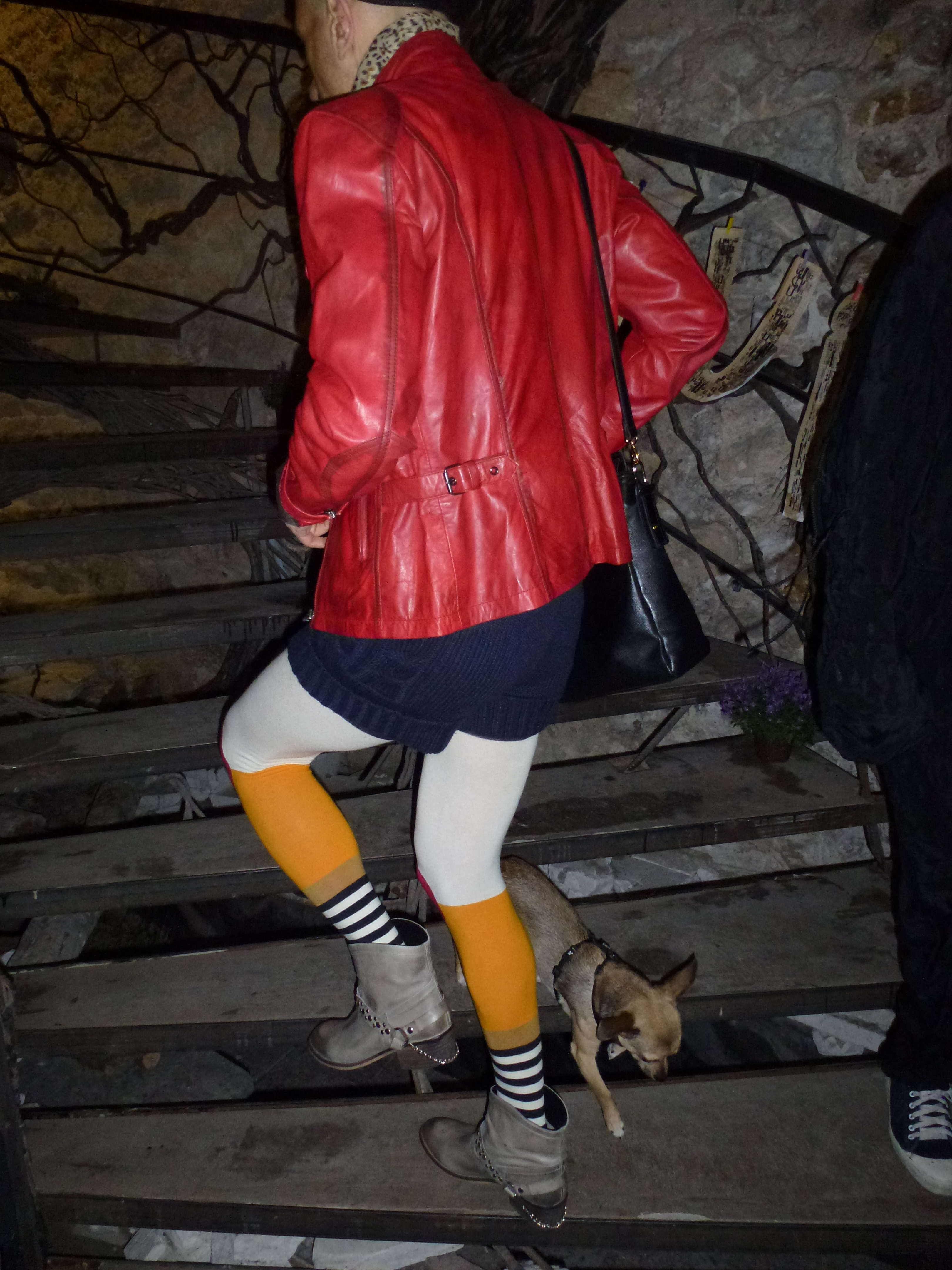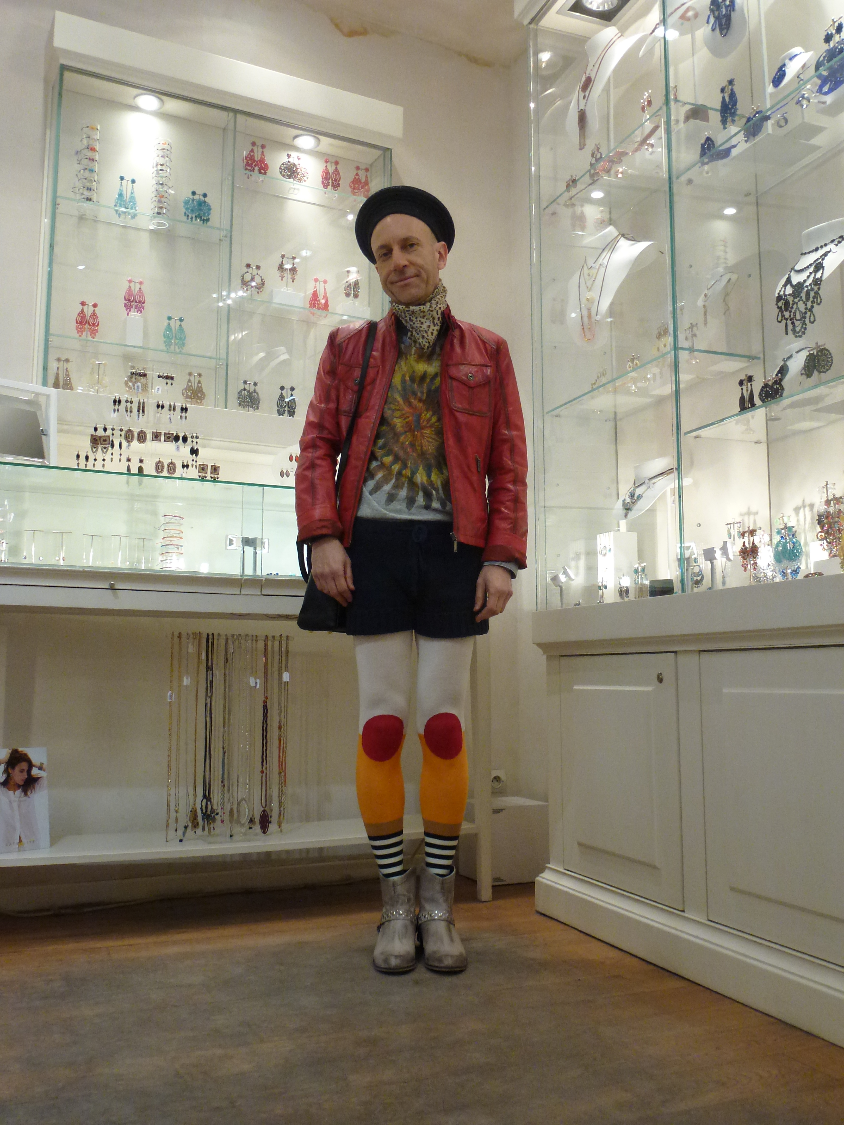 A l’exception de la veste en cuir (Ventiuno), tout ce que je porte a été acheté dans le Marais: chapeau, Warene Créations Paris; foulard vintage, magasin Les Georgettes; pull et short, magasin Dileme; collant de créateur, acheté chez RA Paris; boots: Les Petites Parisiennes.