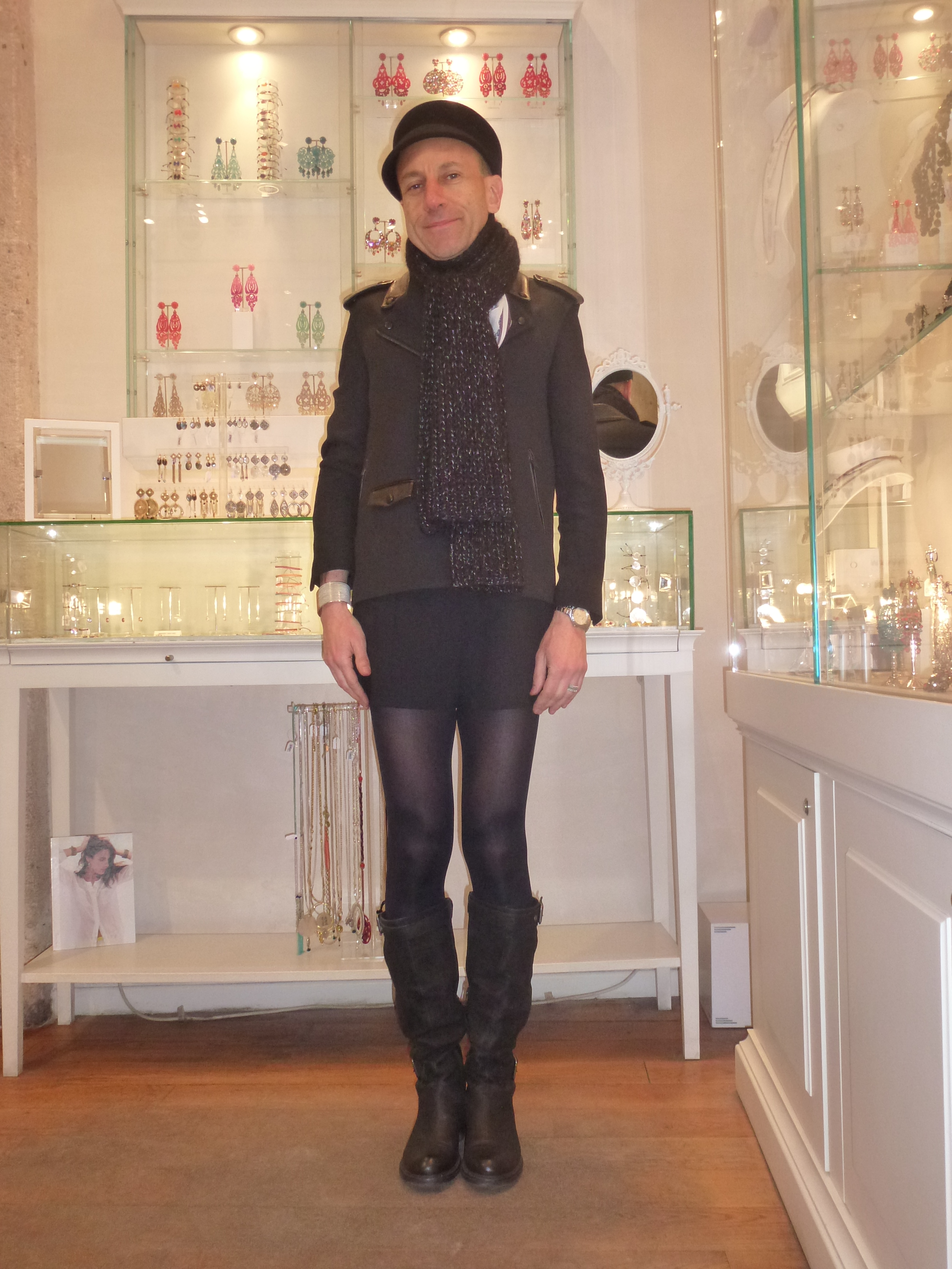 veste: Les petites; sur-veste (sans manches et avec empiècements en cuir): Sandro; short, foulard et écharpe: Sandro; chapeau: BGN; bottes: Minelli; manchette argentée: Clara Jasmine Bijoux; non visibles sur la photo: chemise en soie blanche et ceinture métallique argentée: Sandro.