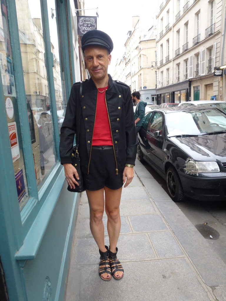 En cette période de mi-saison où l’on peut encore montrer ses gambettes toutes bronzées, je vous propose un look en rouge et noir (une des tendances fortes de cette rentrée), agrémenté de petits détails en doré: veste Ysterike; top rouge sans manches: BGN; short bi-matière: Sandro; casquette: Les Canotiers du Marais; chaussures: Les Petites Parisiennes; collier: Soude Booth; sac: vintage.