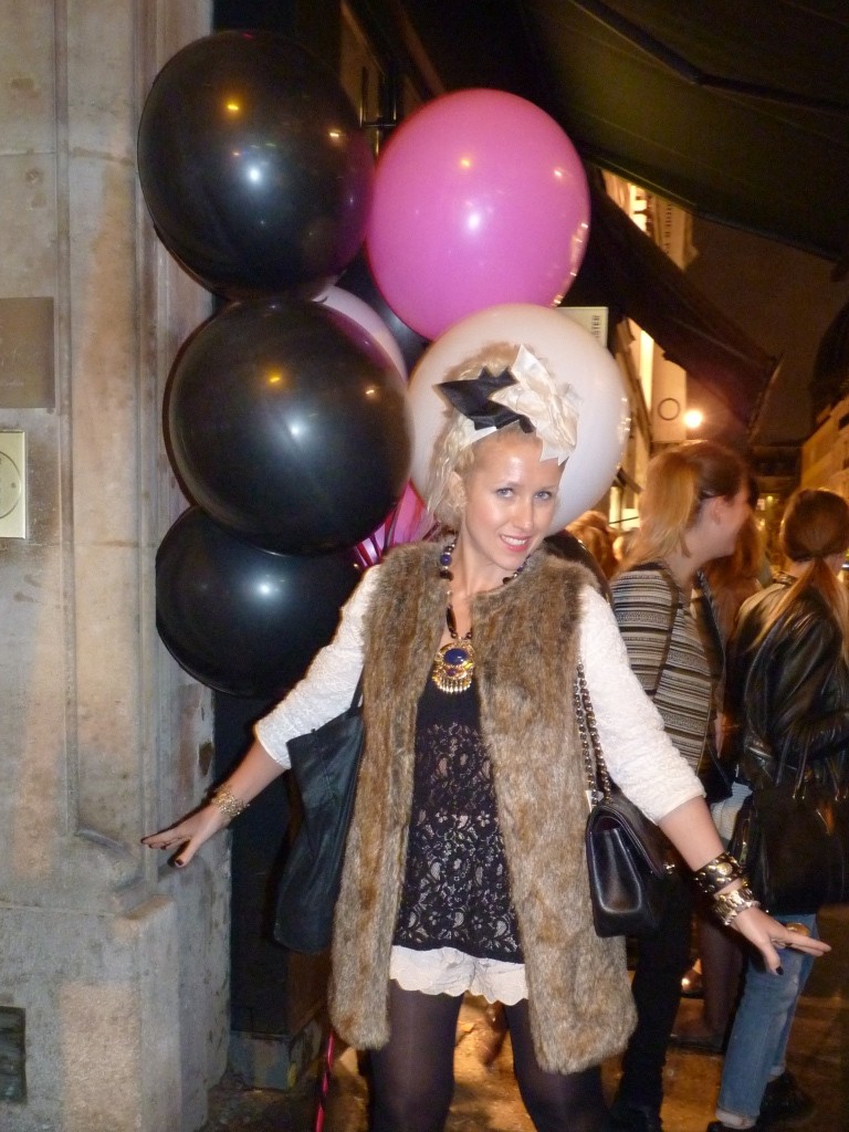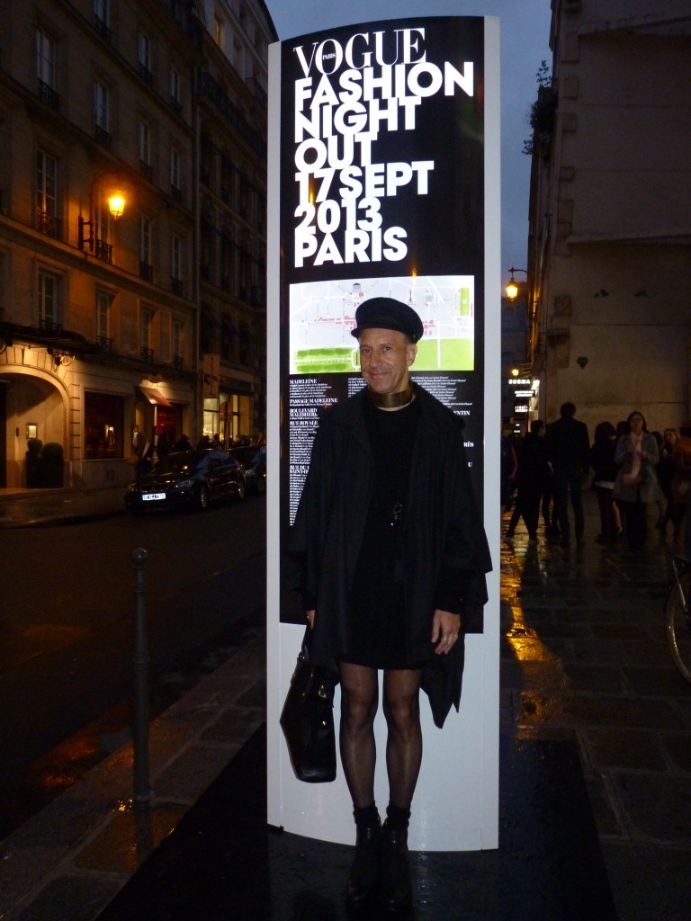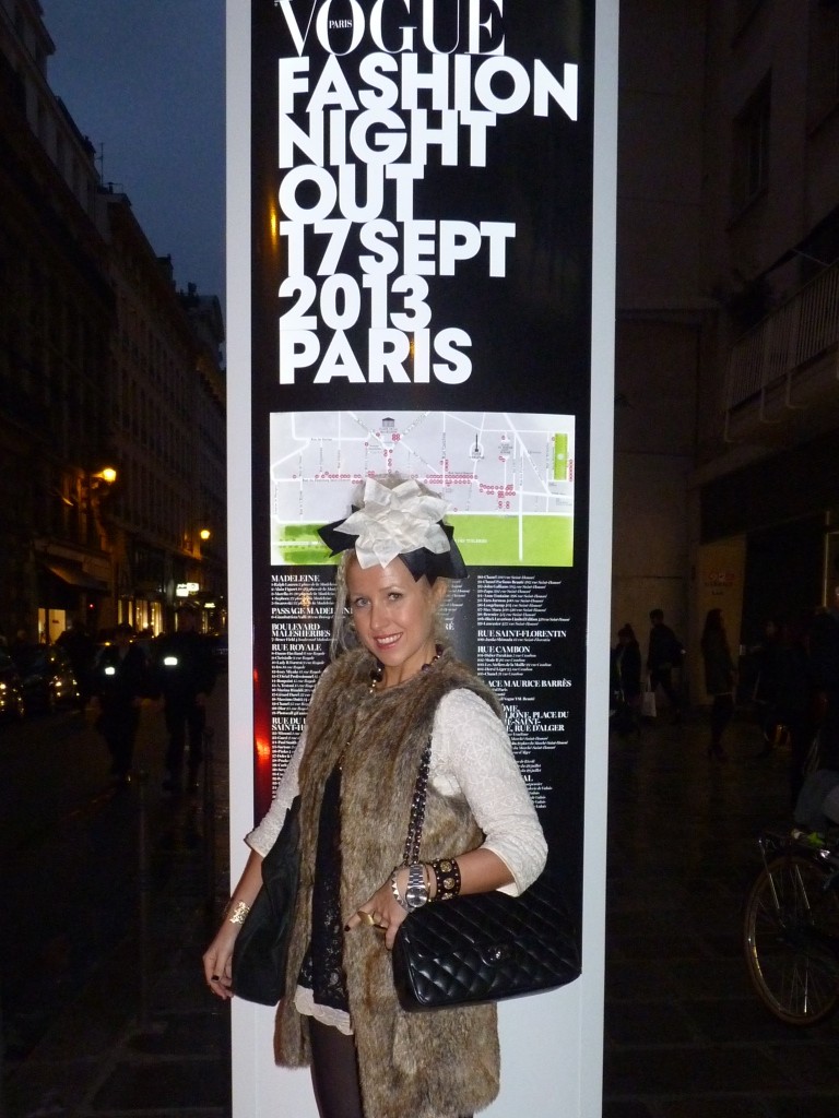 Ce mardi 17 septembre, c’était l’édition 2013 de la Vogue Fashion Night Out à Paris. Dans le cadre de cet événement organisé par le magazine Vogue, un grand nombre de boutiques des rues Saint Honoré, du Faubourg Saint Honoré et des rues adjacentes proposent des animations et, pour certaines d’entre elles, des articles spécialement créés à cette occasion. Cette année encore, l’ambiance y était très festive et ce fut un très agréable moment pour tous les passionnés de mode. Voici une petite sélection de mes meilleures photos. Je portais moi-même une tenue spécialement conçue pour l’occasion, avec notamment plusieurs pièces de créateur de chez Baron Y (pull/robe, pendentif et masque tous trois avec des cristaux Swarovski incrustés). Vous pourrez aussi admirer la tenue de ma complice de la soirée, mon amie Marie, ravissante, chic-issime, la plus belle de toutes!!!