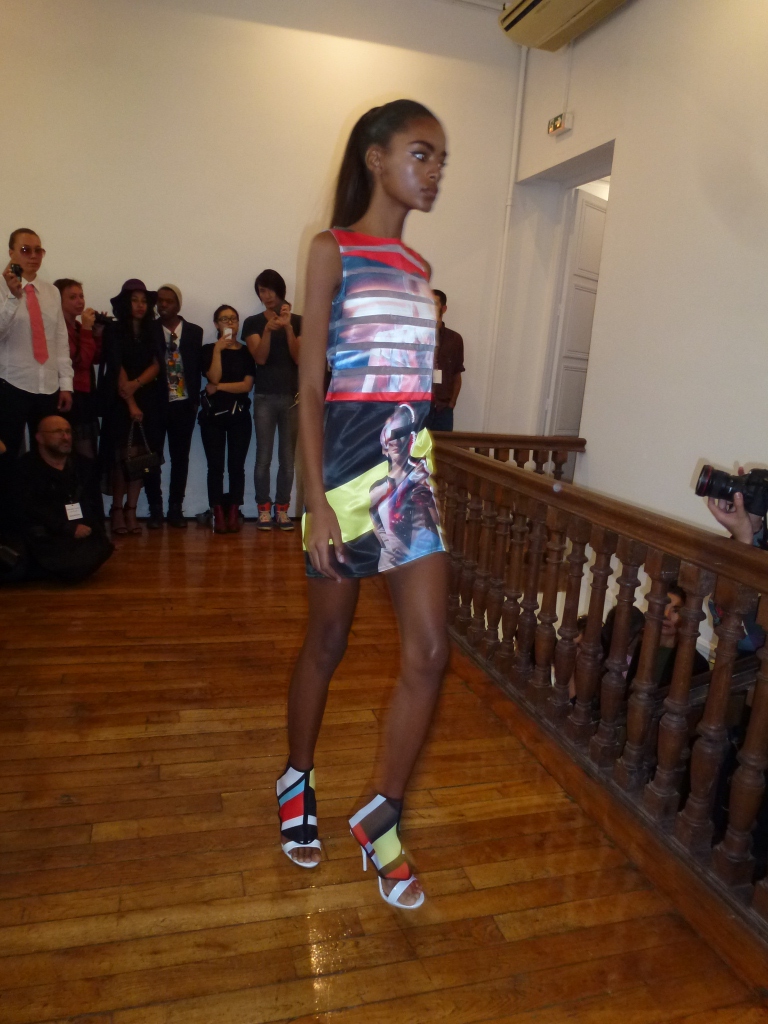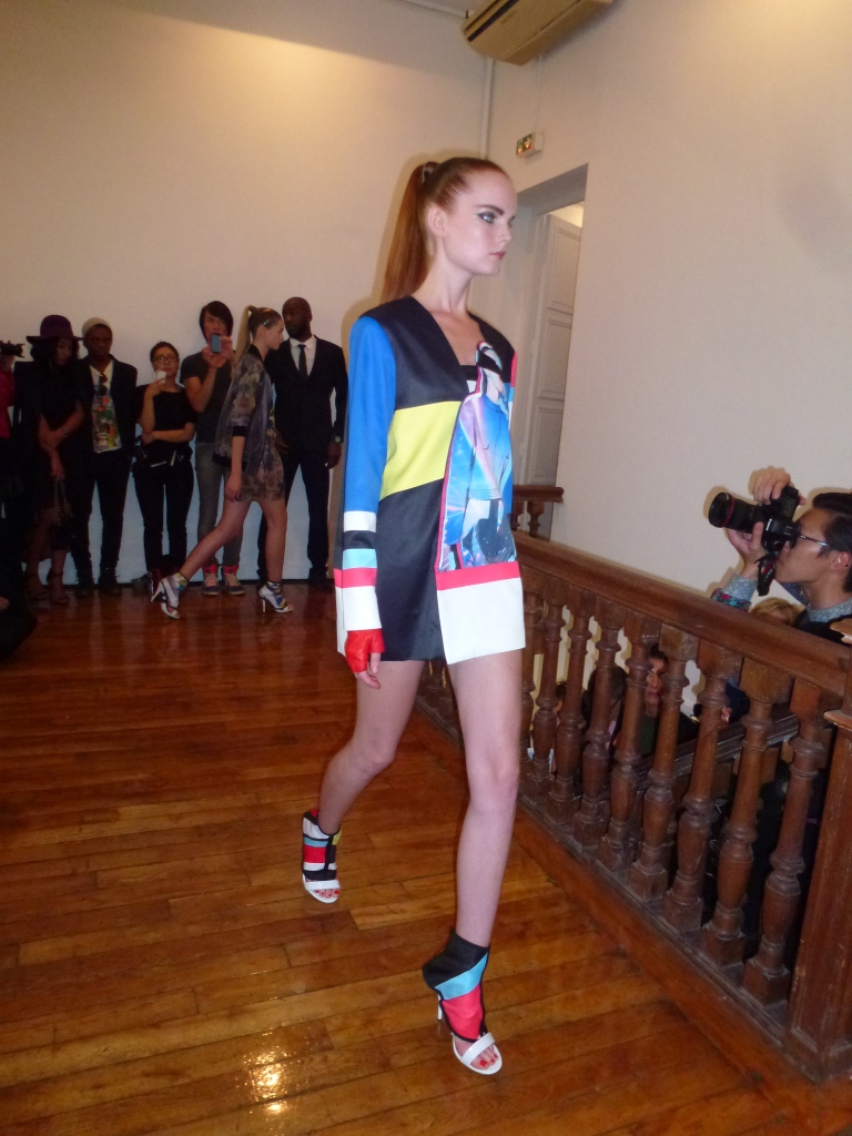 Parmi tous les défilés de cette dernière Fashion Week parisienne auxquels j’ai assisté, celui de Ground Zero a été assurément l’un de mes préférés. J’ai été fasciné par le côté très avant-gardiste de cette marque. On y trouve de la couleur à profusion, des imprimés forts et très recherchés, des coupes futuristes, souvent asymétriques, qui couvrent ou découvrent le corps selon les vêtements, de la transparence, des matériaux high tech (néoprène notamment) qui se combinent admirablement avec des tissus plus légers comme l’organza et la soie. Le tout confère à la collection un grand dynamisme et une forte originalité. Bravo aux frères Eri et Philip Chu, créateurs de la marque, que j’ai pu rencontrer après le défilé, pour cette magnifique collection!
