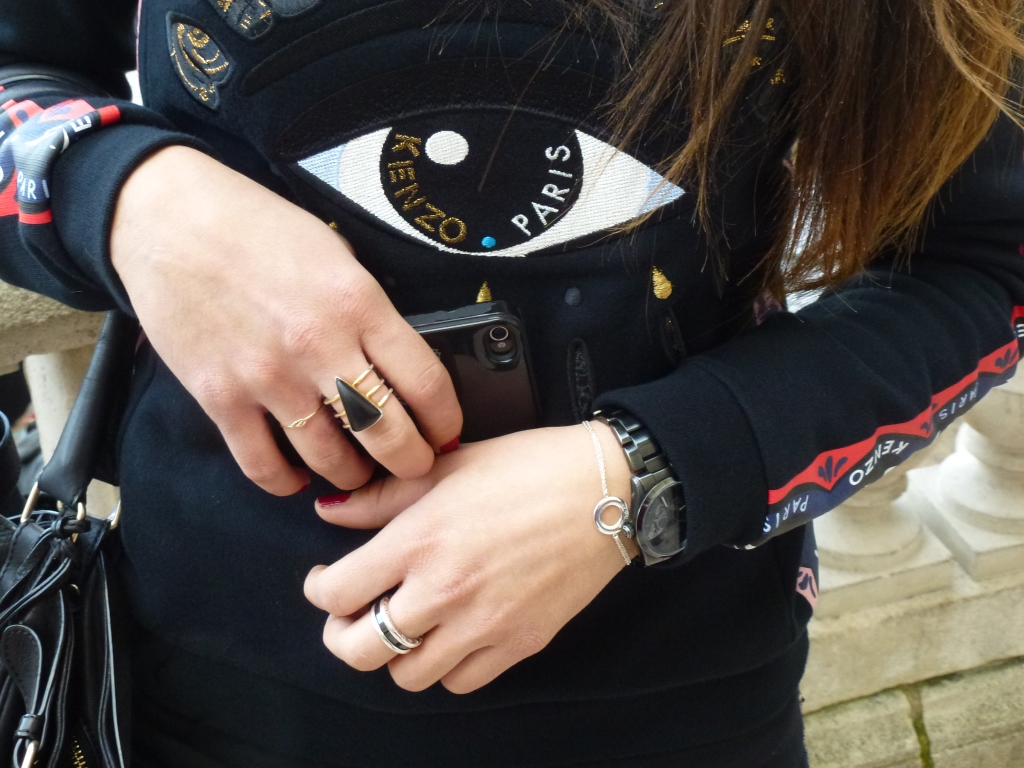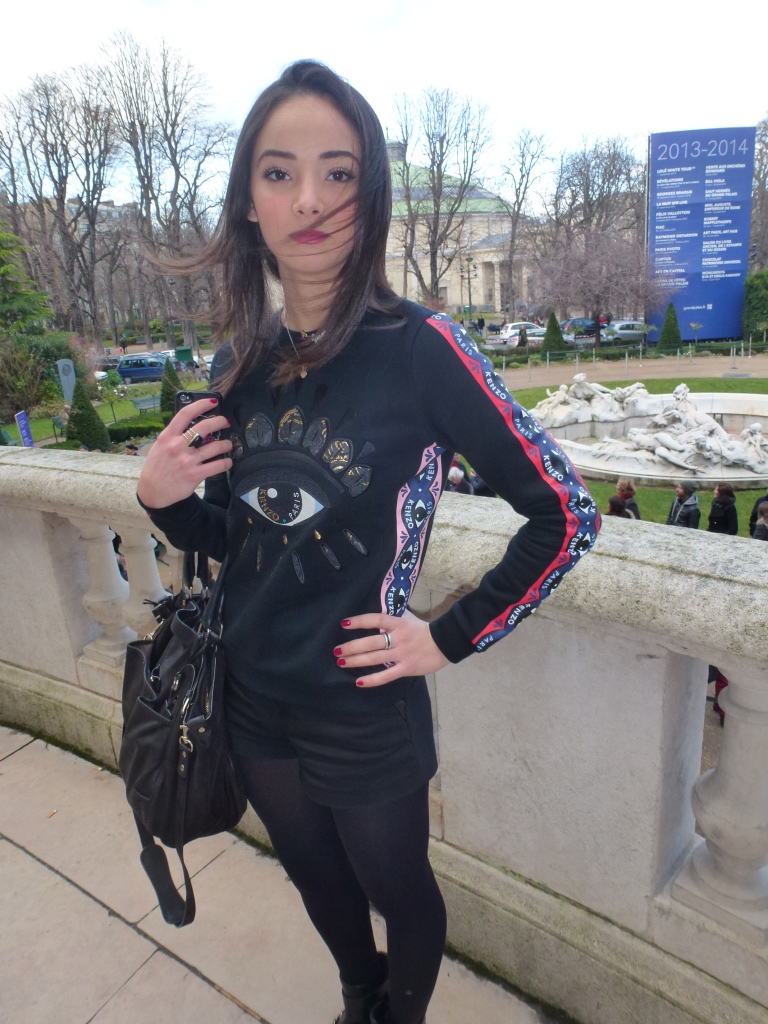 Aujourd’hui je laisse le devant de la scène à une charmante créature. Amel, étudiante française à Londres, en vacances à Paris pendant les fêtes, nous propose un superbe look avec comme pièce phare un sweatshirt Kenzo avec le fameux « oeil Kenzo », l’imprimé fétiche de la collection hiver 2013/2014 de la marque. Ce sweatshirt est une pièce forte, avec un logo très créatif, des imprimés riches et des couleurs vives qui donnent une allure tout à la fois chic et sport. Amel a su l’assortir avec une tenue sobre mais tout aussi chic et de jolis accessoires qui le mettent bien en valeur: