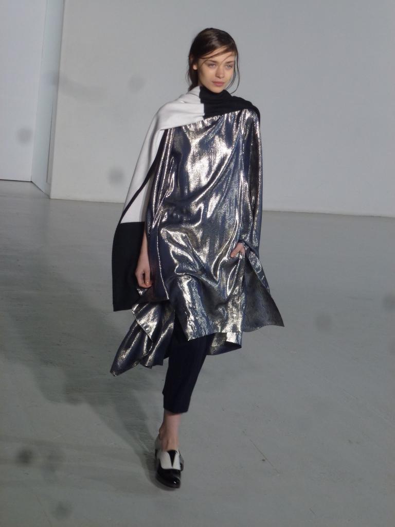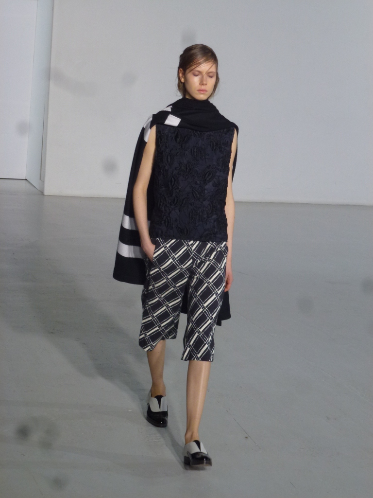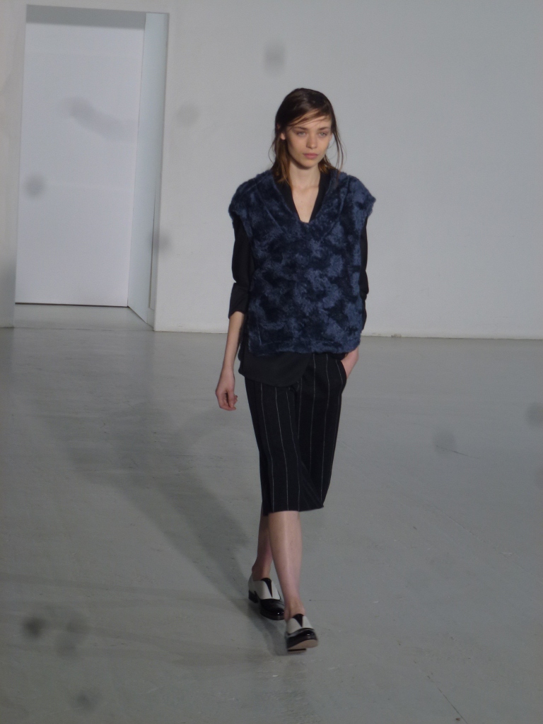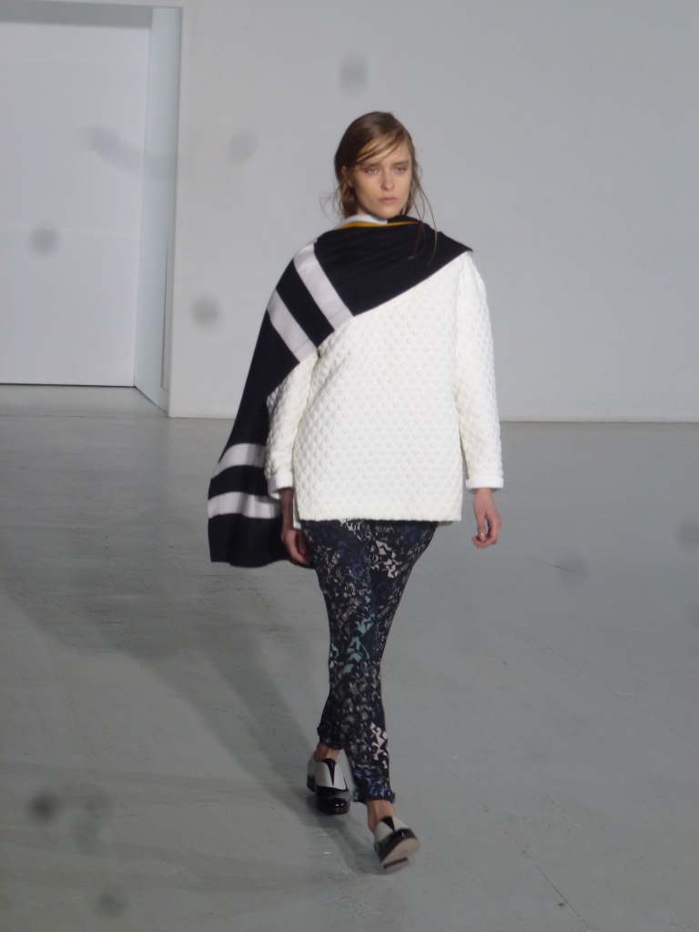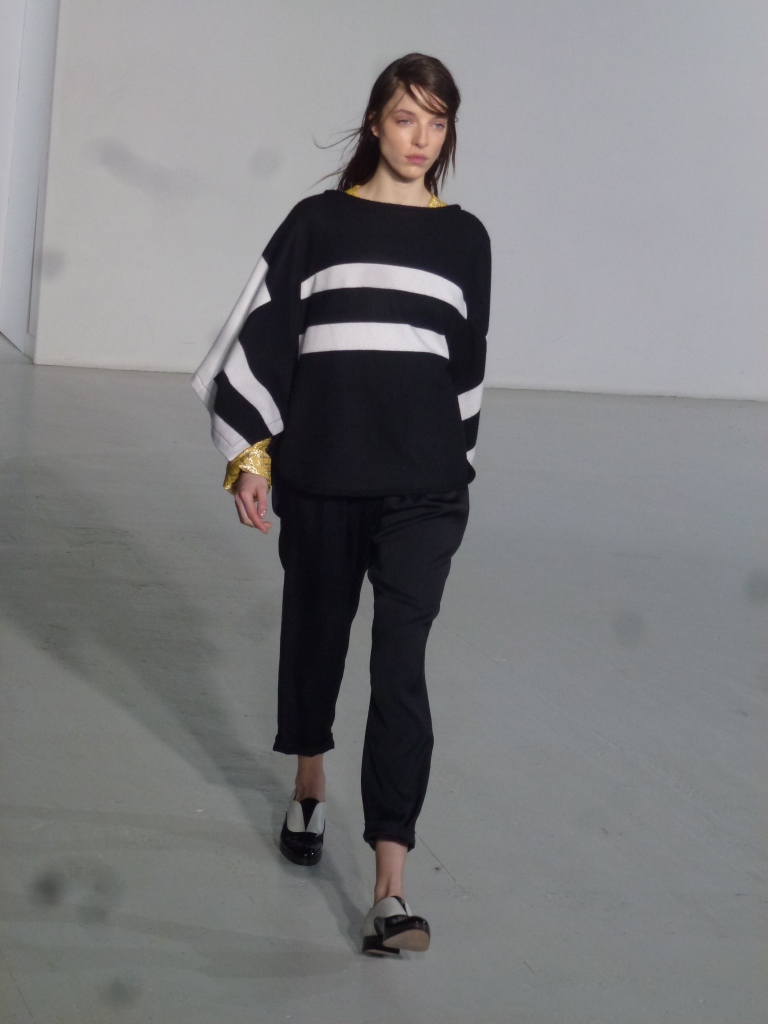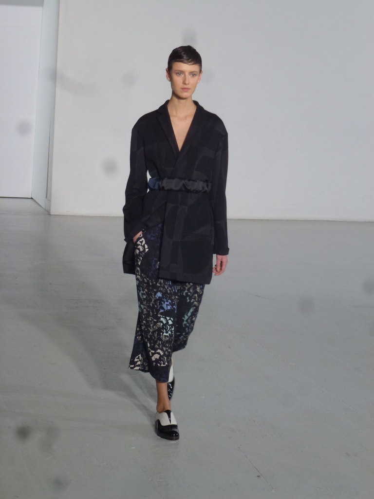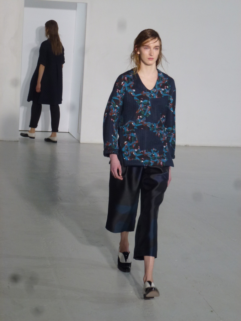 Défilé Odeeh à l’espace Commines: simplicité des lignes, élégance urbaine, de belles combinaisons de bleu/noir/blanc agrémentées de motifs à fleurs et dorés qui apportent une touche de féminité à l’ensemble. Une collection très sympathique!