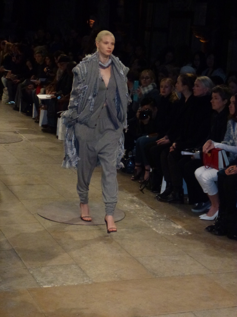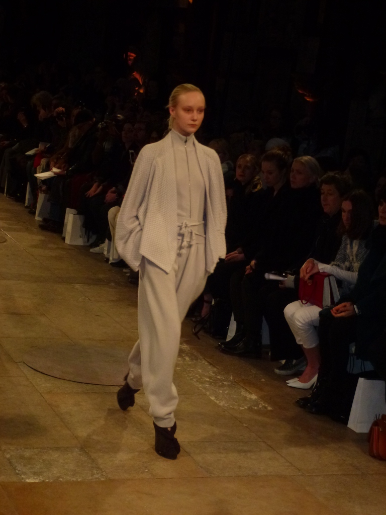 Défilé Allude à la Chapelle des Petits-Augustins (Ecole Nationale Supérieure des Beaux-Arts de Paris): le luxe au quotidien! Des torsades et des nattes opulentes, le cachemire est mis en valeur dans toutes formes de coupes, pour des tenues tout à la fois distinguées et confortables!