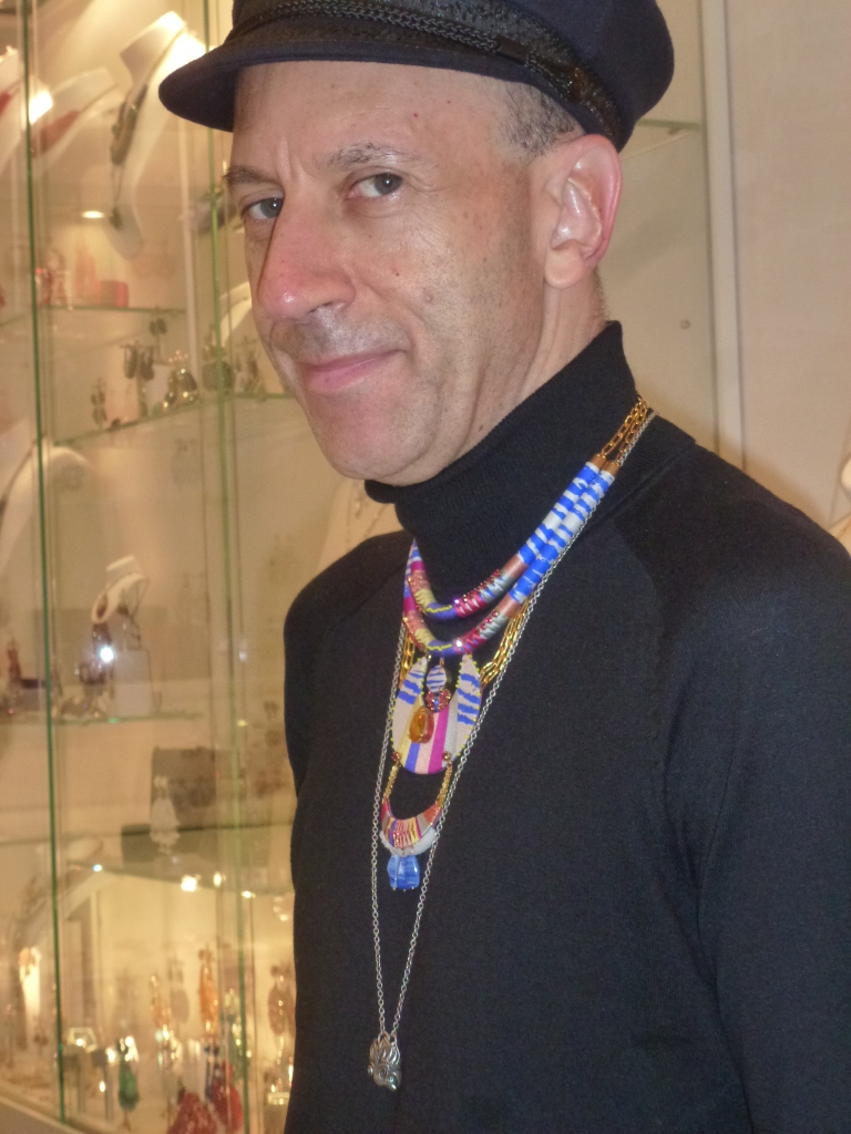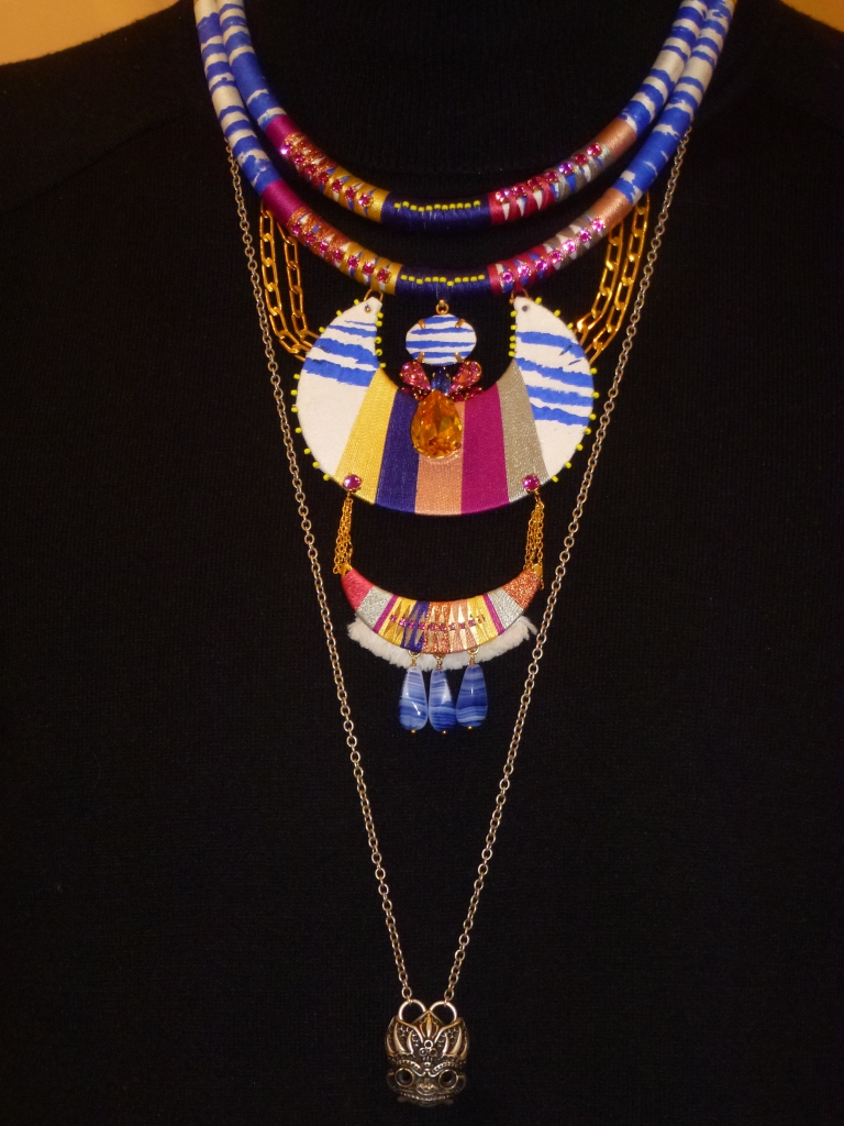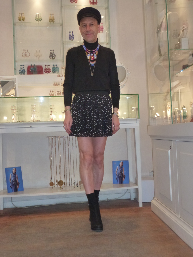 Rien de mieux pour aborder le printemps dans la bonne humeur qu’un joli collier plein de couleurs! J’ai trouvé cette magnifique pièce, toute en couleurs et en finesse, chez Satellite Bijoux (nombreux magasins à Paris et en province). En plus ce collier a l’avantage de se loger parfaitement à l’intérieur de ma chaîne argentée de chez Thomas V (talentueux créateur que je vous avais présenté dans un article en novembre dernier). Avec toujours, pour ce début de printemps, le côté chic du col roulé noir qui met bien en valeur les bijoux. Afin de pouvoir tout à la fois montrer mes gambettes et rendre le reste du look sobre et chic, j’ai complété la tenue avec une jupette plissée à pois (vintage), des chaussures à talons de chez Vagabond assorties de chaussettes noires, et bien sûr une jolie casquette!