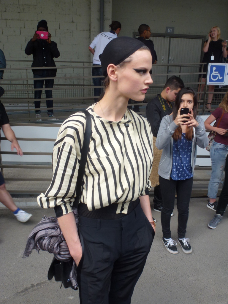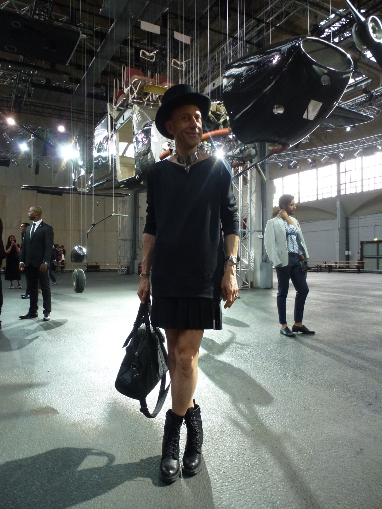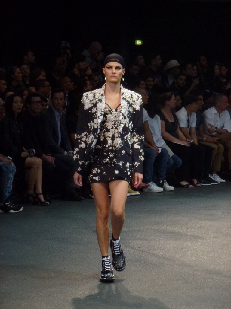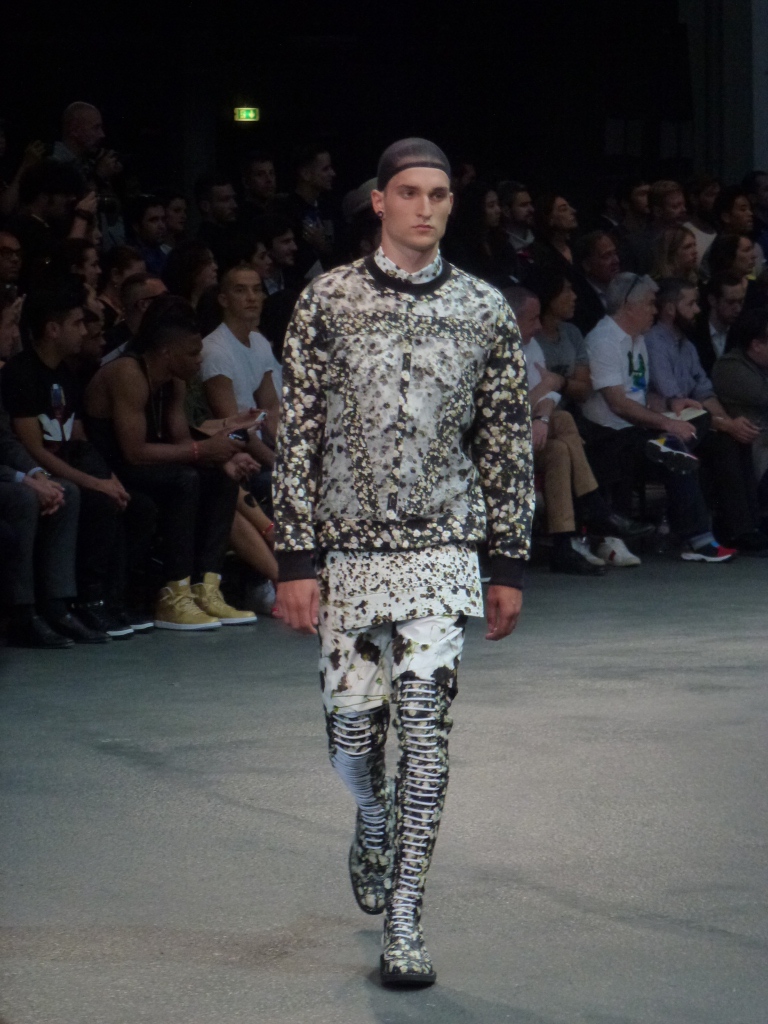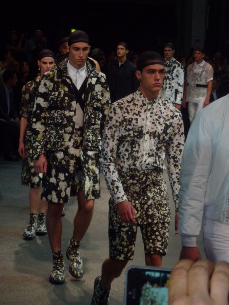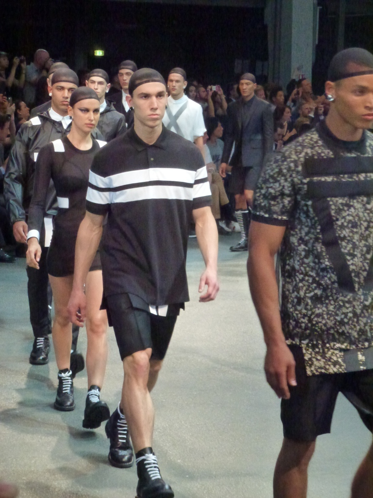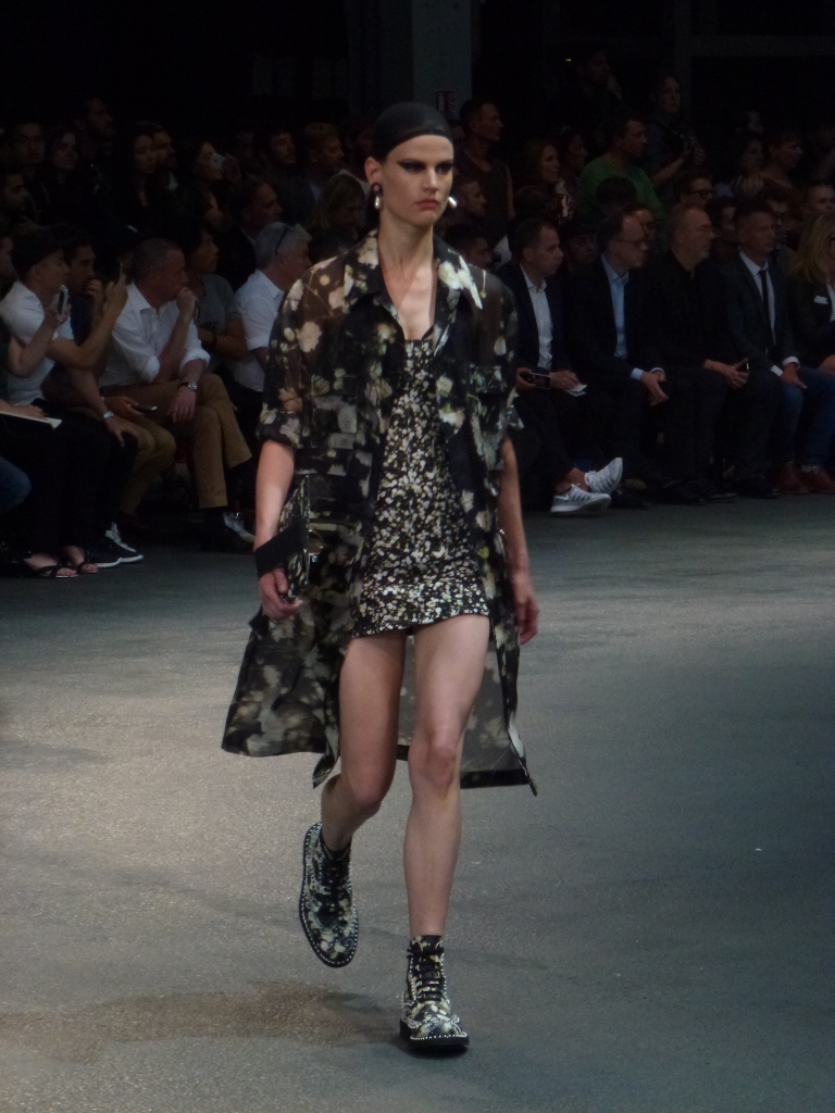 Défilé Givenchy à la Halle Freyssinet: un avion mis en pièces détachées par l’artiste Paul Veroude est suspendu au dessus du manège installé pour le défilé. La collection, qui réconcilie le sportif et l’artiste, mélange manteaux zippés, sweatshirts, débardeurs voilés d’organza, grands bermudas de basketteurs et derbys montants couturés d’interminables lacets blancs. Le noir et le blanc se combinent à merveille pour donner de délicats imprimés floraux en total look. Une collection très réussie.