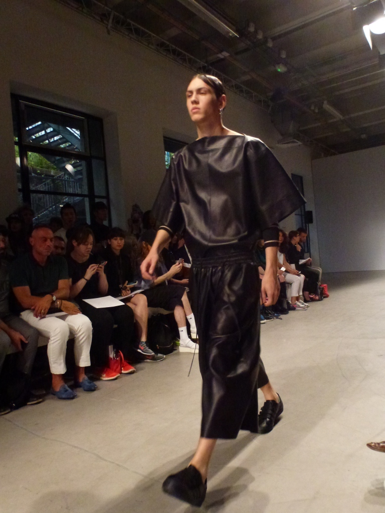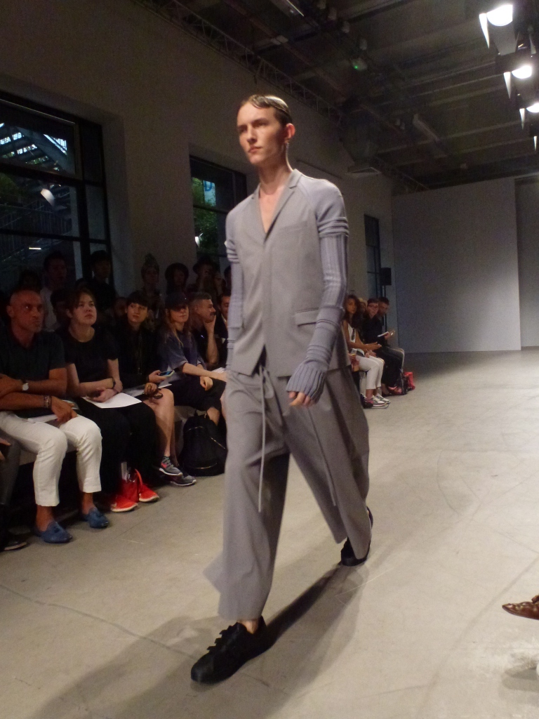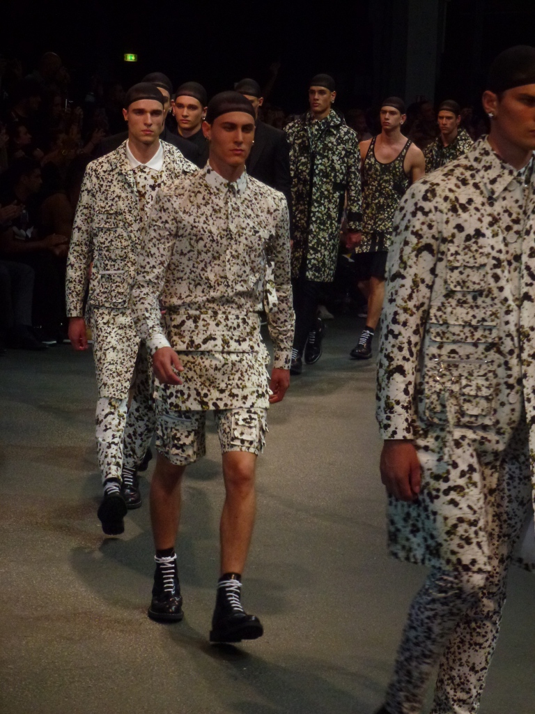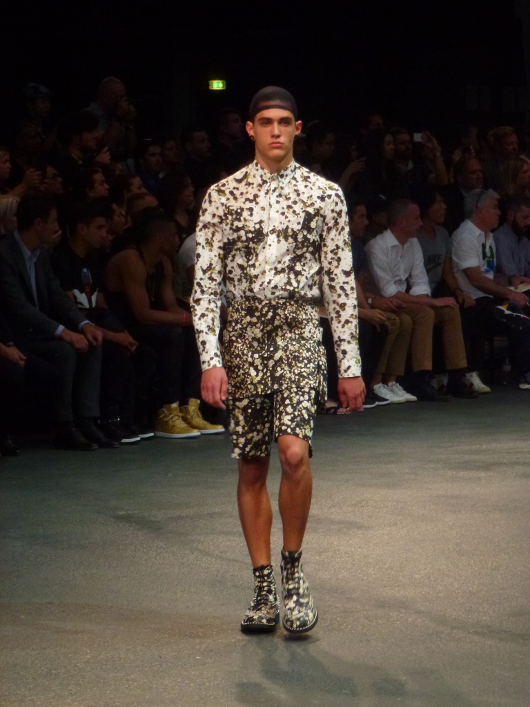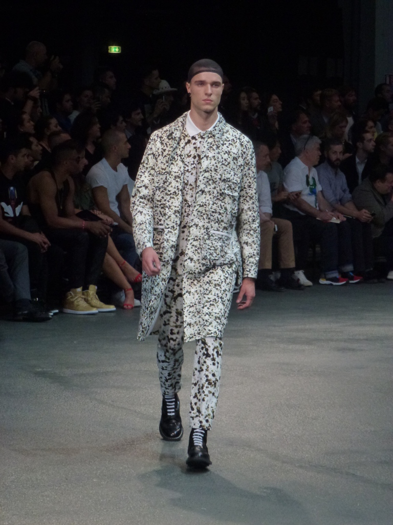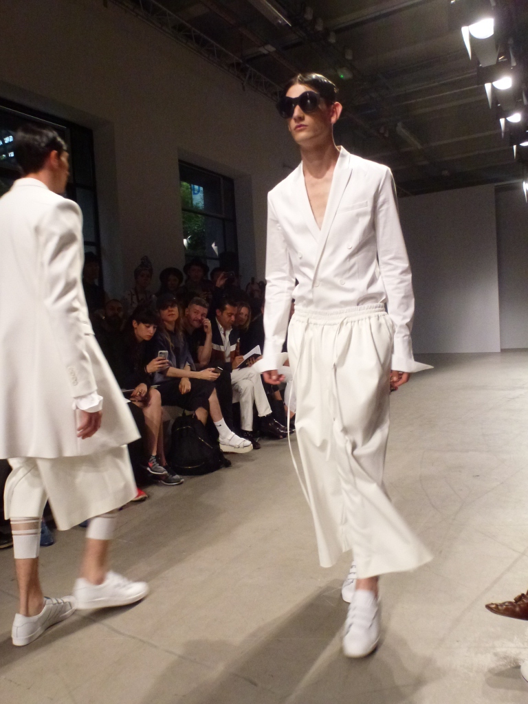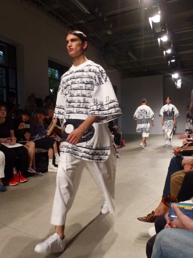 Défilé Juun.J au Palais de Tokyo: le créateur coréen remixe la basket Superstar d’Adidas et joue sur les volumes. La fusion entre sport et couture. Le défilé se termine avec des imprimés graphiques en collaboration avec l’artiste anglais Rob Ryan: du plus bel effet!