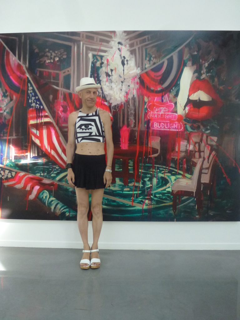 Je vous recommande vivement la visite de ce musée très convivial, ouvert en 2006, qui présente tout à la fois des expositions temporaires et une collection permanente. Cette dernière, composée de peintures, dessins, photographies, sculptures, installations, propose un regard sur la création des années 60 jusqu’à aujourd’hui. Cet été, l’exposition temporaire était consacrée à Rosson Crow, artiste de la jeune scène contemporaine vivant et travaillant à Los Angeles, qui peint (en très grands formats) des intérieurs vidés de toute présence humaine et recomposés à sa façon avec des décors très colorés, anachroniques et pour tout dire hallucinants, créant une atmosphère troublante. De charmantes médiatrices sont présentes dans le musée pour commenter les oeuvres, et accessoirement pour vous prendre en photos! Un vrai plaisir! Je vous propose en photos ma contribution à l’exposition. Pour l’occasion j’avais choisi de mettre mon crop top de la collection Kesh pour american Apparel: du plus bel effet devant les oeuvres!