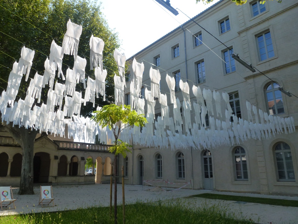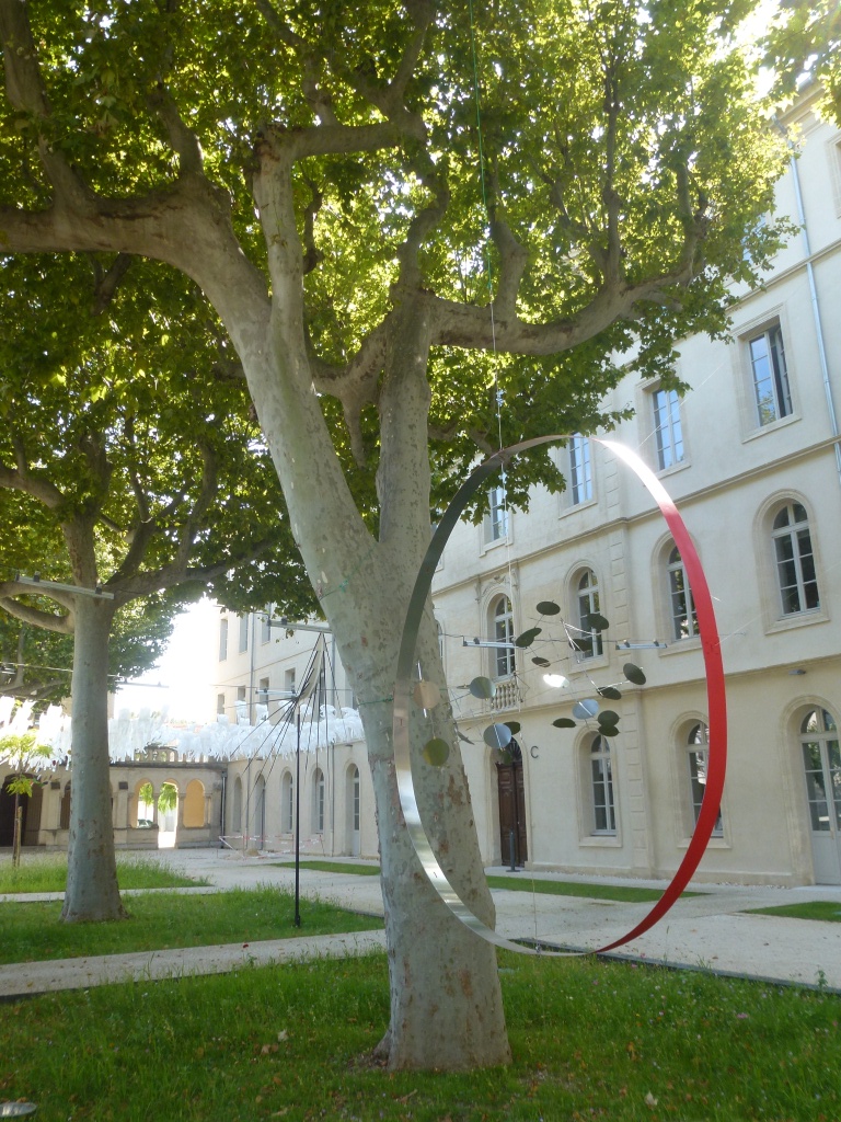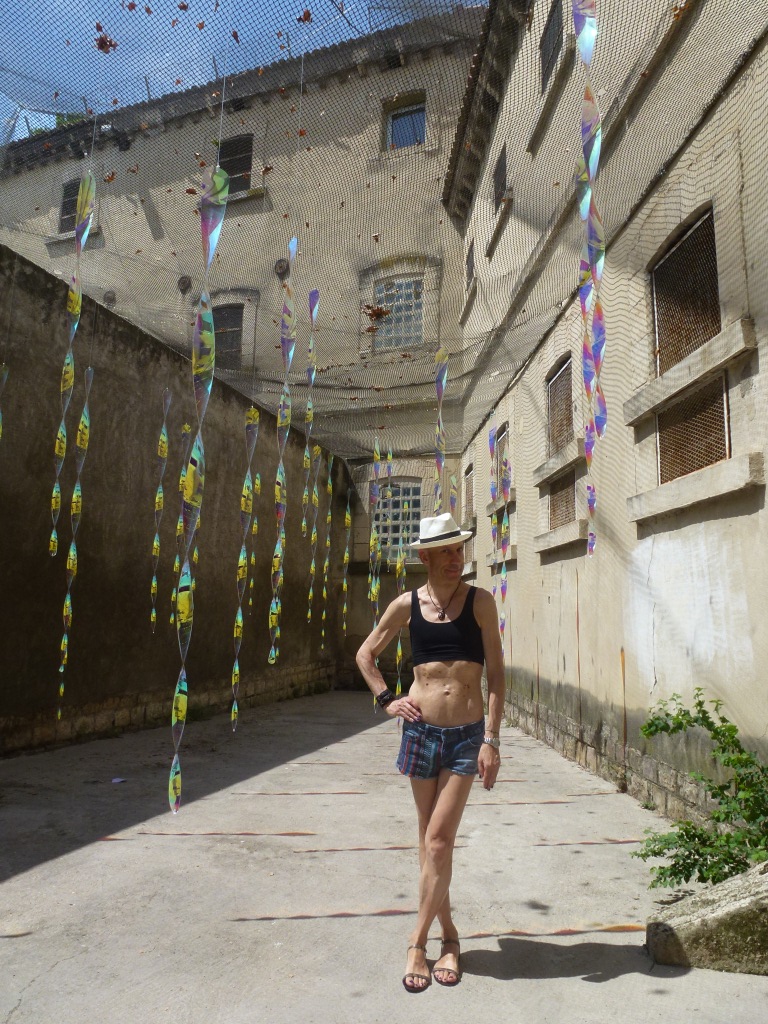Etape à Avignon, une ville qui accueille chaque été (outre le festival de théâtre en juillet) de nombreuses expositions d’art contemporain. Cet été la Collection Lambert, en travaux, s’est déplacée dans l’ancienne prison Sainte Anne, réouverte pour l’occasion, afin d’y présenter une exposition intitulée « La disparition des lucioles »: 200 oeuvres étaient ainsi présentées dans les cellules, dans une atmosphère irréelle, non sans une certaine poésie. Dans la Cour de l’Archevêché avait lieu une exposition intitulée « L’air du temps », présentant des oeuvres mobiles suspendues à des fils, se glissant entre les arbres et nous invitant à la rêverie. Tout cela a été pour moi l’occasion de faire de jolies photos!