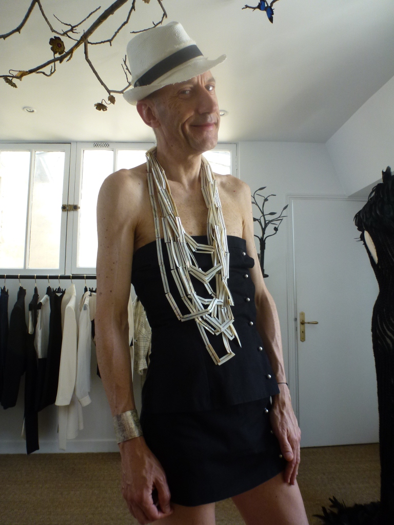 Comme je vous l’ai annoncé dans mon dernier article, j’ai pu essayer une tenue de la créatrice Claire Châtaigner dans son atelier/showroom parisien. Cette tenue particulièrement chic est un clin d’oeil aux costumes de bain des années 20. Ce n’est pas une robe, mais un short et un bustier assortis! C’est tout simplement sublime. Sur les deux dernières photos j’ai accessoirisé la tenue avec mon collier/sautoir en nacre pour encore plus de glamour! J’ai également retrouvé dans l’atelier la robe « Chevelure Mami Wata » que Claire avait présentée lors de la Fashion Week Haute Couture en juillet dernier et qui rend hommage à l’Afrique et à la Femme Noire, au travers de cette déesse fondatrice de la religion Vodou en Afrique de l’Ouest (cf mon article Fashion Week Haute Couture AW 14/15 Jour 2). Notre émerveillement reste entier devant cette splendide création.