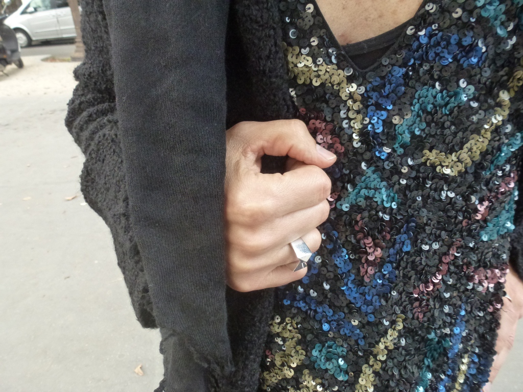 L’automne arrive pour de bon à Paris, mais ce n’est pas une raison pour cacher ses gambettes, ni pour adopter un look triste! Une robe noire couverte de sequins multicolores et des boots recouvertes d’étoiles et de clous argentés et dorés permettent d’apporter une touche festive à une tenue d’allure générale assez sobre. Toutes les pièces de ce look (robe, manteau, écharpe, chapeau) font partie de la collection automne-hiver 14/15 de Zadig&Voltaire; les boots sont de Laurence Dacade pour Zadig&Voltaire. Et n’oublions pas les chaussettes pour la touche fashion!