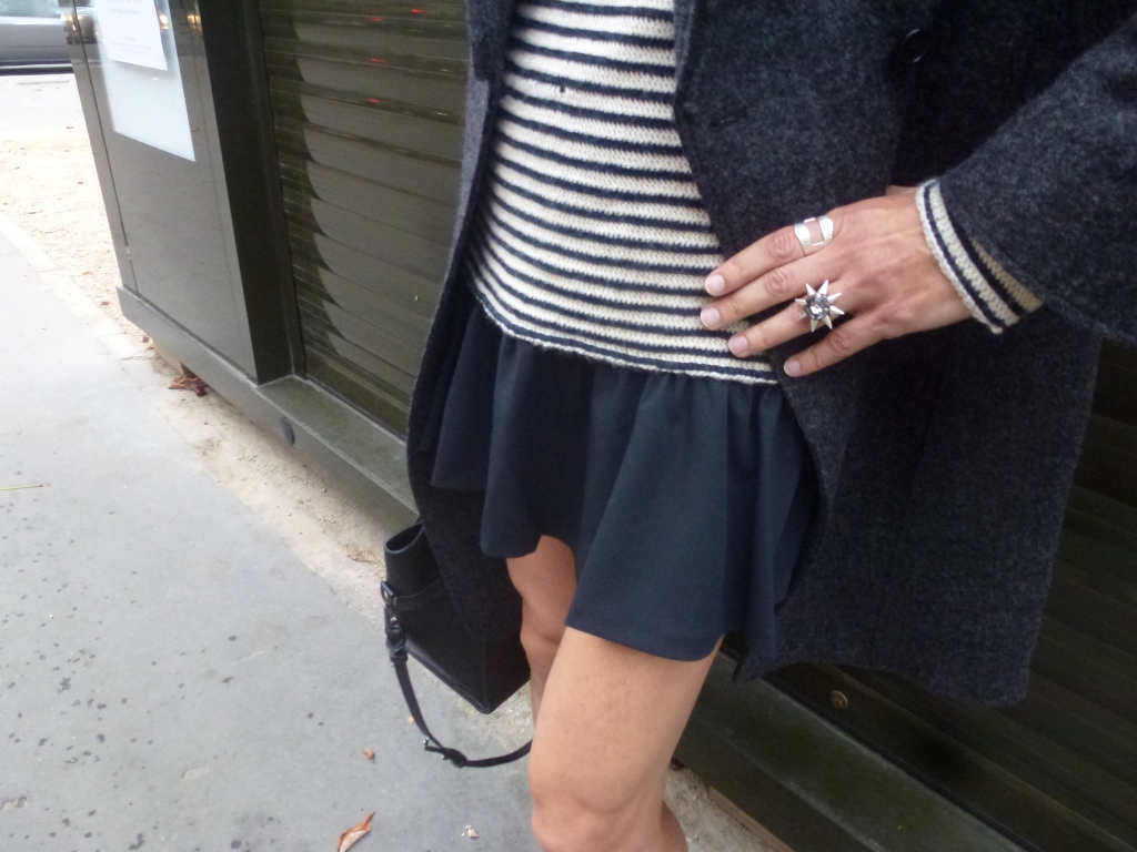 Cette fois l’hiver est là pour de bon! Donc allons-y pour les manteaux et tout ce qui tient bien chaud. Mais qui dit manteau dit aussi plaisir de porter en-dessous du très court! Alors n’hésitez plus une seconde pour mettre vos mini-jupes préférées. Voici un look tout à la fois chic, sobre et sexy! Le pull marin avec des petits trous donne un peu de fantaisie à un ensemble de belle facture. Manteau, pull, jupe et sac sont de la collection hiver 2014/2015 de Zadig&Voltaire. Chaussures Minelli (collection antérieure). Bagues Clara Jasmine et Crezus.