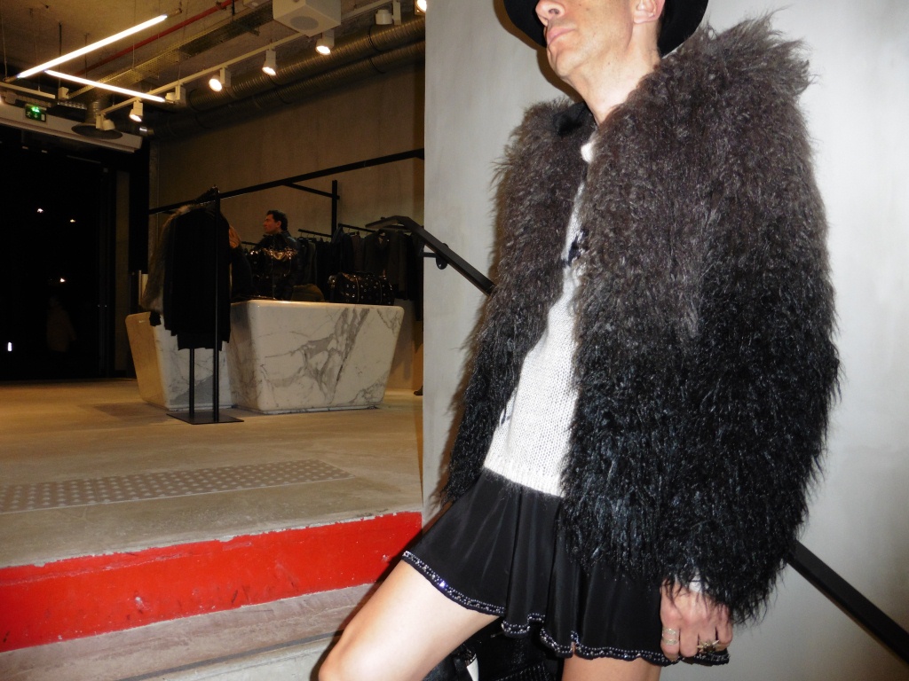 Vraie ou fausse, la fourrure est tendance cet hiver. Avec des coupes courtes et des couleurs plus fun, elle prend assurément un coup de jeune. Dans ce look composé à partir de plusieurs magnifiques pièces de la collection hiver 2014/2015 de Zadig&Voltaire je porte un manteau en fausse fourrure (modacrylic) en dégradé de gris à noir et un pull en laine très doux (mohair/laine vierge/nylon) sur une robe courte noire en viscose au toucher soie avec broderies et perles fait main (superbe pièce pour les fêtes de fin d’année). Un manteau en fourrure doit toujours être accompagné des bons accessoires, en particulier d’un beau sac à main. Sac à main et chapeau sont aussi de la collection Zadig&Voltaire AH 14/15.