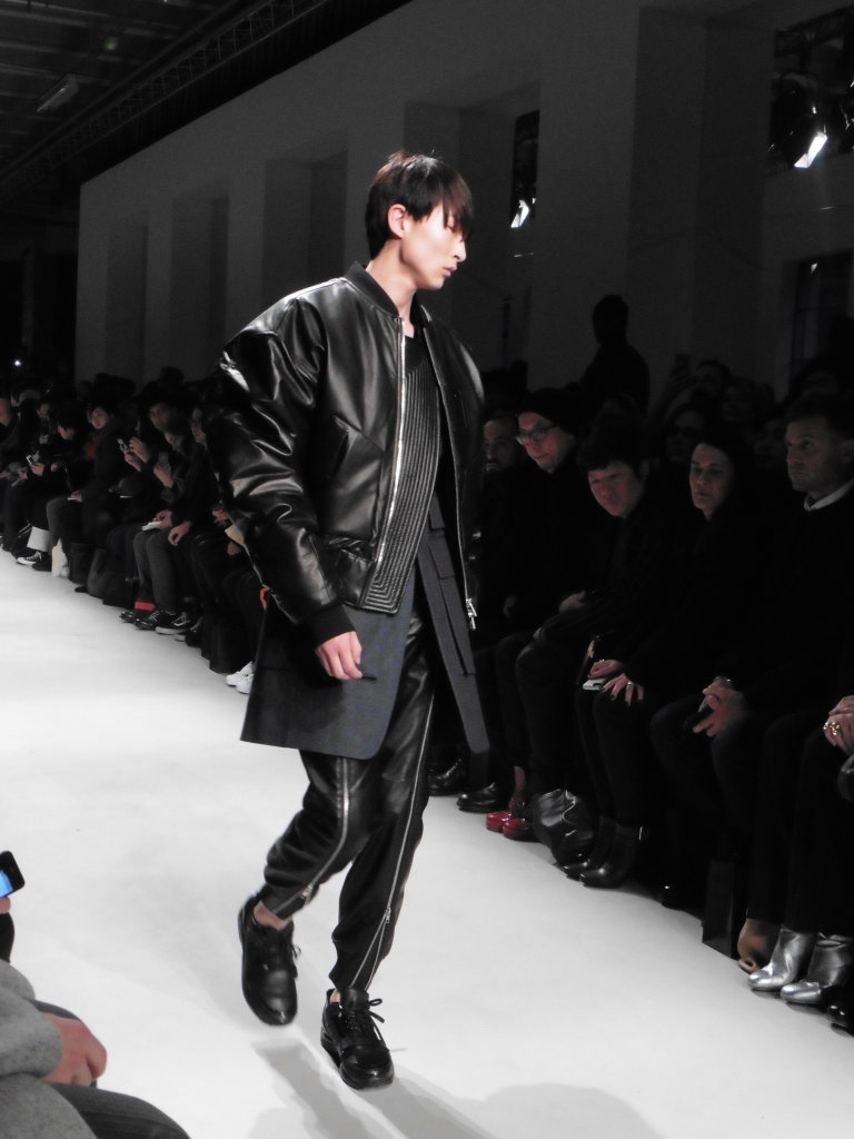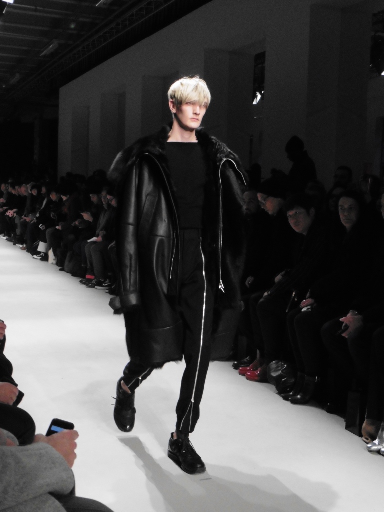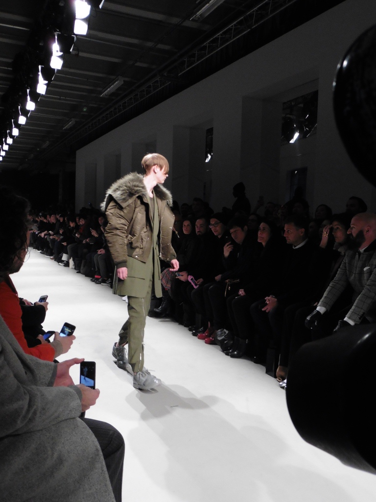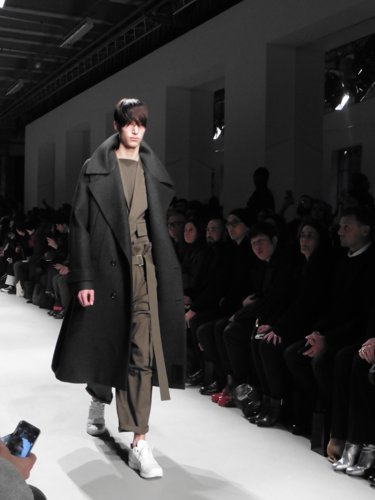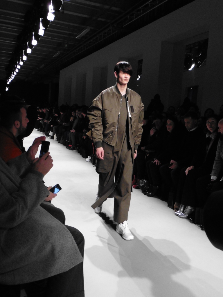 Défilé Juun.J au Palais de Tokyo: pas d’hésitation, nous sommes bien en hiver. La marque nous propose une collection cohérente d’inspiration militaire. Style militaire chic et modernisé, décliné en toutes sortes de vêtements: costumes, blousons, manteaux, parkas. Kaki et noir dominants, laissant la place pour quelques tenues à du blanc et du bleu marine. Silhouettes imposantes, coupes amples, pantalons larges, manteaux volumineux, cols en fourrure. Collaboration avec Adidas pour les chaussures. Nous sommes parés pour l’hiver avec beaucoup d’élégance.