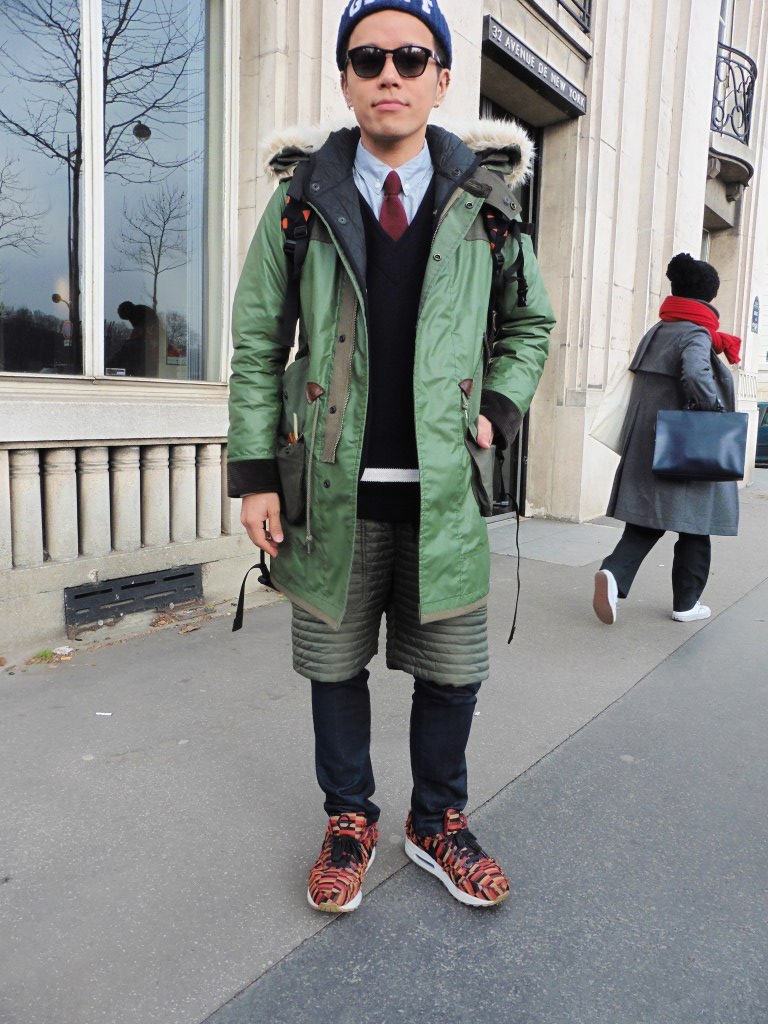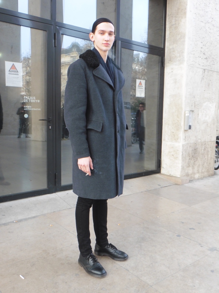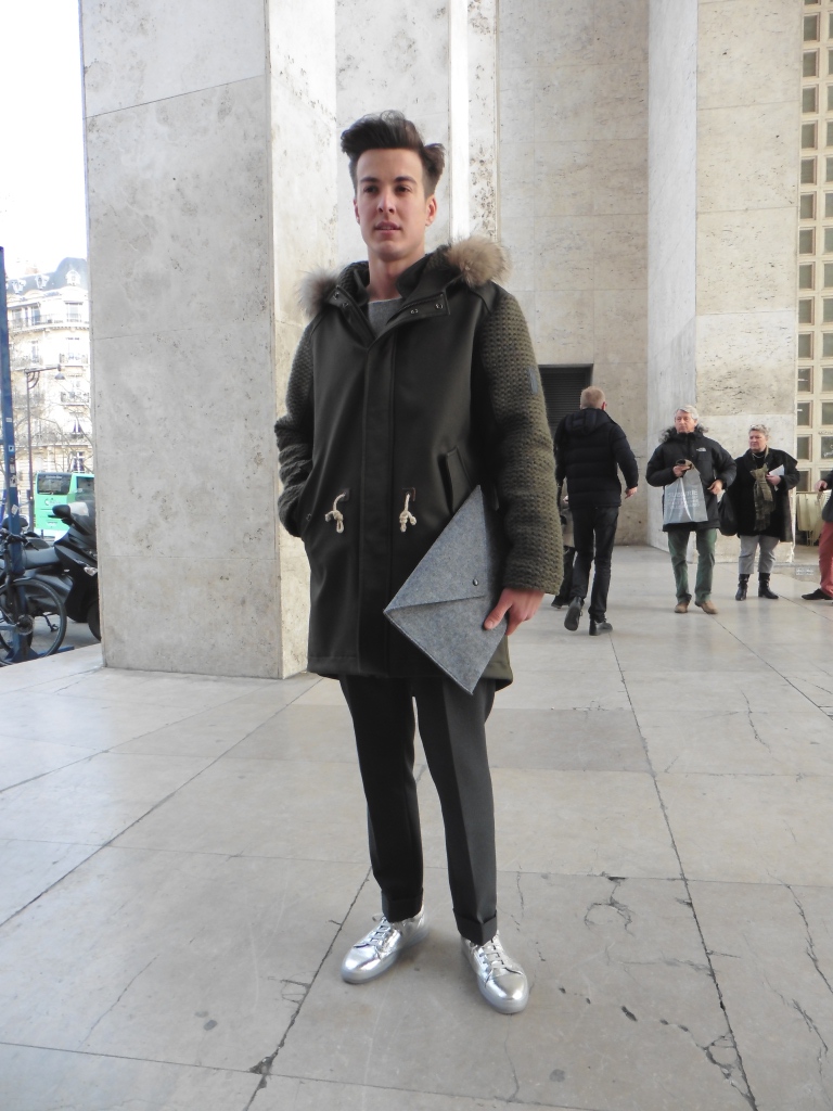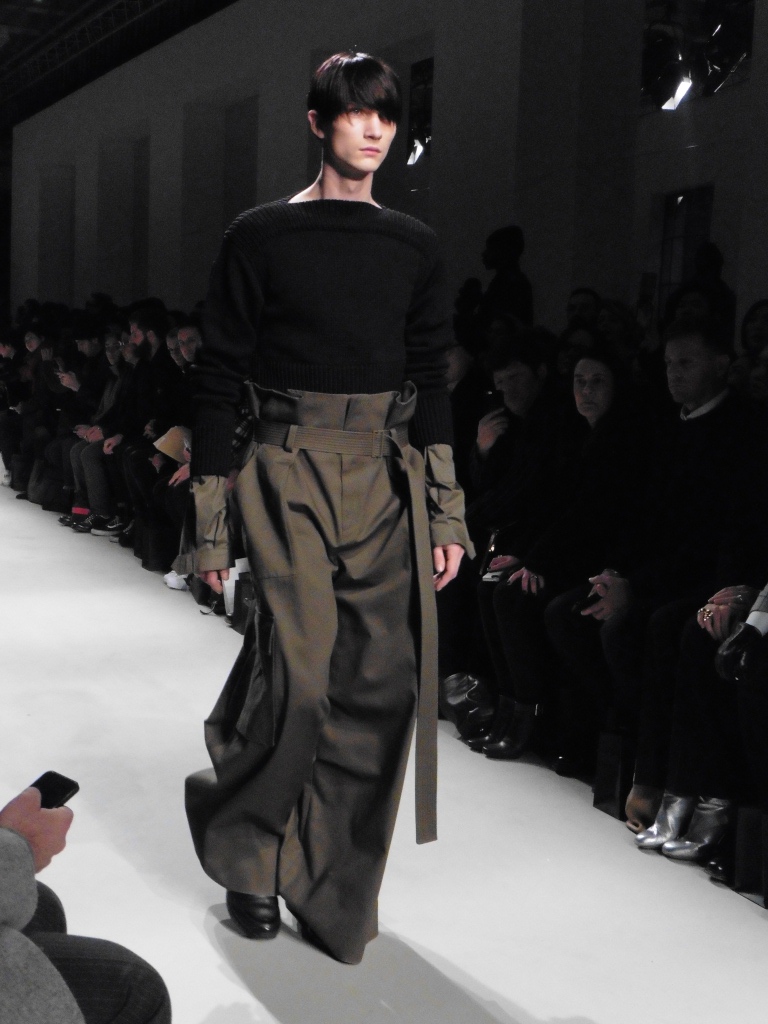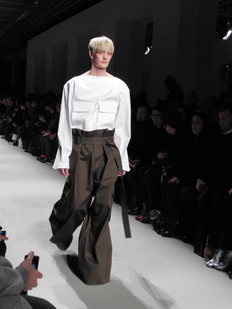 Défilé Juun.J au Palais de Tokyo: pas d’hésitation, nous sommes bien en hiver. La marque nous propose une collection cohérente d’inspiration militaire. Style militaire chic et modernisé, décliné en toutes sortes de vêtements: costumes, blousons, manteaux, parkas. Kaki et noir dominants, laissant la place pour quelques tenues à du blanc et du bleu marine. Silhouettes imposantes, coupes amples, pantalons larges, manteaux volumineux, cols en fourrure. Collaboration avec Adidas pour les chaussures. Nous sommes parés pour l’hiver avec beaucoup d’élégance.