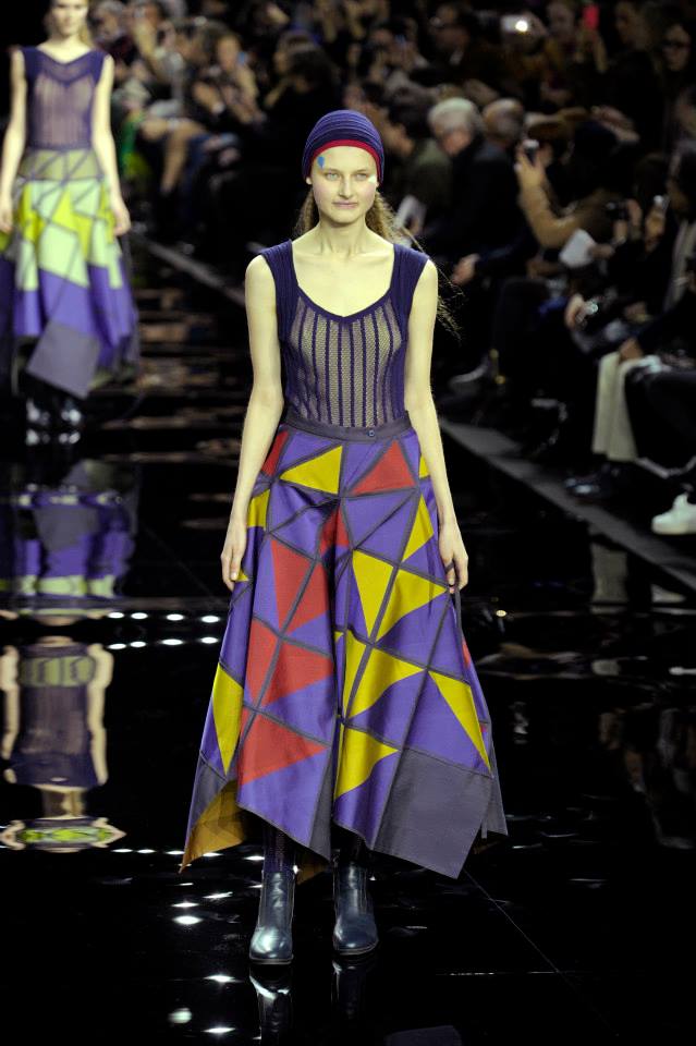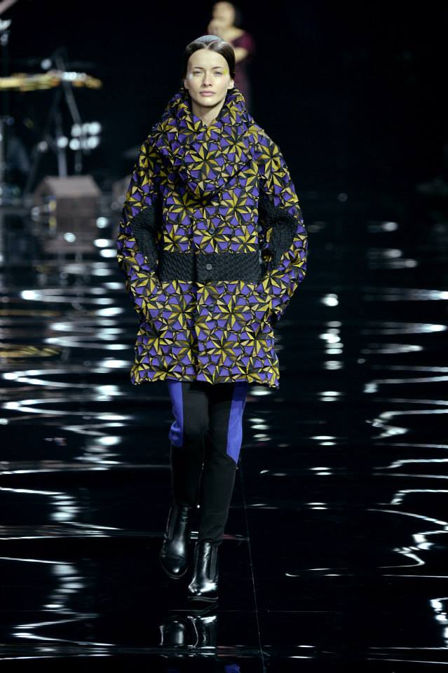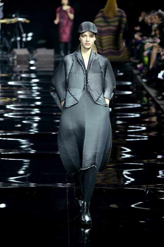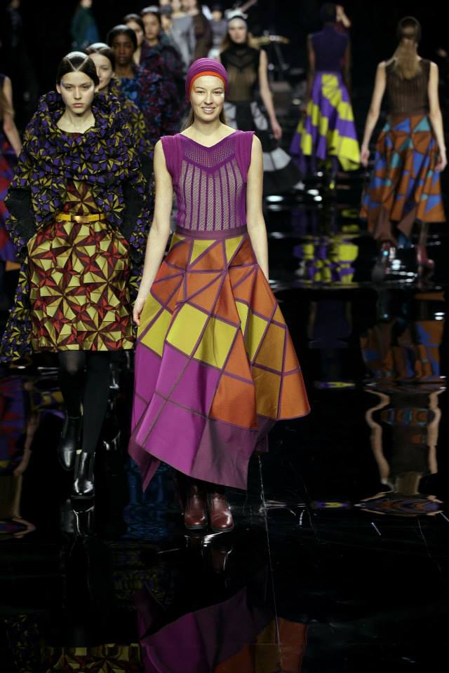 Défilé Issey Miyake à l’Espace Ephémère Tuileries (Jardin des Tuileries): la collection « Colorscope » est un festival de couleurs. Un kaléidoscope géant dans lequel les couleurs se combinent à l’infini. Les tissus en 3 dimensions aux multiples reliefs sont d’une grande fluidité grâce au 3D Stream Stretch, un procédé conçu par la maison Issey Miyake qui rétracte les fibres de tissus à la vapeur. Silhouettes aux tonalités éclatantes dont l’intensité des couleurs est contrastée par le noir. Vestes et manteaux douillets très élégants. Jupes larges aux motifs graphiques très colorés. Beaucoup de poésie et d’émotions! Magnifique!