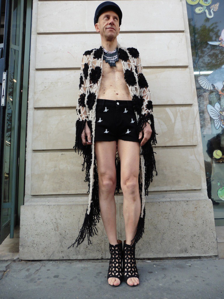 Une tenue habillé/déshabillé pour le début de l’été! Le châle en merinos alpaga Zadig&Voltaire porté sur la peau tient chaud, tout en donnant une allure très sexy. Minishort taille haute avec motifs pingouins dessinés par l’artiste japonais Ohtaké Tsukasa pour Zadig&Voltaire. Chaussures What For.