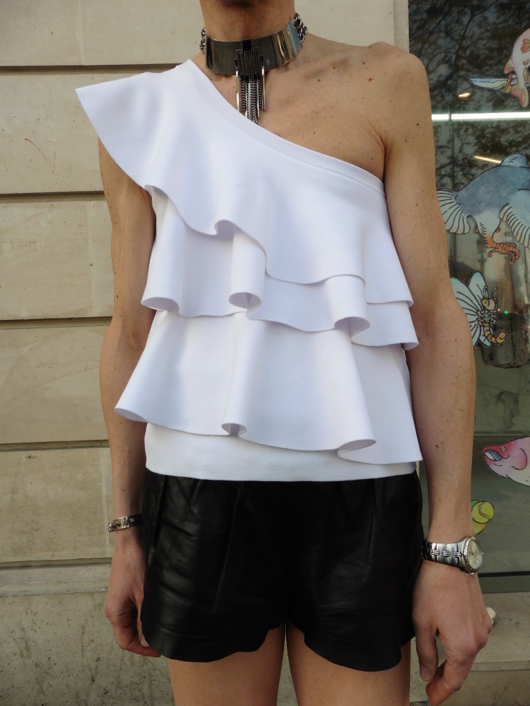 Pour rester dans le thème du noir et blanc d’été, l’élégance intemporelle même en été, voici un nouveau look chic et sexy tout en légèreté. Magnifique débardeur asymétrique à volants de Zadig&Voltaire (collection été 2015). Minishort en cuir Maje (collection antérieure). Collier Satellite (collection antérieure). Chaussures What For.