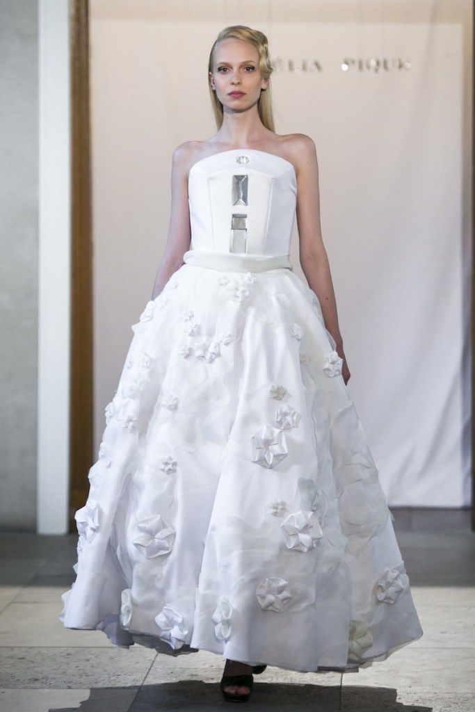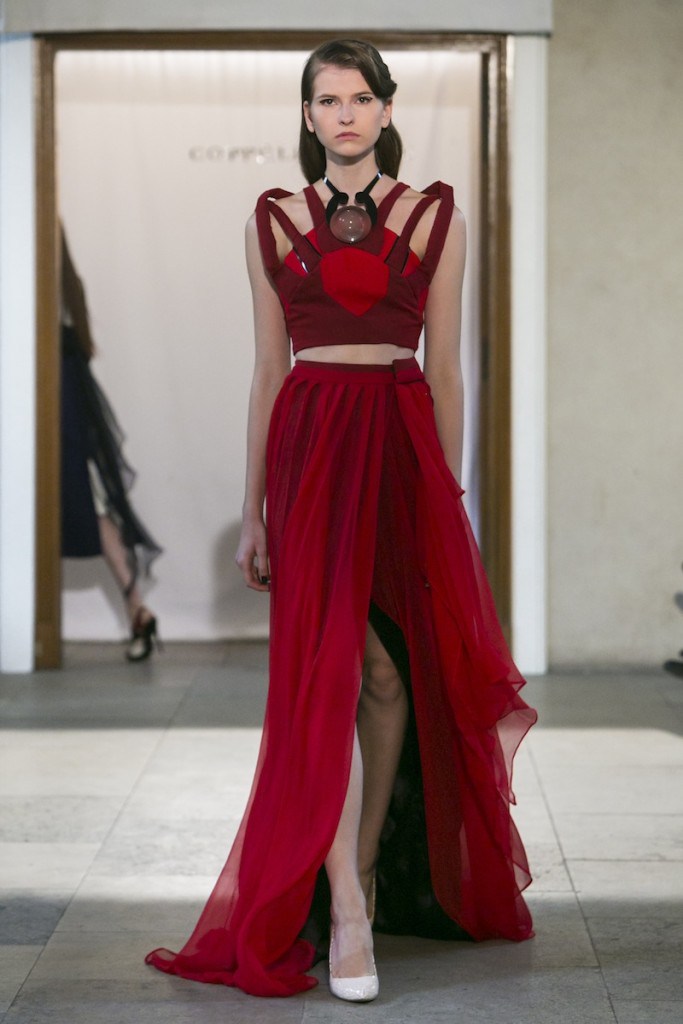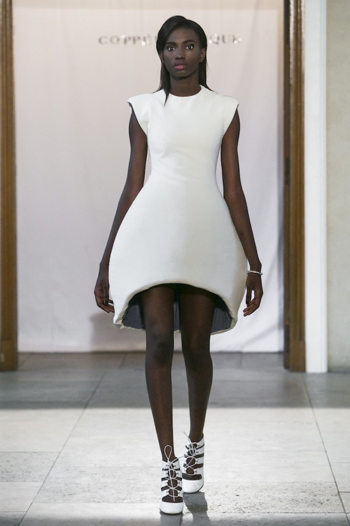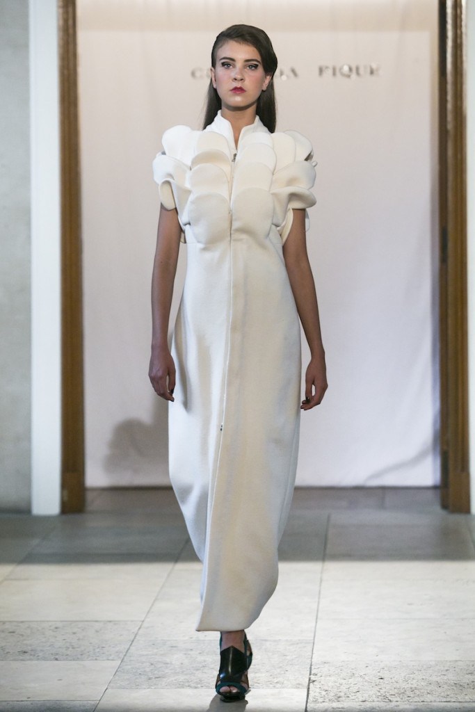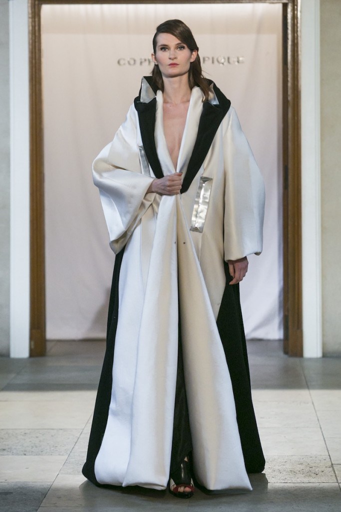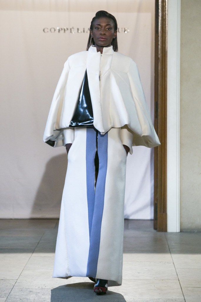 Défilé Coppélia Pique à la Salle des Colonnes (Eglise Saint-Eustache): la créatrice Axelle Migé nous propose une collection « La toile de Louise », inspirée de la vie et de l’oeuvre de l’artiste Louise Bourgeois, laquelle avait dû affronter un conflit familial avec son père désireux d’avoir un fils. Axelle Migé nous présente ainsi une femme libre et rebelle, sensuelle et androgyne. Blanc dominant, relevé par du bleu et du rouge. Motifs géométriques sur certaines silhouettes.Robes aux larges volumes, manteaux imposants et majestueux.