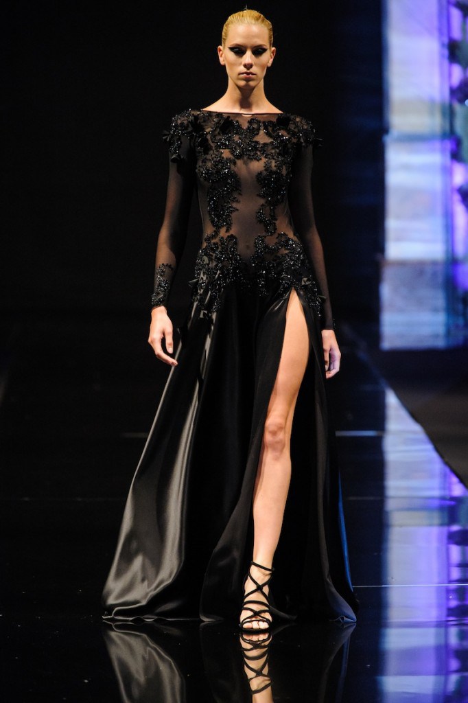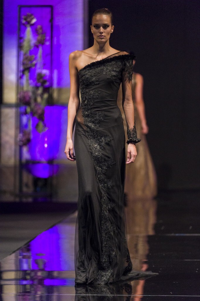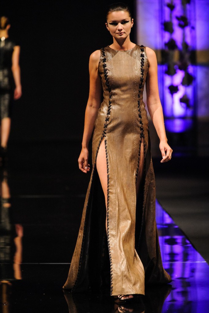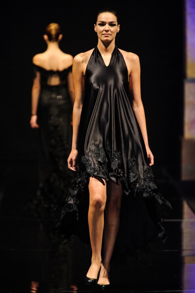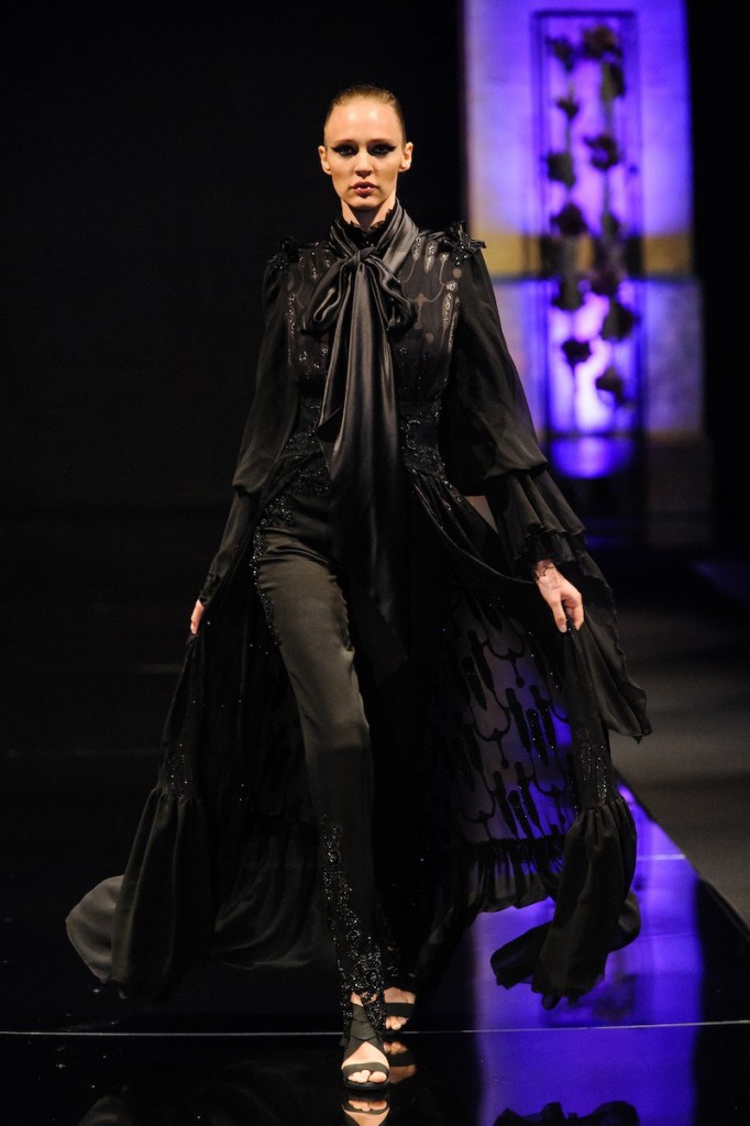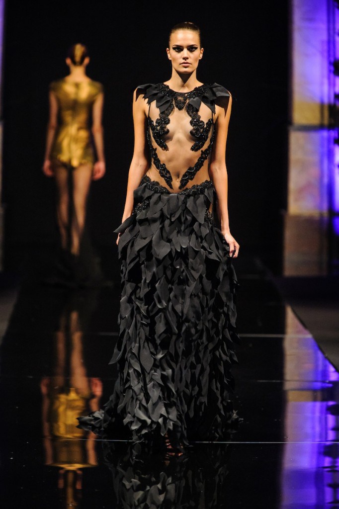Défilé Zvonko Markovic dans la Nef du Palais Brongniart: premier défilé officiel à Paris pour le couturier serbe, qui présente une collection intitulée » Midnight Butterfly » et qui vise à célébrer le voyage de la chenille se transformant en papillon de nuit. Cela se traduit par des mélanges de soie déchirée, crêpe georgette, tulle de soie, satin, dentelle… et de cuir et peaux d’Anaconda. Chaque partie de ce périple est figurée dans des tons noir, or, noisette et bronze. Il en ressort une femme séduisante, sûre d’elle, résolument moderne.
