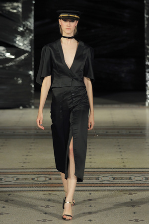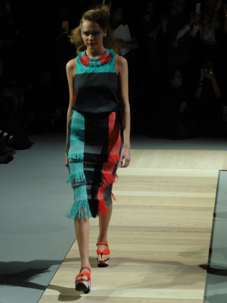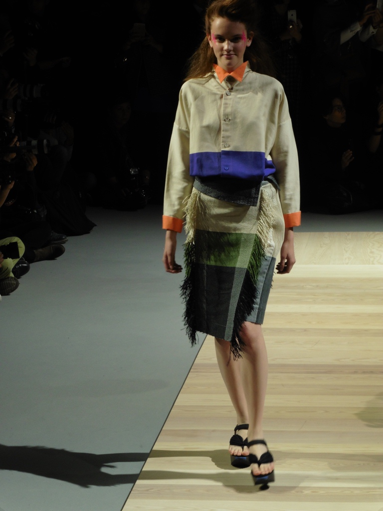 Défilé Luis Buchinho au Conservatoire National des Arts et Métiers: une collection inspirée par les groupes musicaux du début des années 80 et leurs clips qui ont fait s’intéresser le créateur portugais à la mode pour la première fois. Femme fatale en noir à l’allure sexy chez Duran Duran; côté boyish des premiers Boys Bands; excentricité mode de groupes comme Culture Club. Ceci conduit aussi bien à des pantalons masculins portés avec de grandes blouses et des vestes oversize, qu’à des looks glamour faits de robes tubes, vestes étroites et chemises à jabot. Jupes et robes fendues comme dans les années 80. Magnifiques imprimés graphiques dont les couleurs éclatantes rappellent les couvertures d’albums typiques de la décennie. Matières sélectionnées avec soin. Les chapeaux sont fascinants. Fabuleux voyage dans le temps!