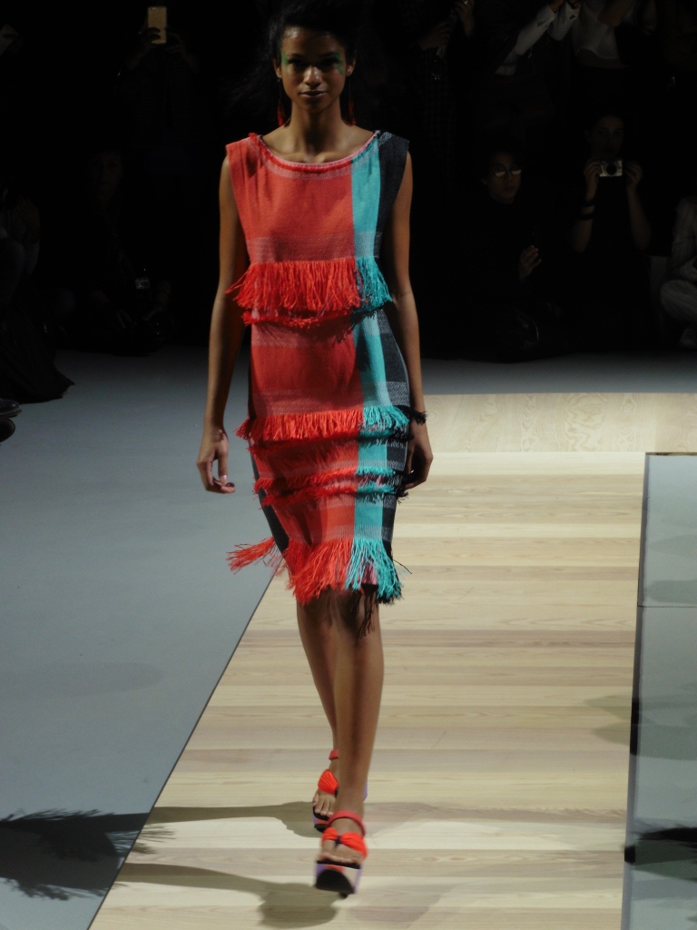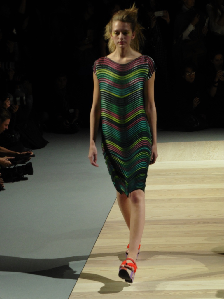 Défilé Issey Miyake à l’Espace Ephémère Tuileries (Jardin des Tuileries): la collection intitulée « Délices Botaniques » nous emmène dans une savoureuse aventure. Couleurs et formes sont vives et vigoureuses, épicées par l’inspiration de l’immense vitalité et diversité de la flore tropicale. La marque poursuit ses recherches de nouveaux tissus techniques afin de créer des vêtements légers, confortables et faciles à porter au quotidien. Ainsi le « 3D Steam Stretch », un tissu étiré à la vapeur, évolue grâce à l’introduction de matières naturelles et à l’utilisation d’une large palette de couleurs. Chemises et vestes en papier ultra-fin issu de fibres végétales; série de t-shirts colorés qui semblent être comme des « jerseys tissés ». Le procédé inédit « Baked Stretch » a permis de concevoir un nouveau type de plissé dont le tissu est traité à la colle et sublimé par l’ajout d’imprimés courbes et colorés. Un défilé superbement magistral!