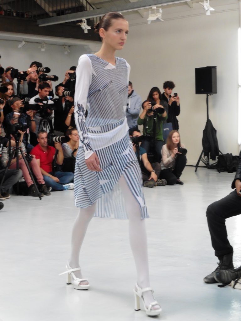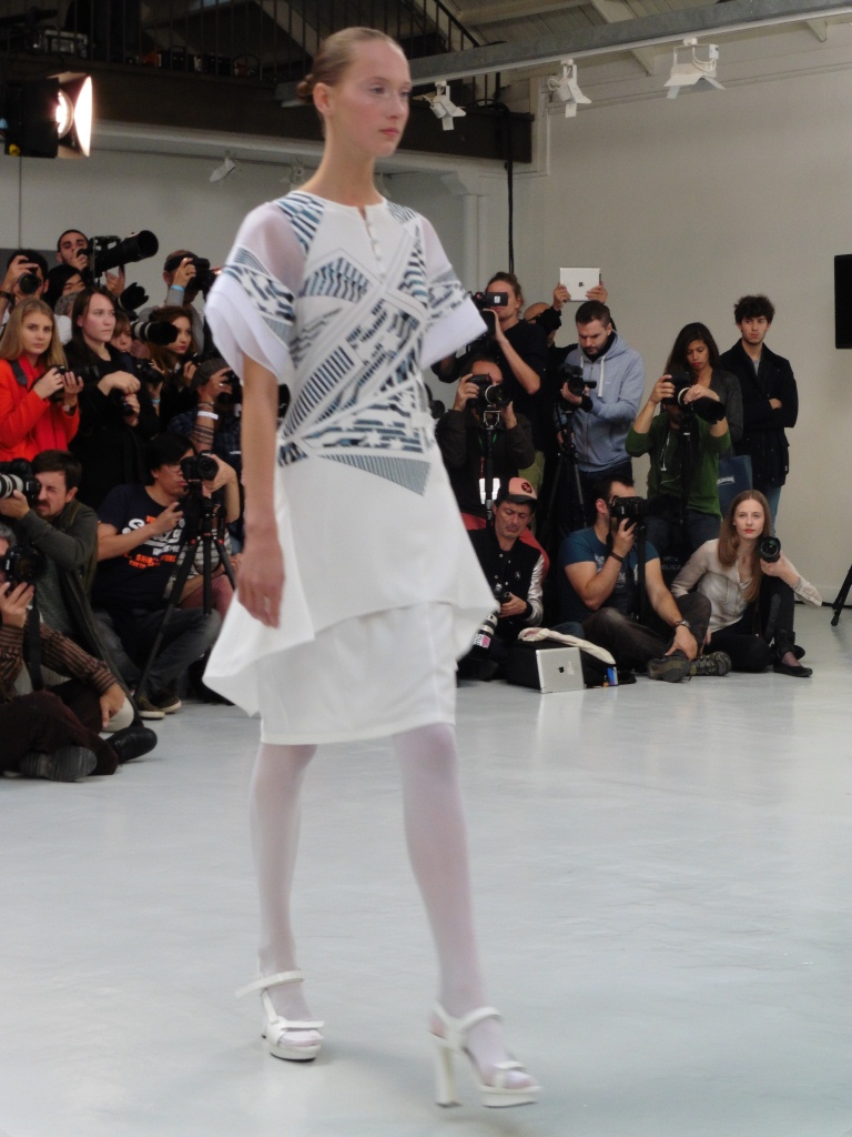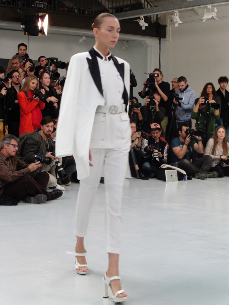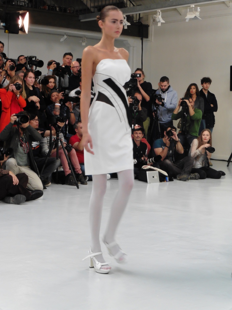 Défilé Vassilly à l’Espace Commines: pour son premier défilé à Paris, le créateur coréen a choisi de sublimer l’élégance intemporelle de la parisienne. Une collection toute en noir et blanc, où le blanc est largement dominant et qui joue sur les contrastes de volumes et de matières. Lignes graphiques, dentelles bicolores. Imprimés aux illusions d’optique. Jeu entre le tombé classique d’une mousseline de soie et la rigidité d’une maille 3D. Chic et moderne à la fois. Premier essai assurément réussi!