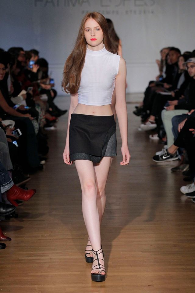 Défilé Fatima Lopes au Salon des Miroirs: la créatrice portugaise a présenté une nouvelle collection axée sur le thème de la simplicité. Les formes sont simples, mais toutefois travaillées. Plissés discrets, détails graphiques, épaules et dos dénudés. Noir et blanc dominant, mais on trouve aussi des acidulés « applemint », lilas, vert émeraude, des combinaisons de teintes monochromes autour du beige et des touches de dentelle dorée. Des silhouettes en définitive féminines, harmonieuses et accessibles.