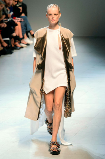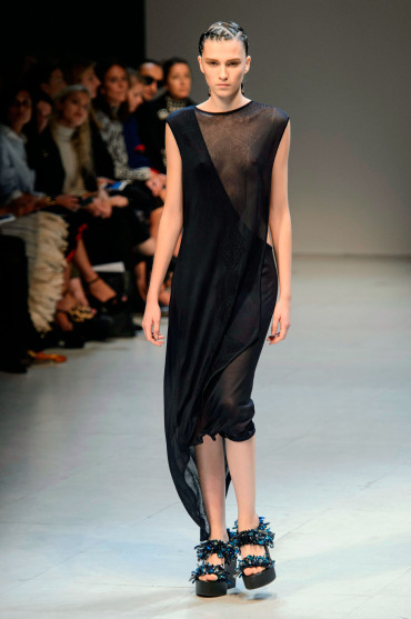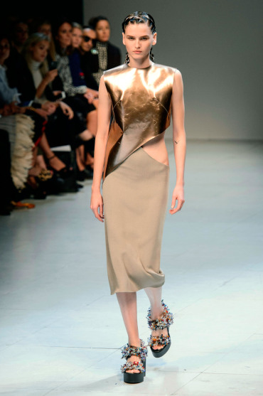 Défilé Esteban Cortazar au Palais des Beaux-Arts: exotisme et peaux de serpent sont au rendez-vous de cette nouvelle collection particulièrement créative présentée par le designer colombien. Les anneaux des écailles de serpent se retrouvent sur un certain nombre de pièces d’inspiration très animale. L’effet seconde peau, luisante et irrisée, est recherché. Jeux de transparence, asymétrie, opposition de matières. On trouve tout à la fois des robes moulantes et des pièces aux larges volumes avec de longues traînes du plus bel effet. Collaboration avec Swarovski qui habille de superbes cristaux colorés les chaussures à plateformes portées par les mannequins. Une très jolie collection aux silhouettes délicieusement sophistiquées!