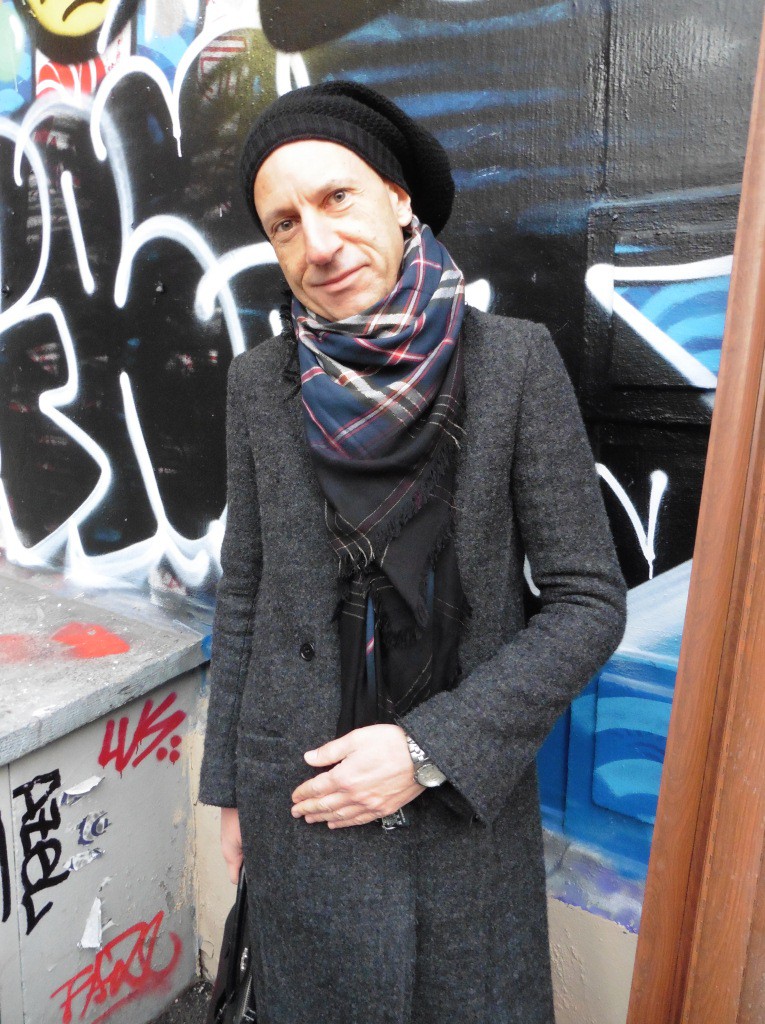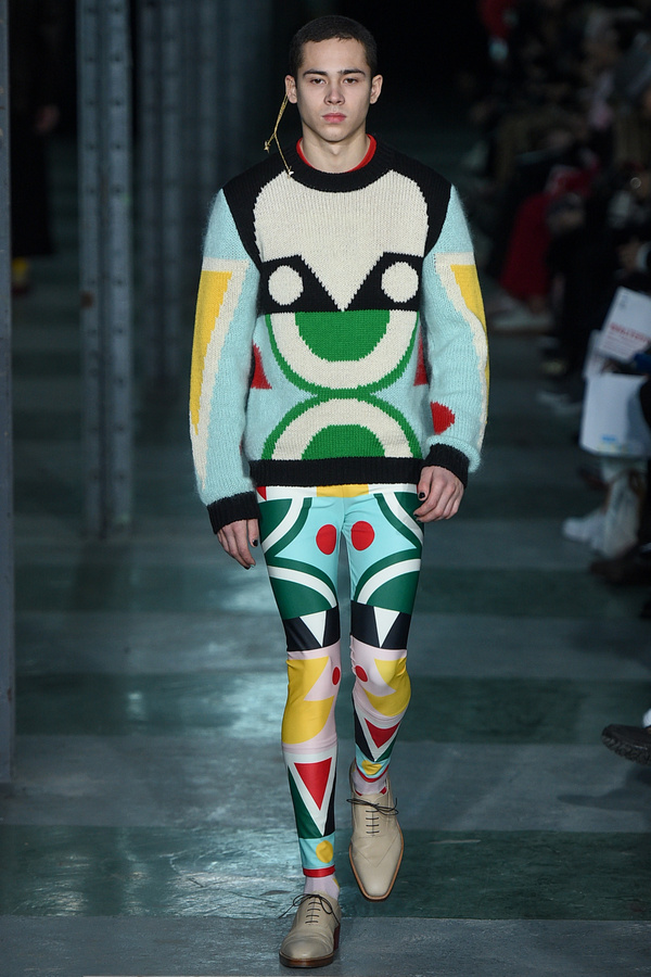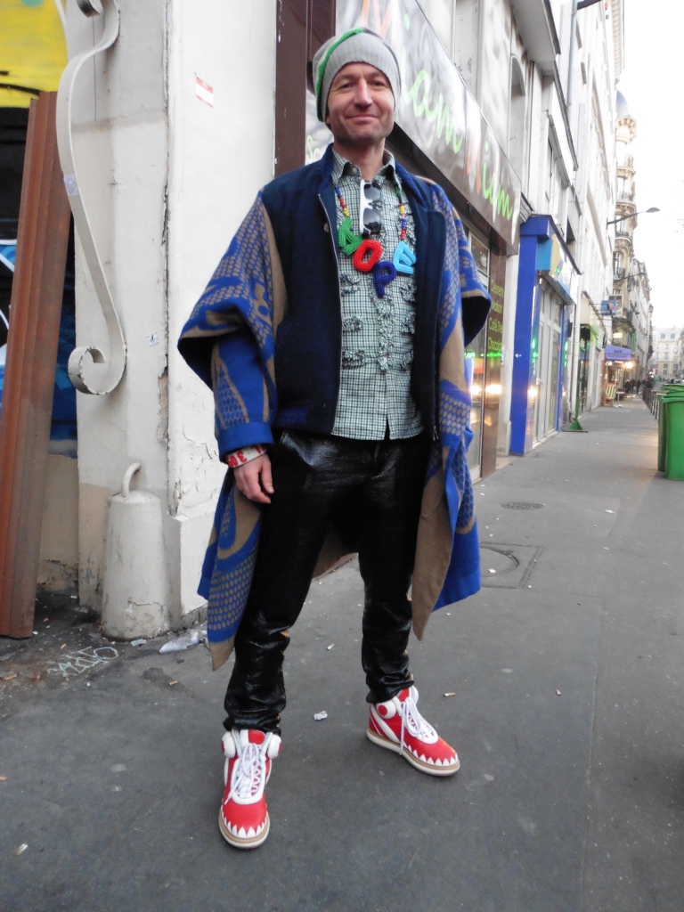 Défilé WALTER VAN BEIRENDONCK dans un immeuble en travaux du 10ème arrondissement: là encore une collection très créative, comme à l’habitude chez cet autre créateur belge de génie. Walter Van Beirendonck le pacifiste est cette fois-ci en colère après les événements de l’an dernier et a intitulé sa collection « Woest » (furieux, en flamand). Très colorée et aux accents tribaux, celle-ci mêle le rassurant et l’inquiétant, comme ces espèces de doudous qui s’accrochent aux vestes, ton sur ton, prenant des formes géométriques, d’animaux ou de mitraillettes: un mélange de douceur et d’agressivité, à l’image du monde d’aujourd’hui. Volumes amples; pantalons larges et évasés qui arrivent au-dessus des chevilles et laissent apparaître chaussettes colorées et chaussures basses à talons tout aussi colorées; manteaux en peau lainée effet vinyle. Accessoires décalés avec ces chaînes dorées recouvrant la tête des mannequins. Les hommes assument pleinement leur part de féminité avec leur vernis à ongles multicolores.