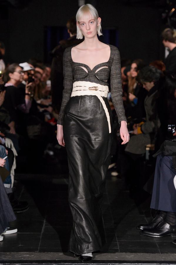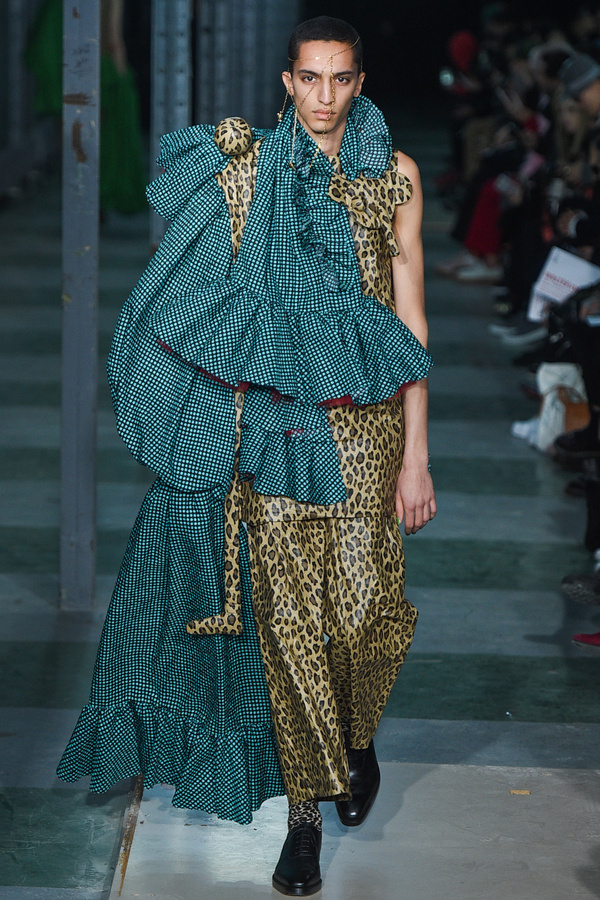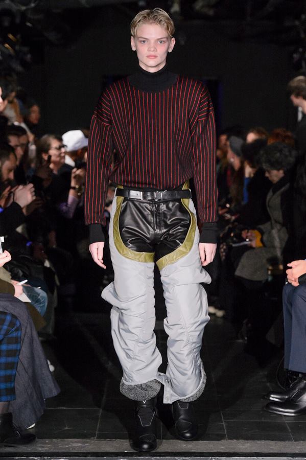 Défilé Y/PROJECT au Gibus: une collection pointue, inventive, explosive, dans laquelle le directeur artistique belge Glenn Martens joue avec un malin et savant plaisir avec les matières et les proportions. Chaque pièce de cette collection unisexe a son originalité: jeans extralongs avec des boutons à pression sur les côtés ou se finissant en pattes d’éléphant à soufflets, bombers volumineux recouverts de zips ou de multiples sangles, chemise transparente à roses brodées, robe longue en velours. La collection est sublimée par de subtils jeux de couleurs.