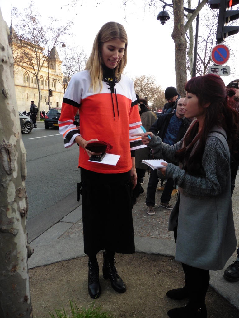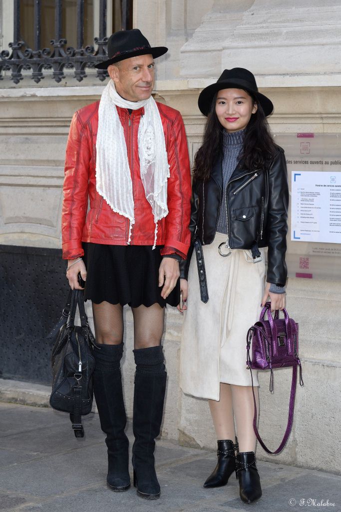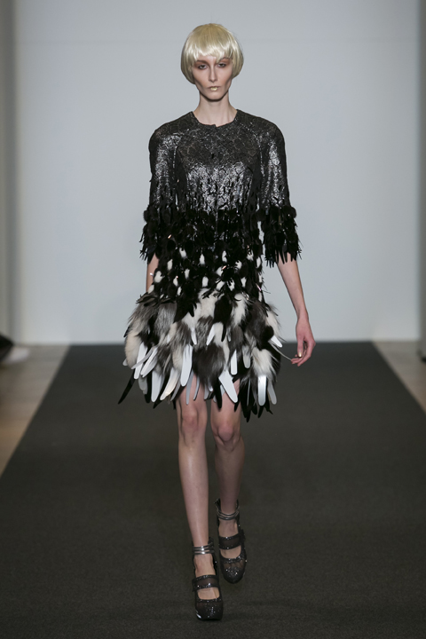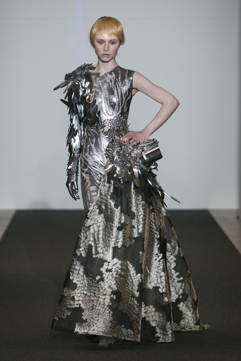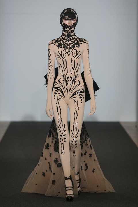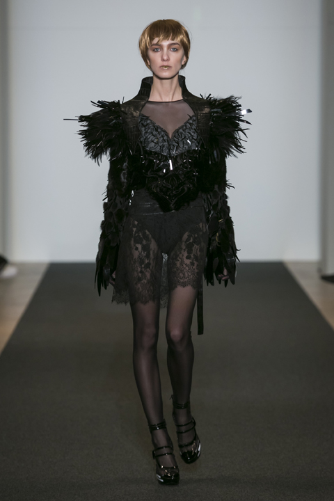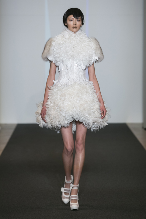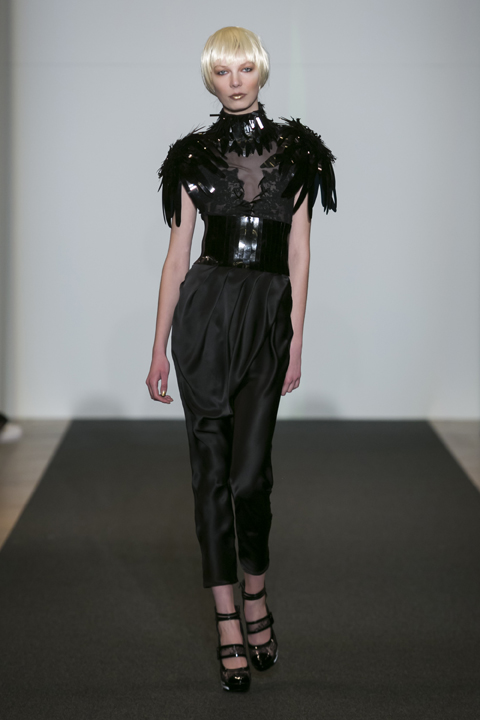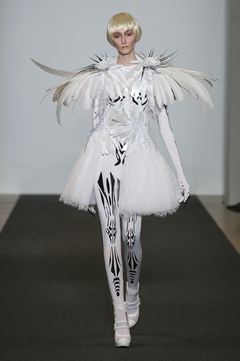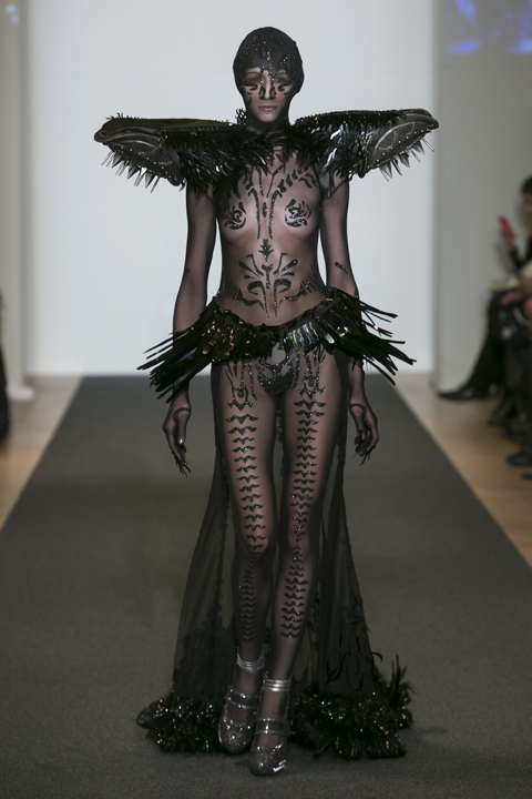Défilé ON AURA TOUT VU à la salle des fêtes de la Mairie du 4ème arrondissement: un défilé époustouflant sur le thème du « Jet lag », un état de flottement entre réalité et imaginaire généré par le décalage horaire dans lequel nous transportent les créateurs bulgares Livia Stoianova et Yassen Samouilov. Ici le décalé est une attitude, une manière de vivre, une philosophie. Les silhouettes sont interminables, futuristes, extravagantes. Les robes précieuses, longues ou ultra-courtes, jouent sur la transparence et sont dotées d’épaulettes de plumes ou de pétales de rhodoïd, façon cabaret parisien. Douceur de la soie, broderies et dentelles. Une partition en blanc, noir et or, sophistiquée et d’une intense sensualité. Des épaules aux volumes exacerbés servent de piste d’envol à des drones venant bourdonner dans le ciel du défilé et allant même jusqu’à soulever la traîne de la robe de mariée. La création portée à son summum!