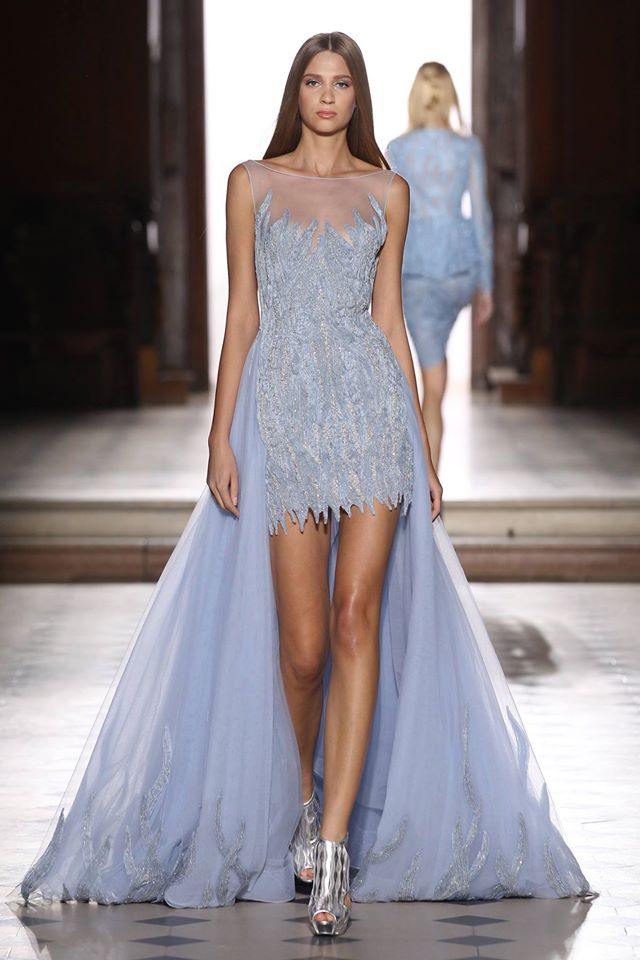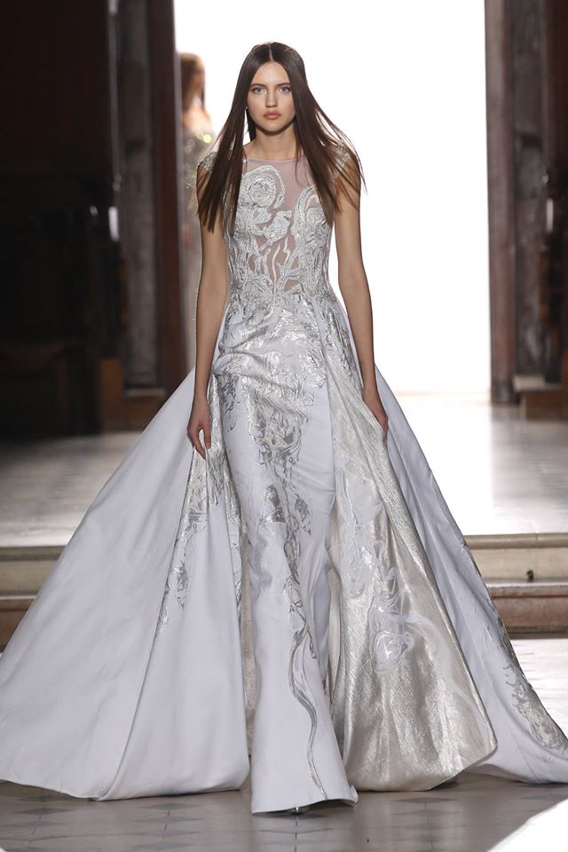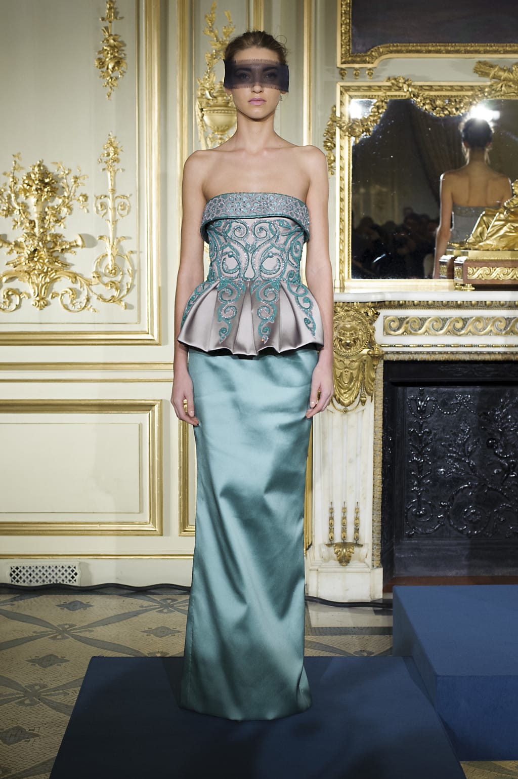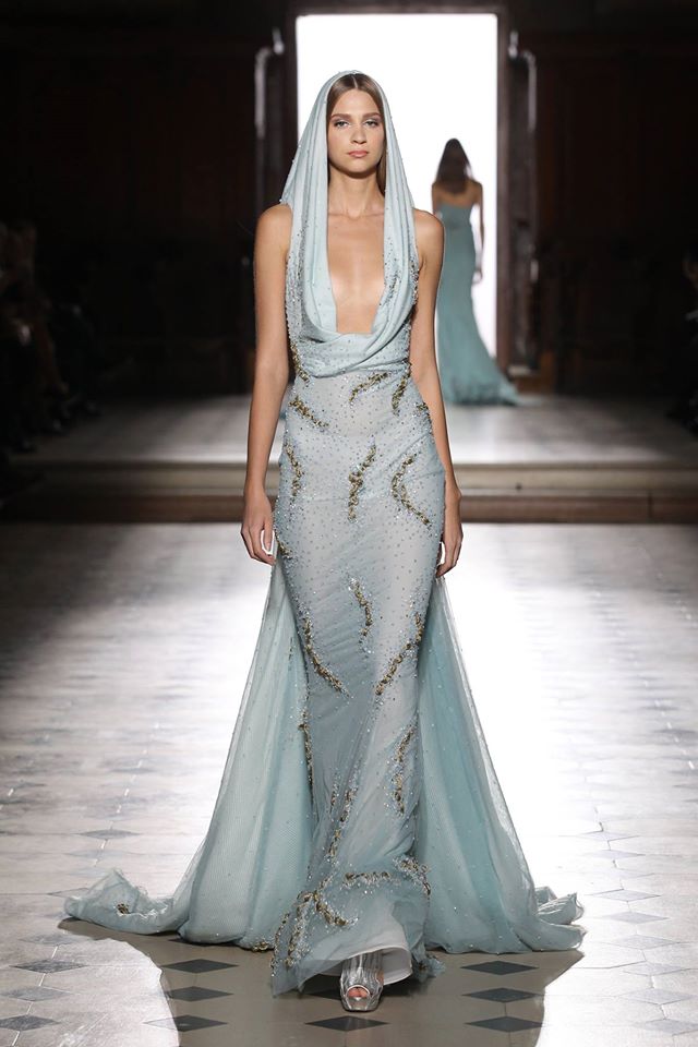 Présentation RAMI AL ALI à l’hôtel Le Meurice: le créateur et couturier d’origine syrienne a puisé dans deux cultures opposées et d’époques différentes pour en synthétiser les formes, les techniques et les arts. S’inspirant de l’art décoratif mauresque, il a combiné les références historiques avec les silhouettes inspirées des mascarades. Ce qui conduit à des créations volumineuses en couches de satin et brocart, dont l’assemblage donne naissance à des tulles surdimensionnés. Ces éléments structurés empruntés aux mascarades accentuent la silhouette féminine. Les jupes tulipes font référence aux années 1960, alors que les techniques ancestrales sont utilisées pour moderniser la broderie classique. Les tons or, taupe, corail et bleu royal apportent une vitalité toute actuelle à la collection. Superbe!