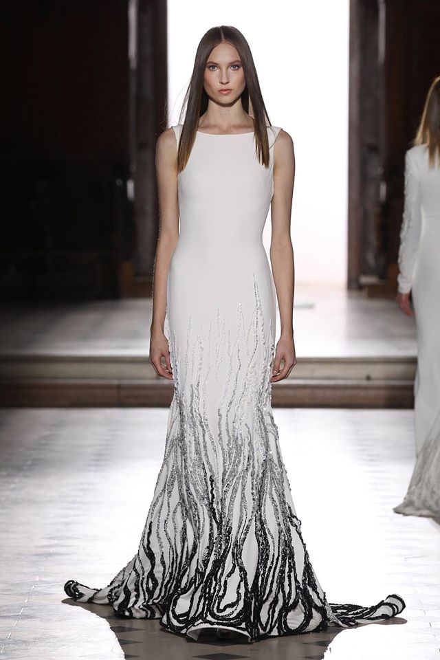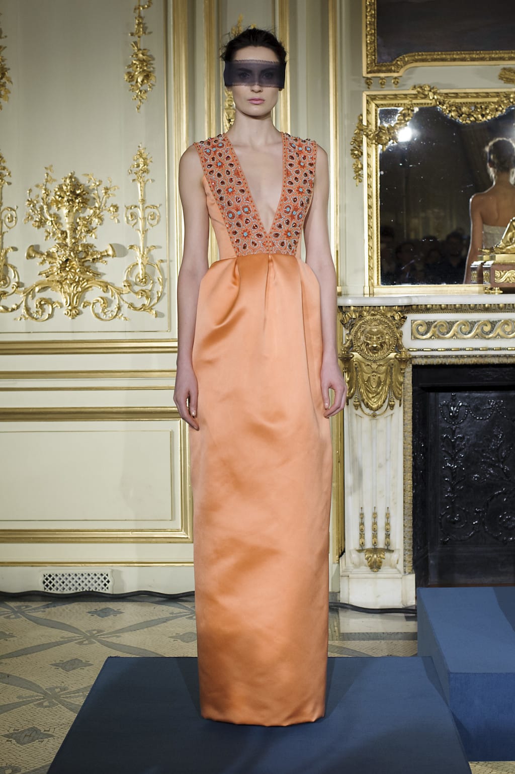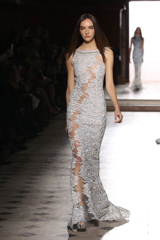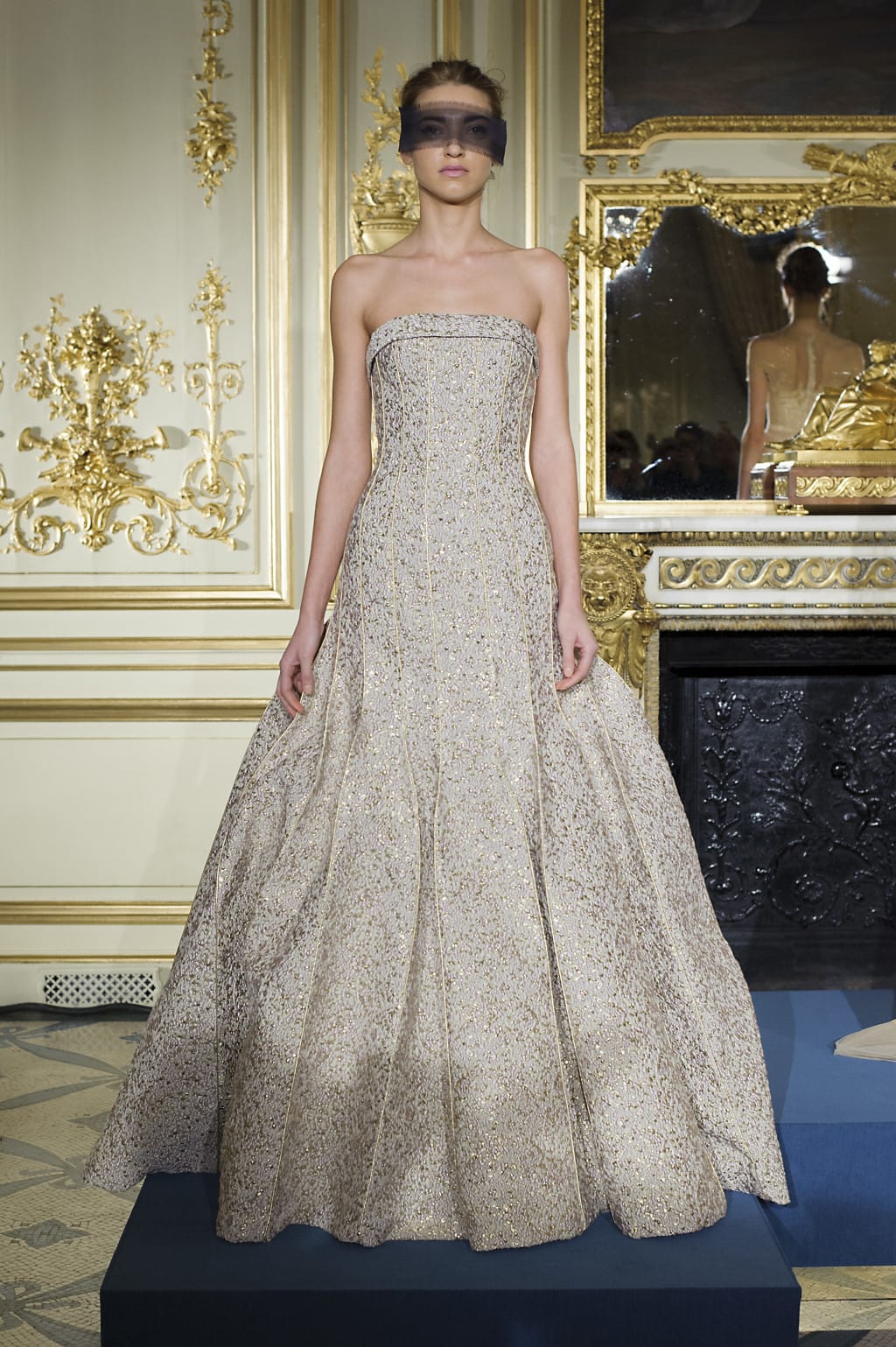 Présentation RAMI AL ALI à l’hôtel Le Meurice: le créateur et couturier d’origine syrienne a puisé dans deux cultures opposées et d’époques différentes pour en synthétiser les formes, les techniques et les arts. S’inspirant de l’art décoratif mauresque, il a combiné les références historiques avec les silhouettes inspirées des mascarades. Ce qui conduit à des créations volumineuses en couches de satin et brocart, dont l’assemblage donne naissance à des tulles surdimensionnés. Ces éléments structurés empruntés aux mascarades accentuent la silhouette féminine. Les jupes tulipes font référence aux années 1960, alors que les techniques ancestrales sont utilisées pour moderniser la broderie classique. Les tons or, taupe, corail et bleu royal apportent une vitalité toute actuelle à la collection. Superbe!