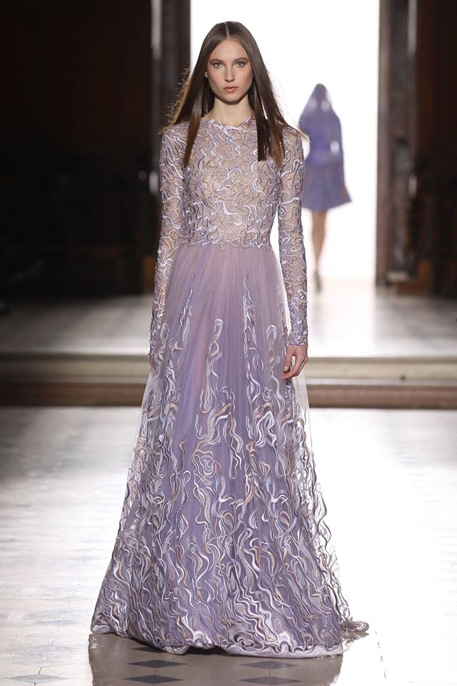 Défilé TONY WARD à l’Oratoire du Louvre: une collection inspirée par les mouvements de l’air et de la fumée, qui se traduit par une remarquable volatilité, servie par un travail de matières tout en délicatesse. Organza coupé en volants rebrodés de fils de soie, touches de lumières pailletées, centaines de mètres de tissus rebrodés à la main transmettant ces sensations vaporeuses et rayonnantes. Les couleurs sont aériennes et les superpositions conduisent à des silhouettes innovantes: les jacquards pastels bleus, gris, verts et lilas se démultiplient tout en légèreté dans des structures mouvantes en trois dimensions. Magnifique!