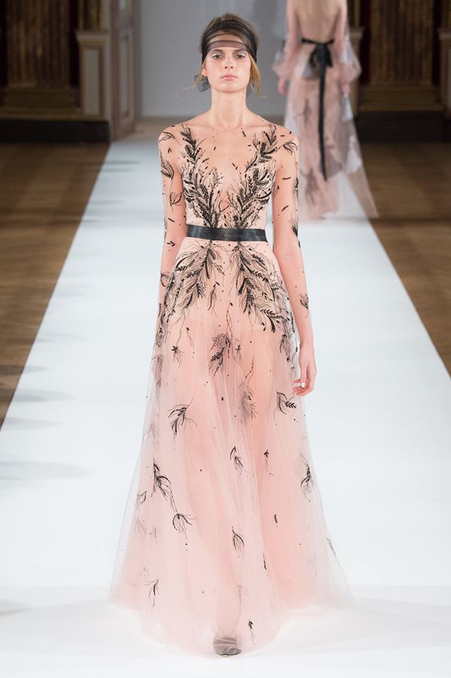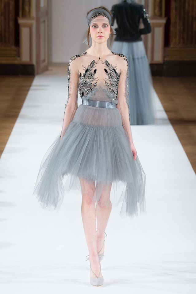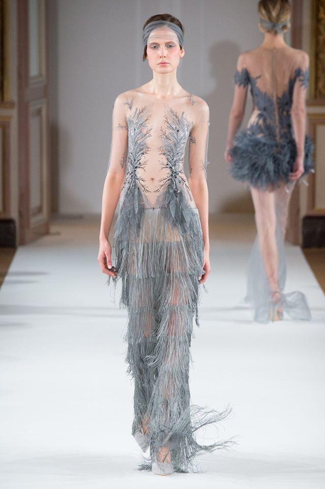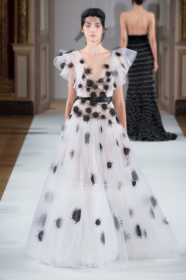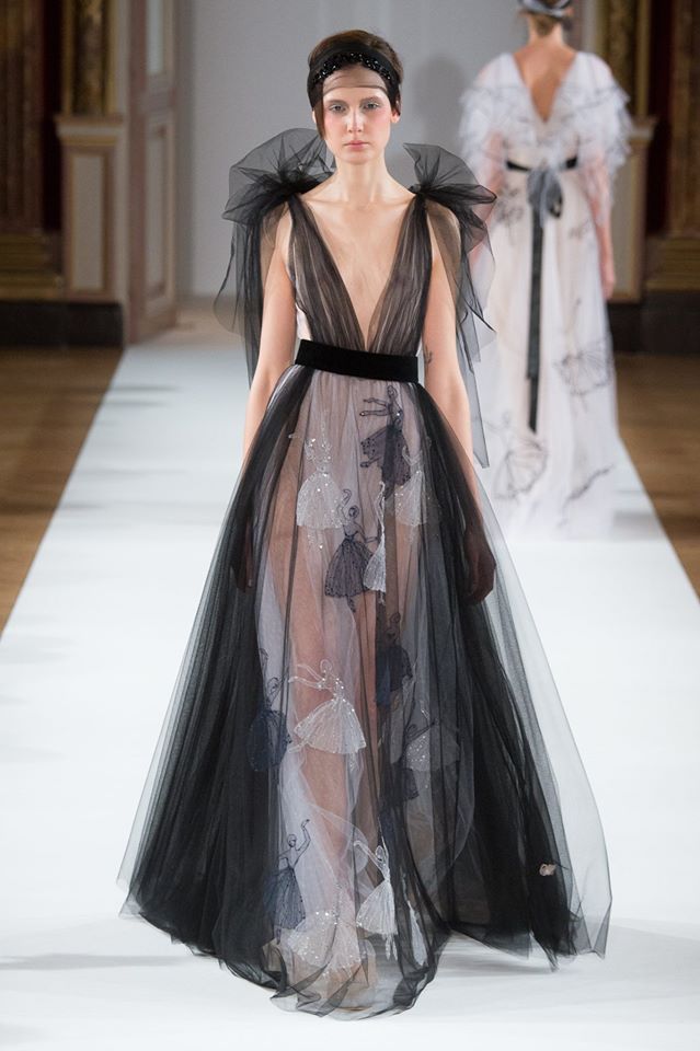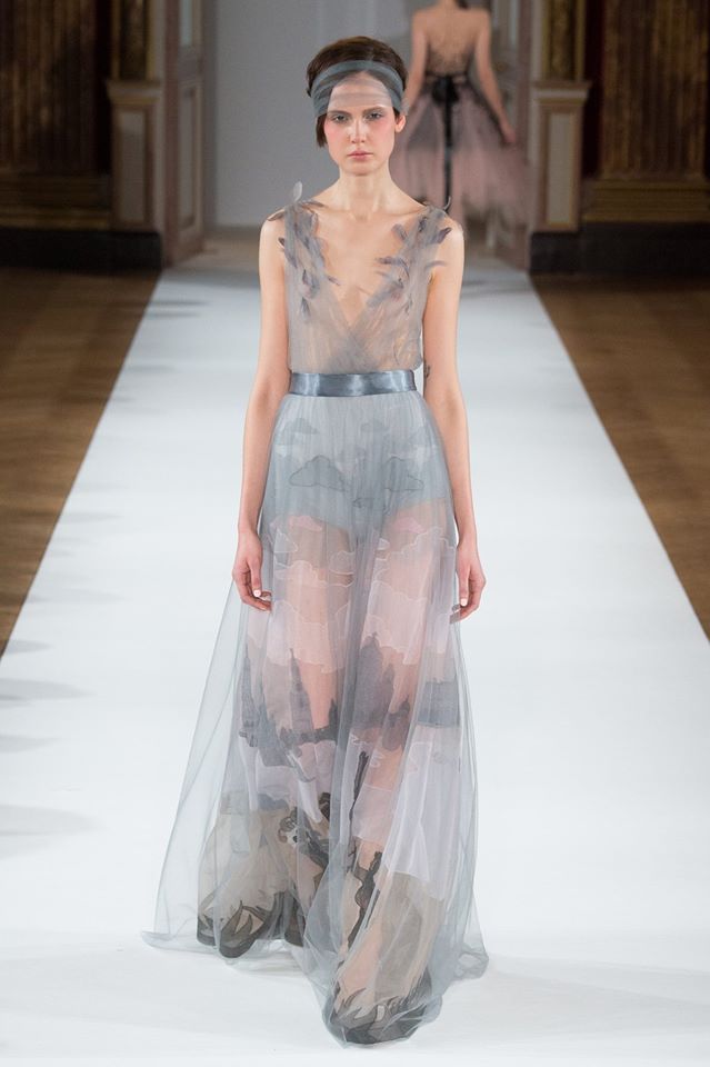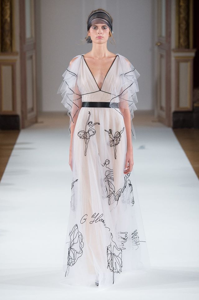 Défilé YANINA COUTURE à l’hôtel Westin: la créatrice russe nous raconte l’histoire d’une jeune fille rêveuse, romantique, dont le vestiaire est imprégné par sa passion pour le ballet. Les robes sont ainsi composées d’empilements de tulle à tutus, broderies, taffetas, voiles, velours. Telle un cygne la première silhouette nous présente une robe de plumes blanches avec un rubis écarlate à la place du coeur. Puis vient un cygne noir paré d’une délicate robe de plumes noires. La collection se décline ensuite dans un ensemble de robes raffinées et vaporeuses d’une grande légèreté, avec des mouvements de strates jouant sur la transparence, dans une riche palette de couleurs pastels allant du gris perle au rose poudré. Des chapeaux tout droit venus des années 1910, une grâce tout aristocratique: la collection est ancrée dans la modernité, mais elle contient de multiples références au passé et à la culture russe et française. Tout simplement somptueux!