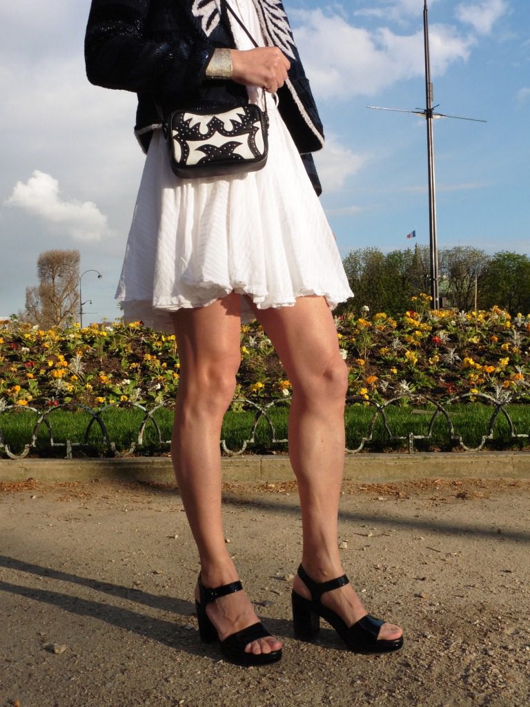 Le sequin illumine votre style et lui apporte une touche précieuse aux accents prepy. Robe en coton ultra-légère d’allure très romantique, veste en sequins brodée, mini sac patchwork de cuir clouté, casquette marin en jean, lunettes et chaîne, le tout Zadig&Voltaire collection printemps/été 2016; chaussures à talons en cuir verni What For (collection printemps/été 2016); bracelet Clara Jasmine (collection antérieure).
