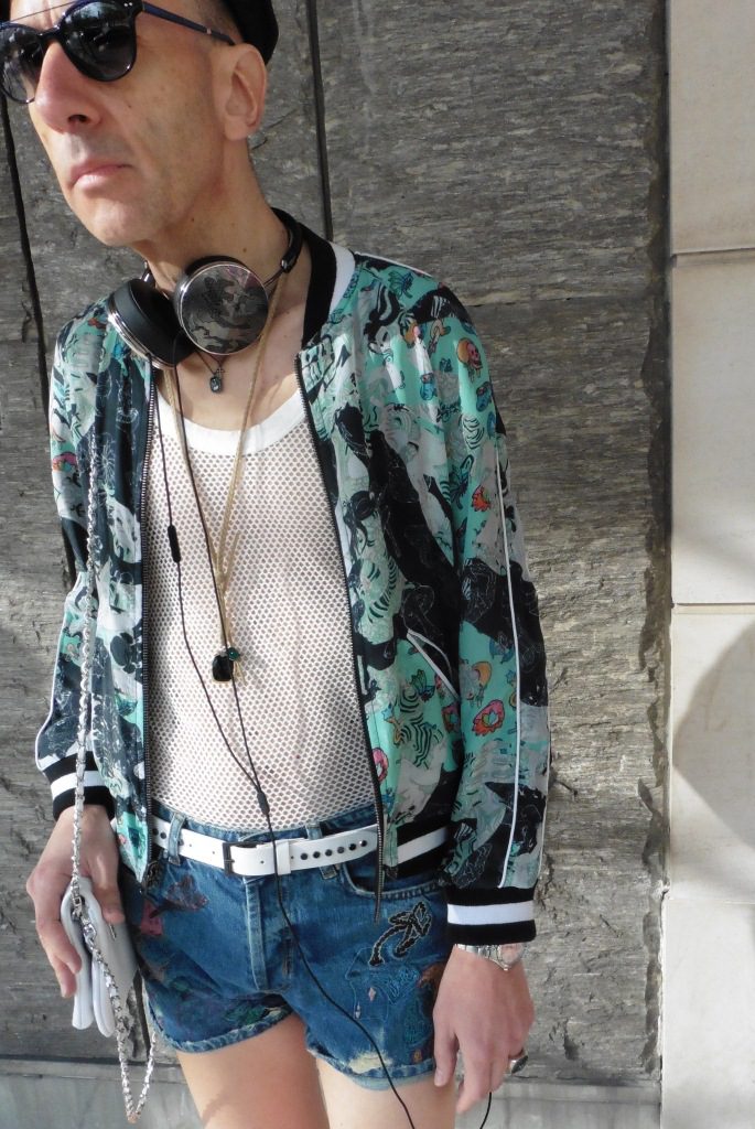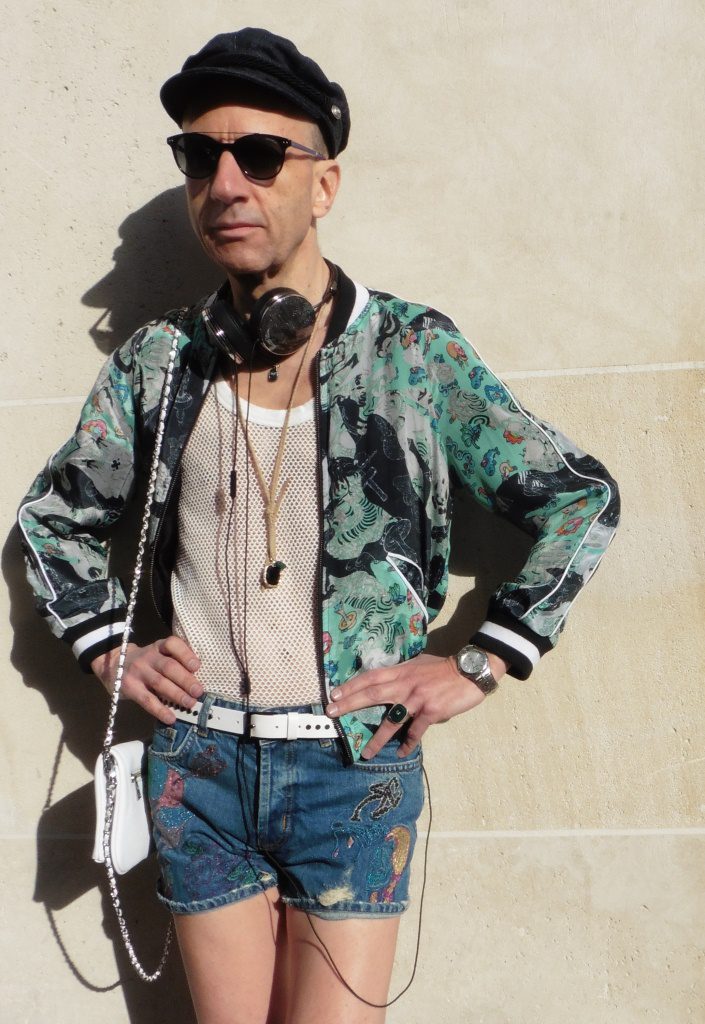 Parce que l’été va finir par arriver: une irrésistible envie de liberté, de fun, de coolitude et de couleur! Bomber réversible avec imprimés Tsukasa Ohtaké (artiste contemporain japonais), short en jean brodé (motifs Tsukasa Ohtaké également), top en maille filet, casquette marin en jean, ceinture blanche en cuir, mini sac blanc également en cuir, colliers, bague, lunettes, casque audio: le tout Zadig&Voltaire collection printemps/été 2016; chaussures à talons cloutées: What For (collection printemps/été 2016).