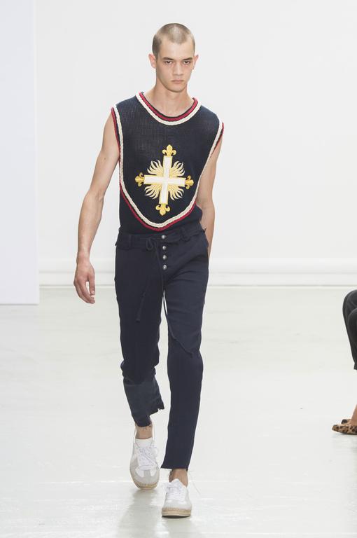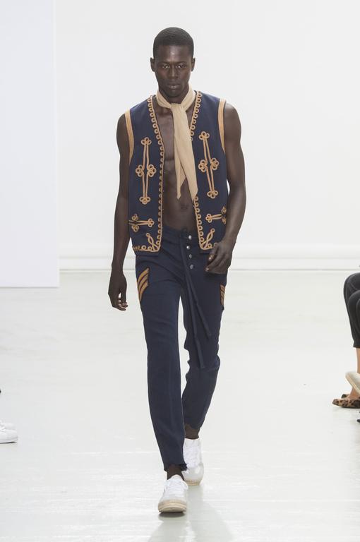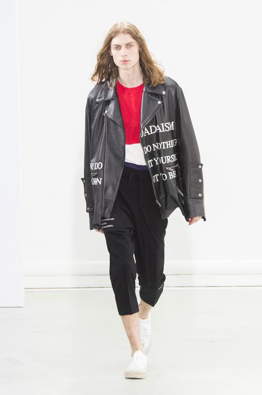 DEFILE CHRISTIAN DADA AU PALAIS DE TOKYO: Masanori Morikawa, le designer et fondateur de cette marque underground japonaise, a présenté une nouvelle collection à l’esprit rebelle, avec des inspirations punk et militaires, non sans un certain romantisme. Noir et kaki dominants, avec par-ci par-là des petites touches de couleurs vives. Les volumes sont généralement amples (pantalons, manteaux, vestes). Certains hauts sont comme des tuniques. L’âme de la collection est dans les détails: cou orné de toutes sortes de foulards, colliers ou ras-du-cou; vestes brodées de perles; rayures; slogans et messages subversifs inscrits sur les vêtements, avec au passage quelques fautes d’anglais (« burn this clothe after you have wear it », « don’t make any noise », « unloveable »,…)