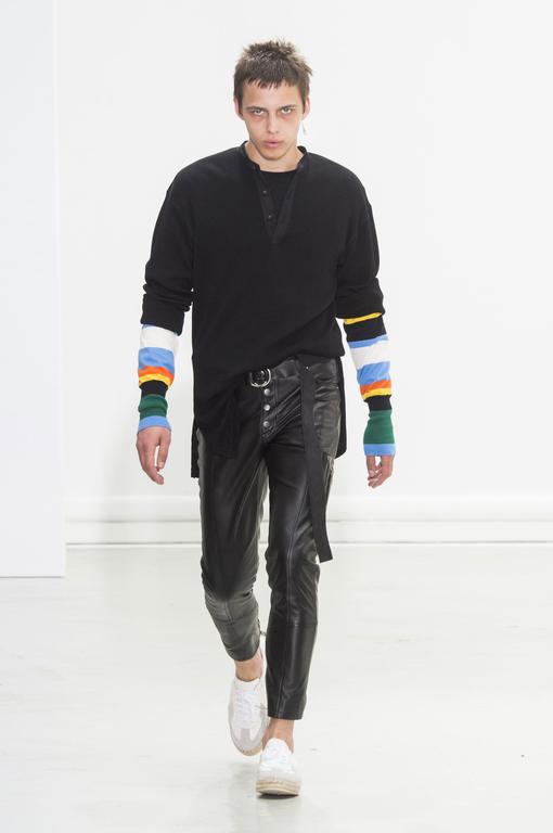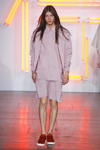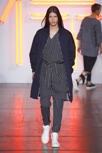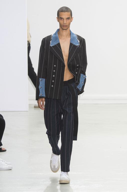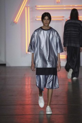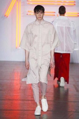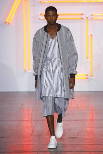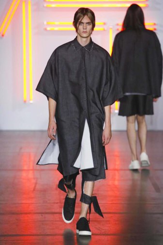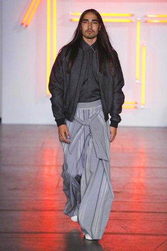 DEFILE HUGO COSTA A LA MAISON DES METALLOS: pour son premier défilé à Paris, le créateur portugais a présenté une collection intitulée « Samouraï », puisant son inspiration dans le Japon féodal et le bushido, code des principes moraux que les samouraïs japonais devaient observer, un code strict qui exigeait loyauté et honneur jusqu’à la mort. La collection est ainsi une réinterprétation moderne des tenues traditionnelles japonaises. Silhouettes extravagantes, superpositions, grands volumes se combinent avec des profils plus fuselés. Les pantalons traditionnels de style hakama sont revisités et portés avec des vestes à capuche oversize ou de type bombers. La palette de couleurs va du noir et blanc au rouge et rose pâle, en passant par du gris clair avec rayures ou métallisé. Une grande élégance ressort de l’ensemble.