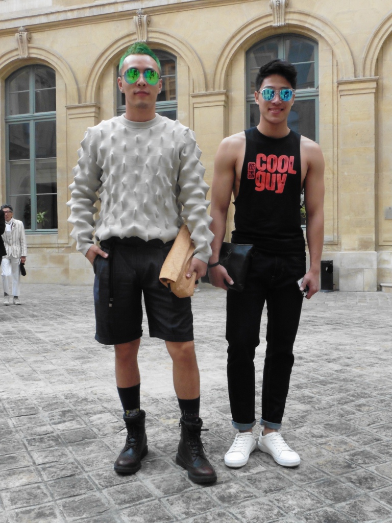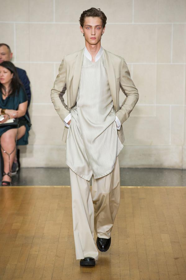 DEFILE SEAN SUEN A L’HOTEL D’EVREUX (PLACE VENDOME): pour son premier défilé à Paris, le créateur chinois a proposé une collection qui se veut une symbiose entre l’orient et l’occident, dans laquelle il déconstruit et reconstruit les coutures traditionnelles. Il joue de façon très pertinente avec les volumes et oppose les matières et les couleurs. Les manteaux-peignoirs en soie sont remarquables, le look pyjama à rayures et les bermudas volumineux ont un charme certain. Beaucoup de fluidité. L’ensemble est d’un grand chic!