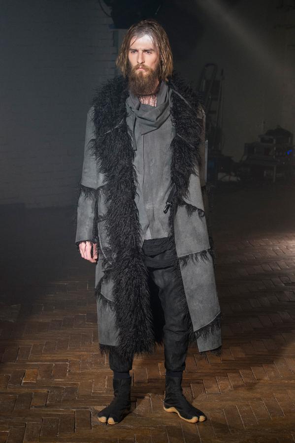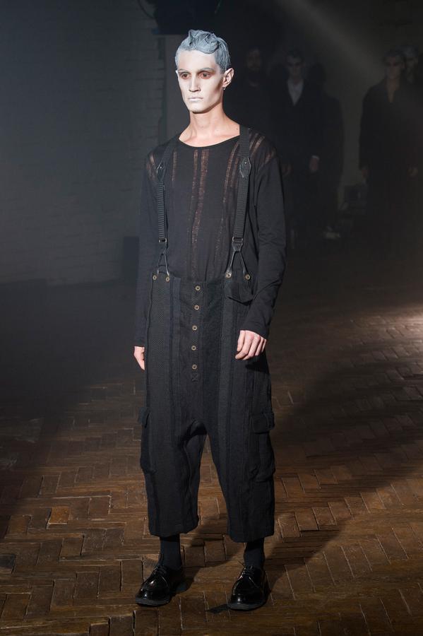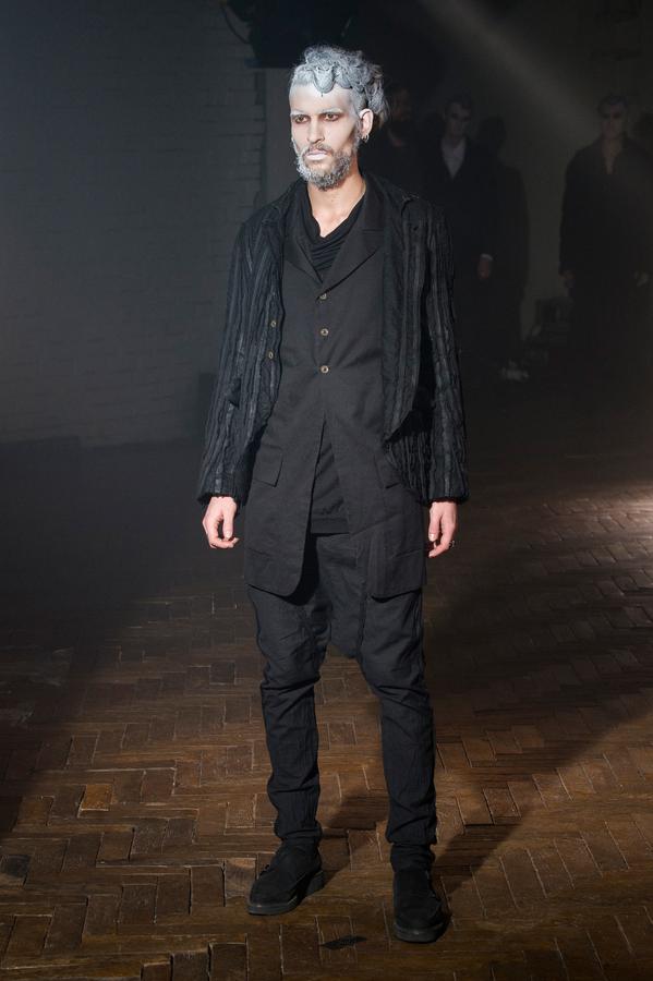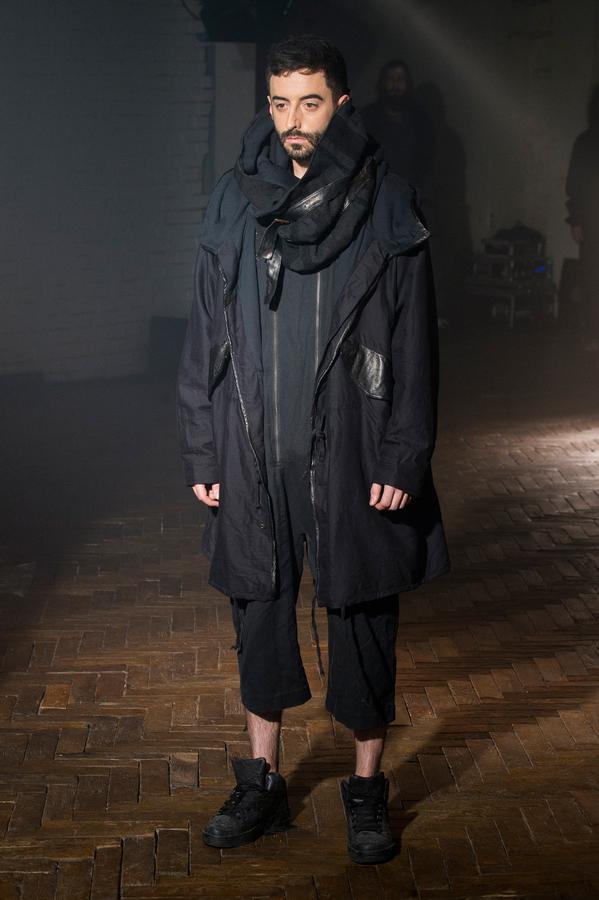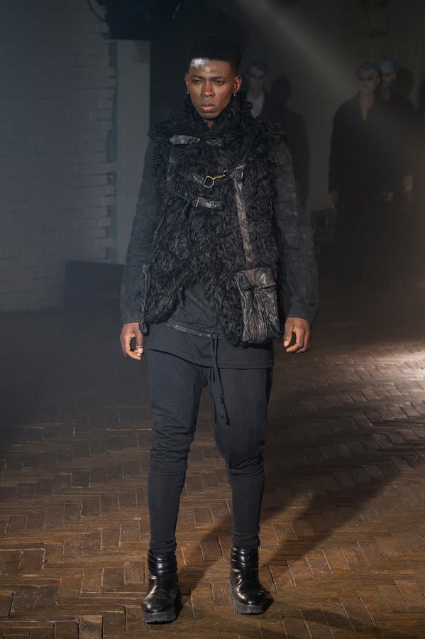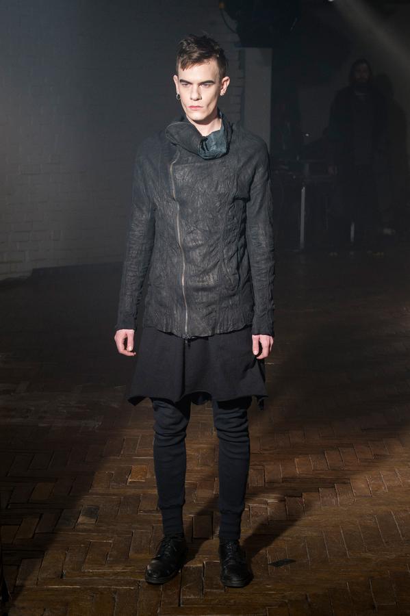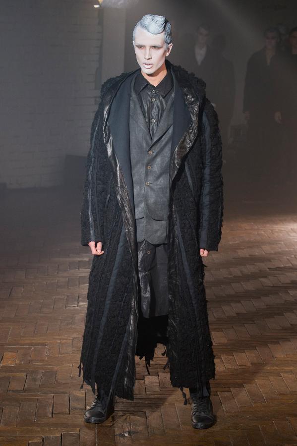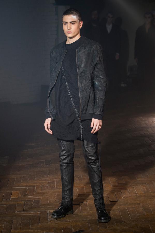 DEFILE SANDRINE PHILIPPE AU GYMNASE TREVISE: Comme à son habitude la créatrice française a présenté sa nouvelle collection intitulée « Portrait de famille » au travers d’une performance détonante, mêlant mode et art. Trois grandes familles jalouses de leur liberté et de leur identité qu’elles entendent défendre contre vents et marées sont mises en scène au sein d’un mystérieux concile. D’un côté, les dandys, sortes de photographies anciennes aux costumes impeccables, mais d’aspect vieilli, abîmé par les ans. Ensuite, les baroudeurs, toujours prêts à en découdre dans leurs grands cuirs et leurs joggings fuselés. Enfin les « animaux », semblant arriver de nulle part, avec leurs immenses peignoirs de fourrure rayés et leurs cuirs reptiliens seconde peau tout froissés. Comme toujours, noir et gris sont dominants, mais avec un jeu subtil sur les matières et les superpositions qui confère à la marque sa forte identité toute en sensibilité.