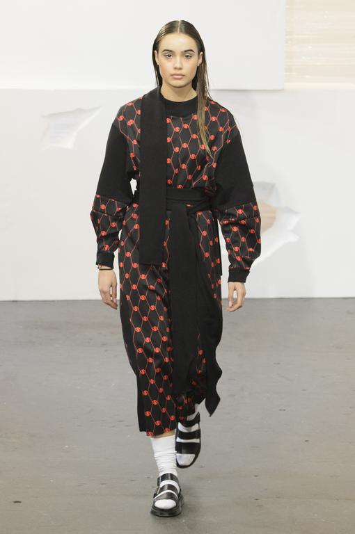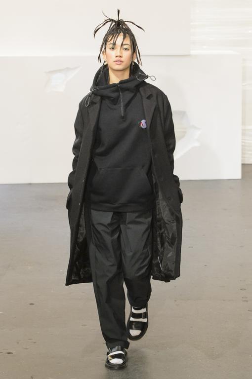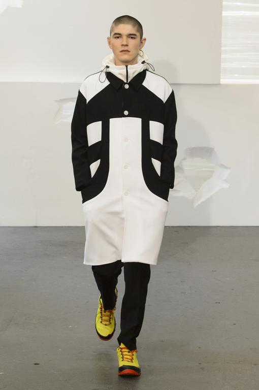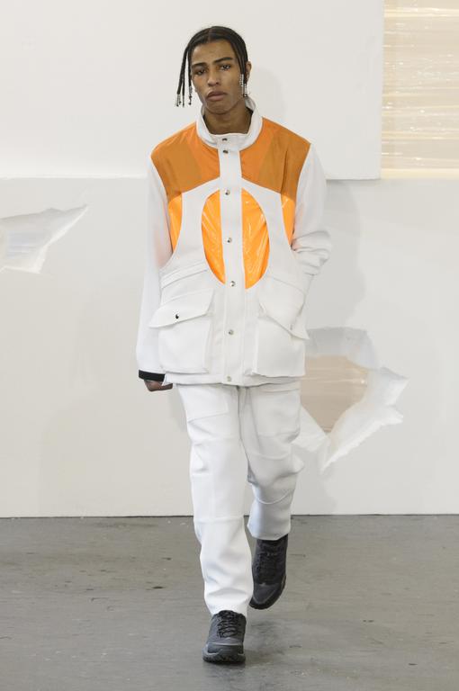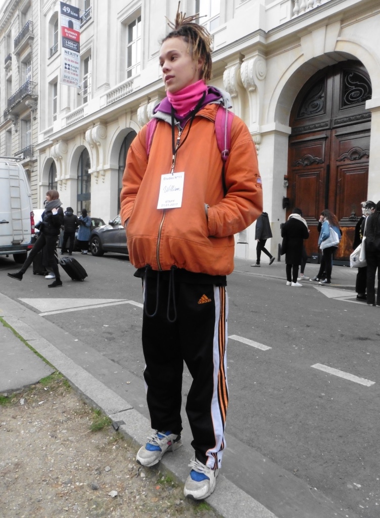 DEFILE AVOC A L’ESPACE KILIWATCH: Le duo de créateurs Laura Do et Bastien Laurent a présenté une collection unisexe et minimaliste inspirée tout à la fois des vêtements d’enfants, des uniformes de travail et des tenues de prison. Les matières sont techniques, les silhouettes amples, en total look monocolore orange, blanc ou noir, ou alors avec des imprimés graphiques bicolores avec des combinaisons de couleurs originales comme le vert pâle et le blanc. Une mode très actuelle et facile à porter.