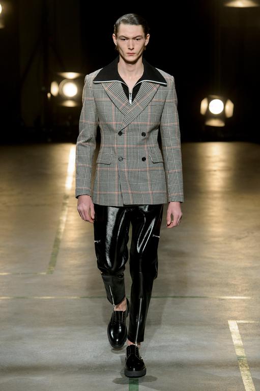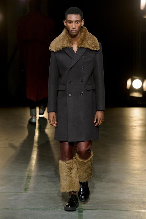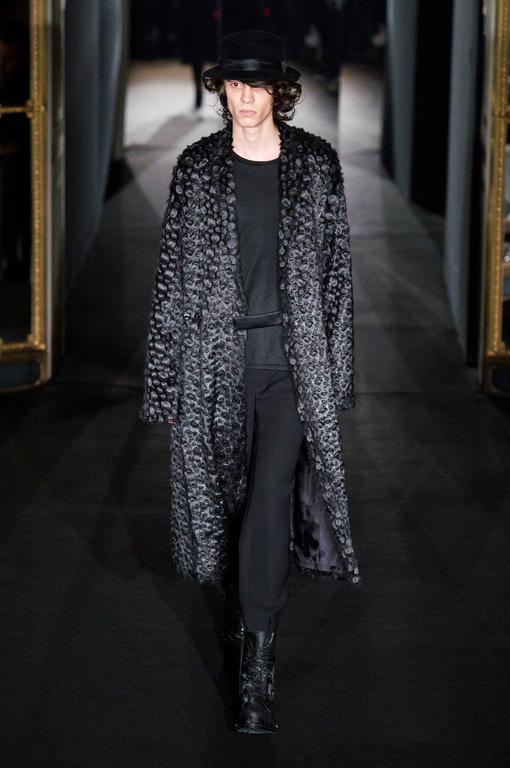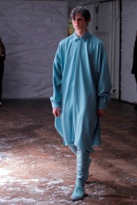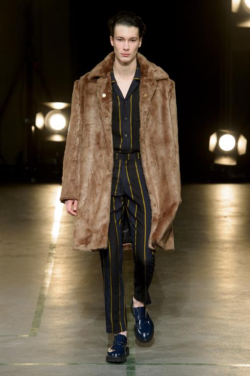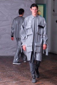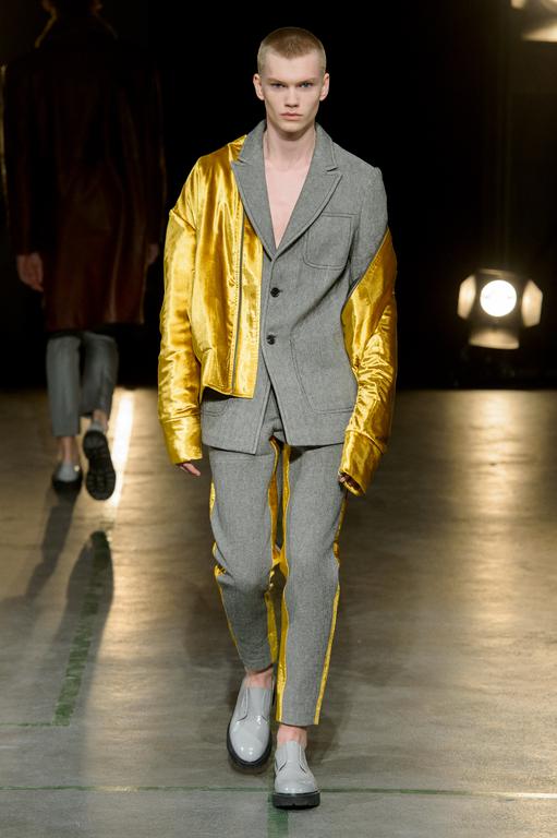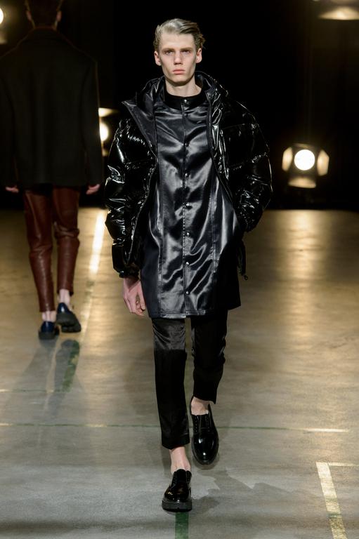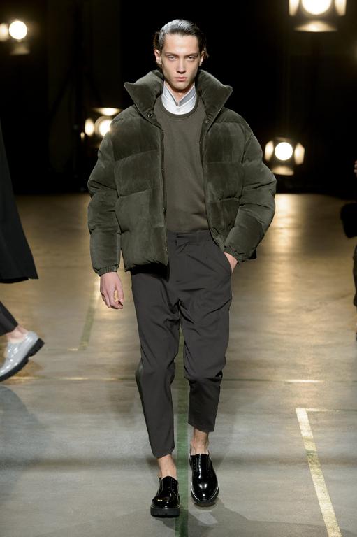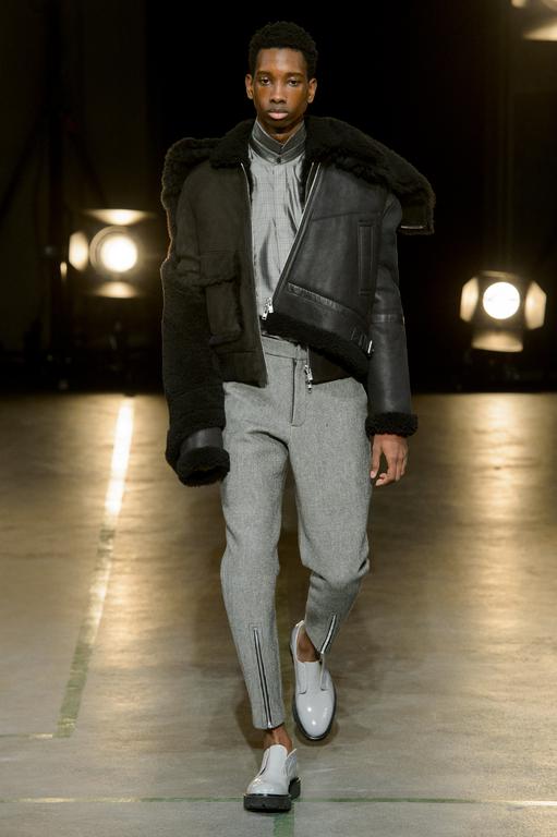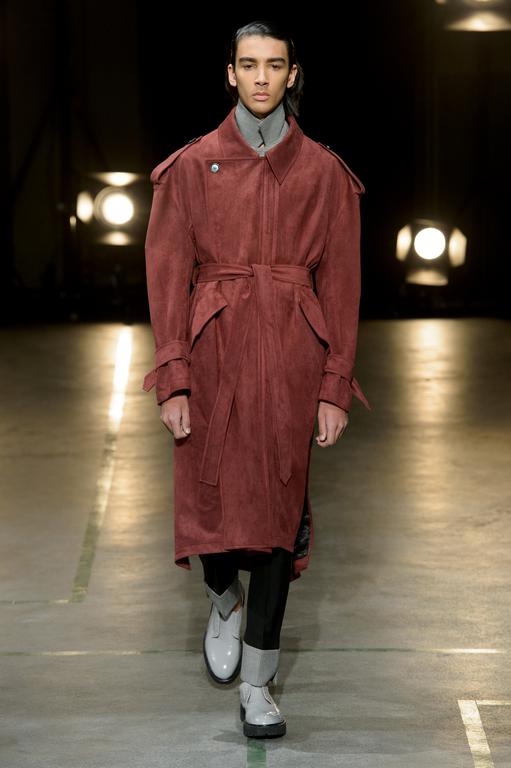 DEFILE SEAN SUEN AU YOYO CLUB (PALAIS DE TOKYO): Pour cette seconde collection présentée à Paris, le créateur chinois a cherché à réinterpréter en version contemporaine le classicisme des générations précédentes. Ceci se traduit par une profusion de manteaux, trenchs, doudounes, vestes et autres bombers aux formes variées qui parfois se superposent. Le pull camionneur, avec son col montant et zippé, et les vestes ou bombers en velours font leur réapparition. Outre le velours, le cuir, la fourrure (en manteau ou en col), le cachemire sont à l’honneur. Tailles généralement oversize. Les couleurs sombres et chaudes sont de rigueur. Un mélange astucieux de minimalisme et d’élégance raffinée.