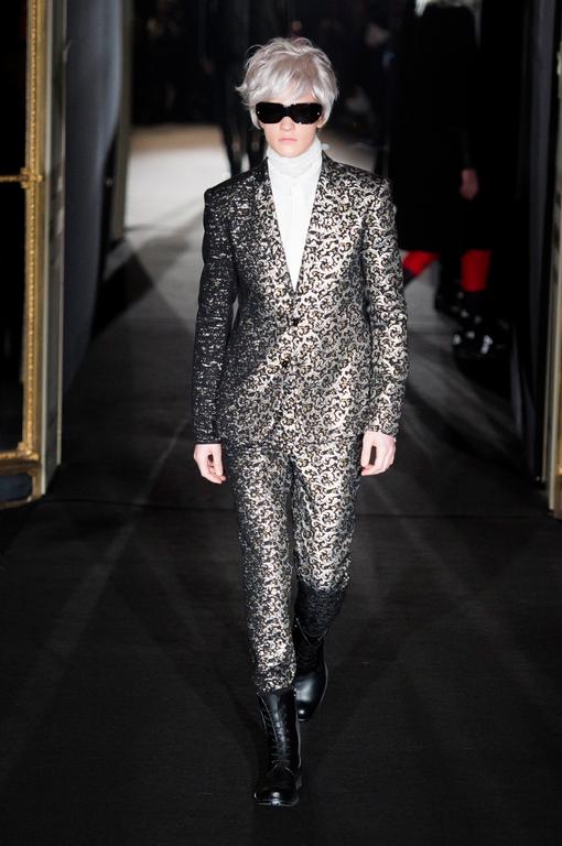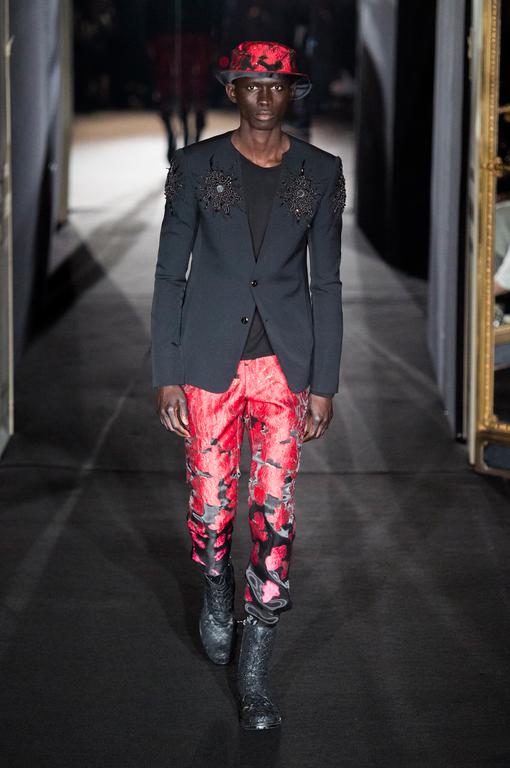 DEFILE RYNSHU A L’HOTEL MEURICE: Cette nouvelle collection sur le thème de la modernité à la japonaise s’inspire du kimono classique « Tomesodé ». Grâce à un ingénieux système de boutons alignés à l’horizontale, les pièces peuvent être portées près du corps ou de façon plus ample. Comme pour un kimono traditionnel, les manches Tomesodé servent de poches. Les bottes sont l’une des expressions du modernisme à la japonaise, en jacquard de soie traditionnellement utilisé pour les ceintures de kimono. Le noir joue sur les effets d’optique et se décline en matières variées nées du tissage de quatre matières, en broderies de motifs ovales comme des petits galets, en broderies de fleur de coton sur des drapés de laine ou en Swarovski noirs. Les fleurs apparaissent en relief comme des bijoux sur la gabardine noire ou les paillettes. Les silhouettes sont finalisées avec des chapeaux moins hauts que des chapeaux traditionnels, ainsi qu’avec des lunettes à réalité augmentée. Un style couture unisexe toujours aussi désirable!