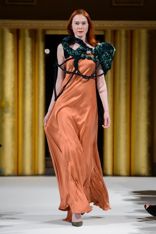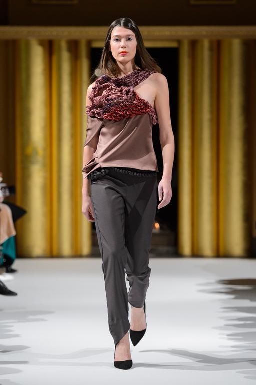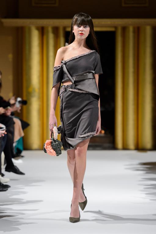 DEFILE PATUNA A L’HOTEL NORMANDY: Pour cette nouvelle collection intitulée « All about Eve » la créatrice d’origine géorgienne a trouvé son inspiration à la suite d’une visite au château de Versailles. Lui est ainsi venue l’idée de décliner chaque tenue en fonction d’une pièce du château, en particulier au niveau des couleurs. Le choix du fil unique, crocheté par Patuna elle-même pour chaque tenue, est ainsi le lien invisible symbolisant la distance entre Paris et Tbilissi. Ceci se traduit par une collection en satin de soie et velours d’été d’une grande variété et aux couleurs chaleureuses, pour une femme de pouvoir en mouvement perpétuel.