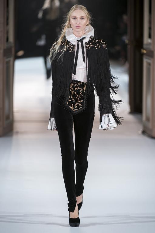 DEFILE YANINA COUTURE A L’HOTEL WESTIN: Cette collection met en scène une histoire d’amour entre une ballerine russe et un matador espagnol, comme une synthèse entre les cultures russe et espagnole. Splendeur du costume du matador avec les noirs et les blancs, couleurs formelles et masculines. Vestes courtes et boléros, richement brodés de dentelles, pierreries et leurs applications en soie. Les contours du costume du matador apparaissent dans une robe qui semble peinte sur le corps avec de fines lignes de dentelles, perles et sequins. Les robes en mousseline de soie évoquent le soleil du sud et les danseuses de flamenco passionnées avec leurs jupes à volants virevoltantes. Les robes transparentes ultra légères et composées d’innombrables superpositions laissent deviner une héroïne russe rêveuse et passionnée de danse et de poésie. Les contrastes de noirs et de rouges incarnent la passion et l’amour. Le défilé se termine par une robe de mariée espagnole de conte de fées.