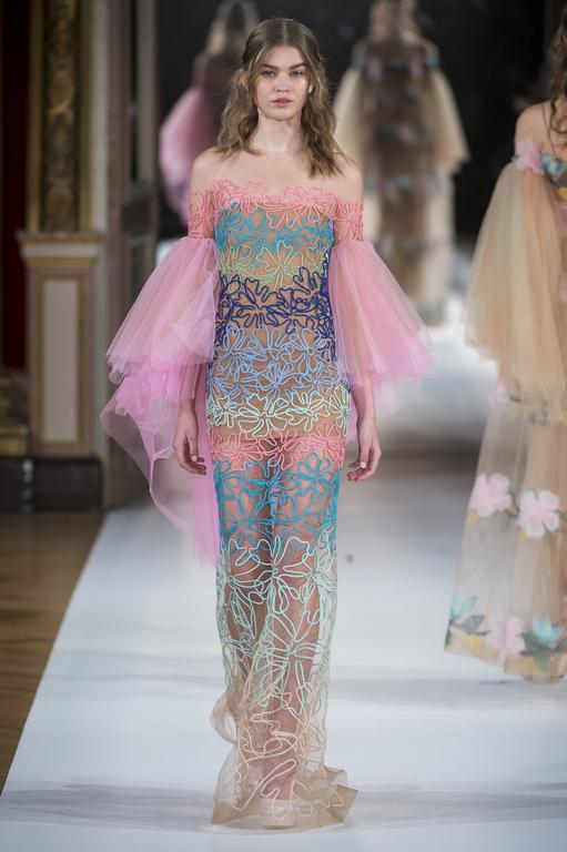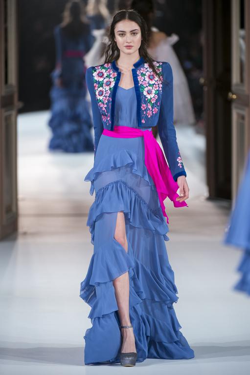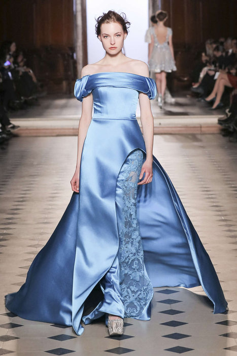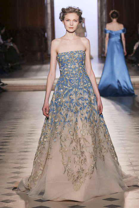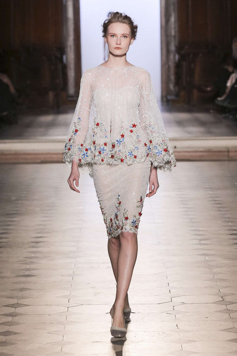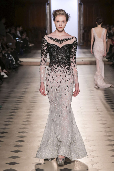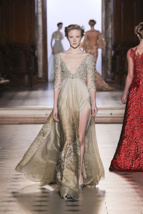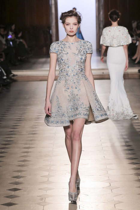 DEFILE TONY WARD A L’ORATOIRE DU LOUVRE: Pour sa nouvelle collection le couturier libanais s’est inspiré de la grande impératrice byzantine et femme de lettres, Eudocie, femme engagée, audacieuse et moderne. La mode byzantine est ainsi repensée et les mosaïques traditionnelles modernisées. Les coupes majestueuses sont douces, avec un jeu de transparences et de coutures modernes. Les modèles traditionnels sont réinventés; la dentelle et la soie se parent de cristaux et de pierres précieuses brodées. La splendeur de l’ère byzantine est traduite par une riche palette de couleurs: rouge éclatant, bleu byzantin, doré, argent, noir, blanc, rose clair et bleu gris.