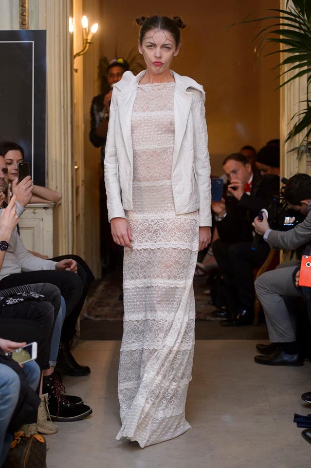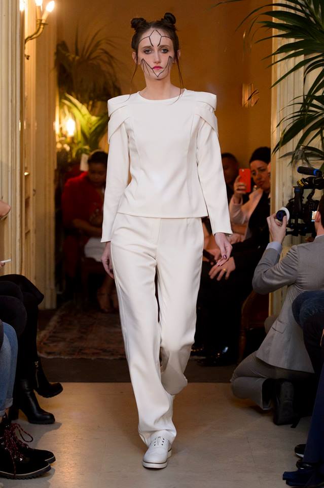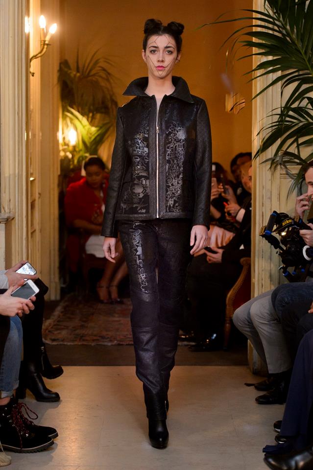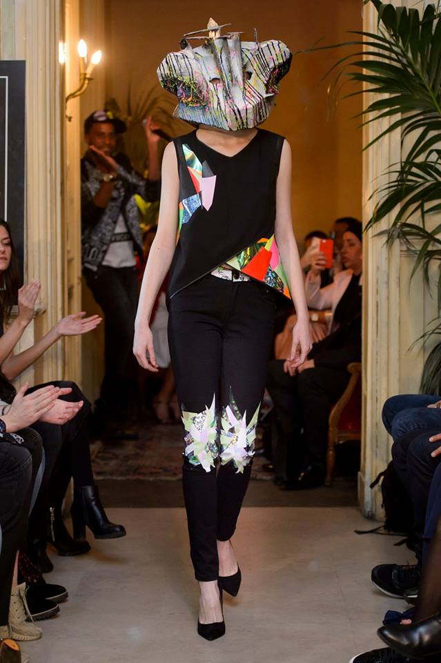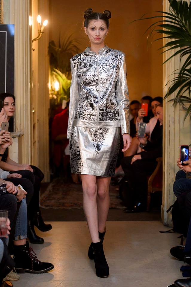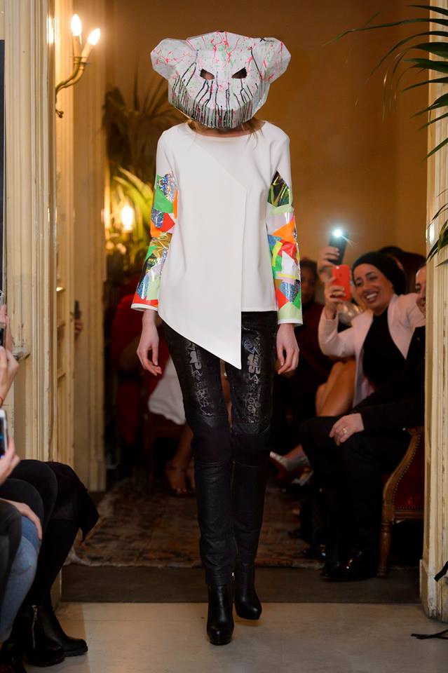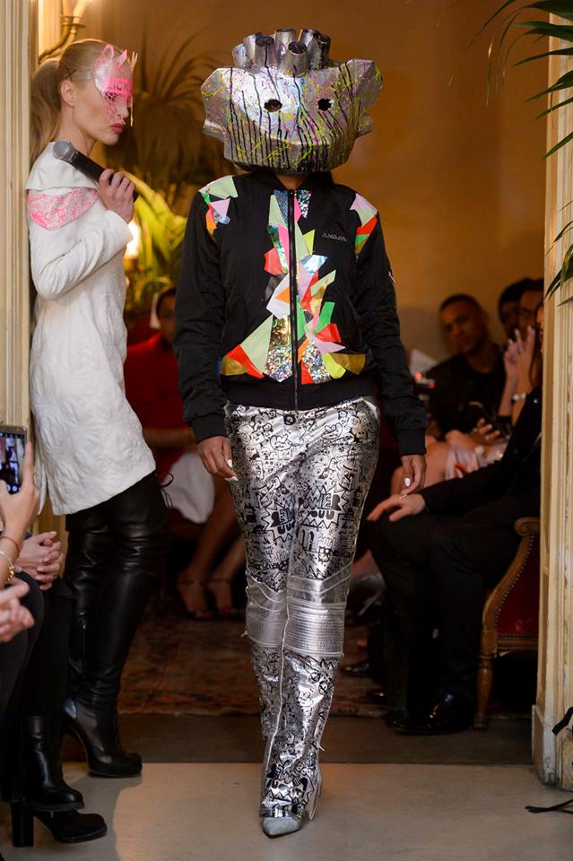 DEFILE MAISON ANOUFA AU CLUB « LE CARMEN »: Une collection intitulée « When Art Meets Fashion », inspirée par le côté artiste du jeune créateur Ylan Anoufa, qui est également peintre et sculpteur. En toile de fond son objet fétiche, un ours en peluche qui symbolise l’innocence de l’enfance, le rêve et l’espérance. D’où une collection entre présent et futur, à l’esprit glam-rock, mêlant silhouettes sculpturales, imprimés géométriques et dessins pop-art. Le noir et blanc graphique se combine avec des teintes brillantes et des couleurs expérimentales, fluorescentes, représentant l’amour, le bonheur, le futur. Les matières sont également combinées avec audace: cuir, soie, denim, broderies. Une rêverie moderne toute en sensibilité et délicatesse.